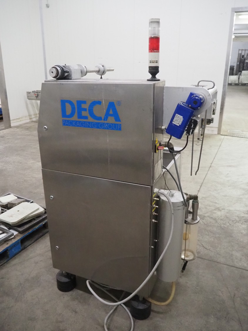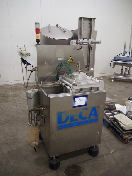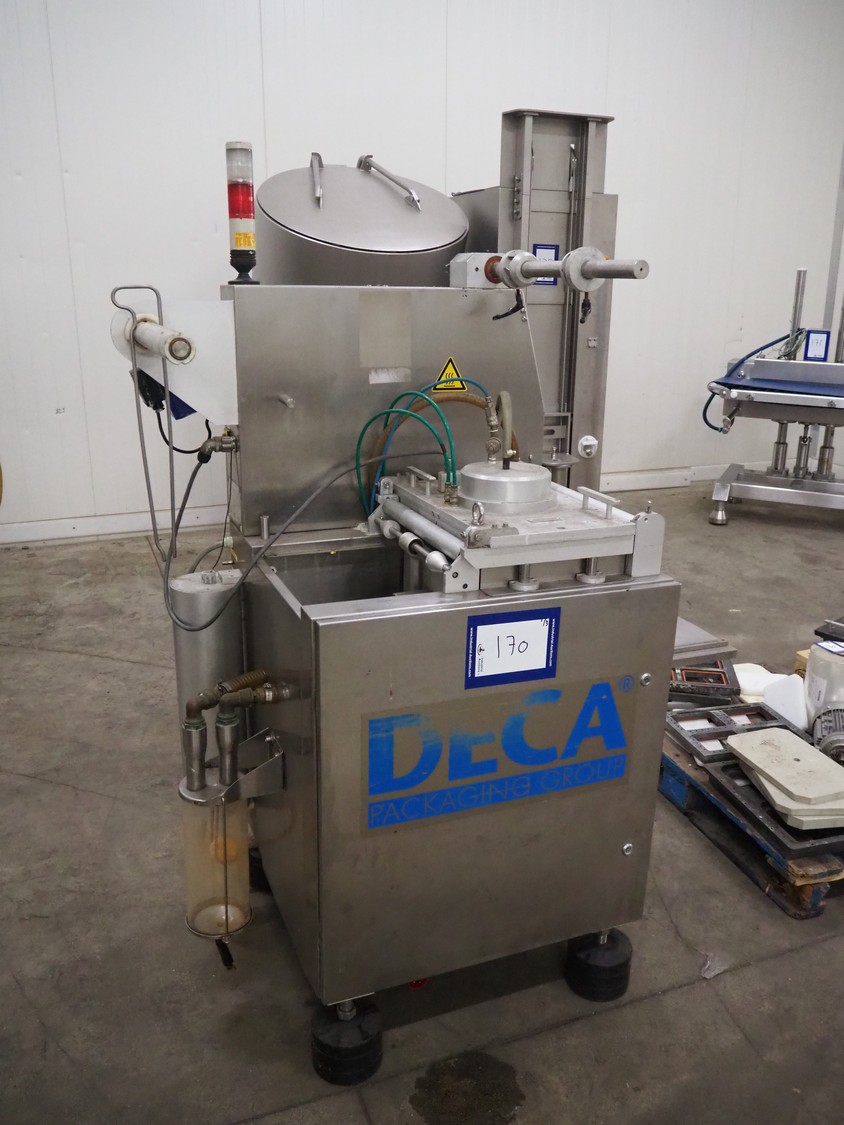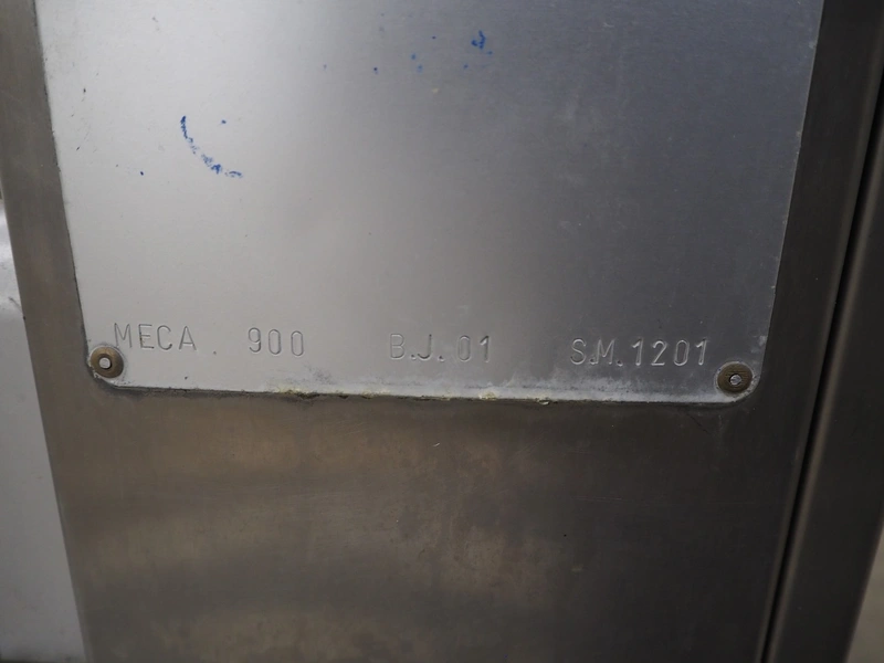 Deca traysealer, type: MECA 900, serial number: S.M. 1201, year of construction: 2001, film width: 270 mm, dimensions dye: (2x) 200 mm x 140 mm, total dimensions: 1400 mm x 800 mm x 1800 mm. Including 2 pallets with parts, dimensions dyes: 220 mm x 150 mm, 280 mm x 180 mm, 320 mm x 270 mm.
