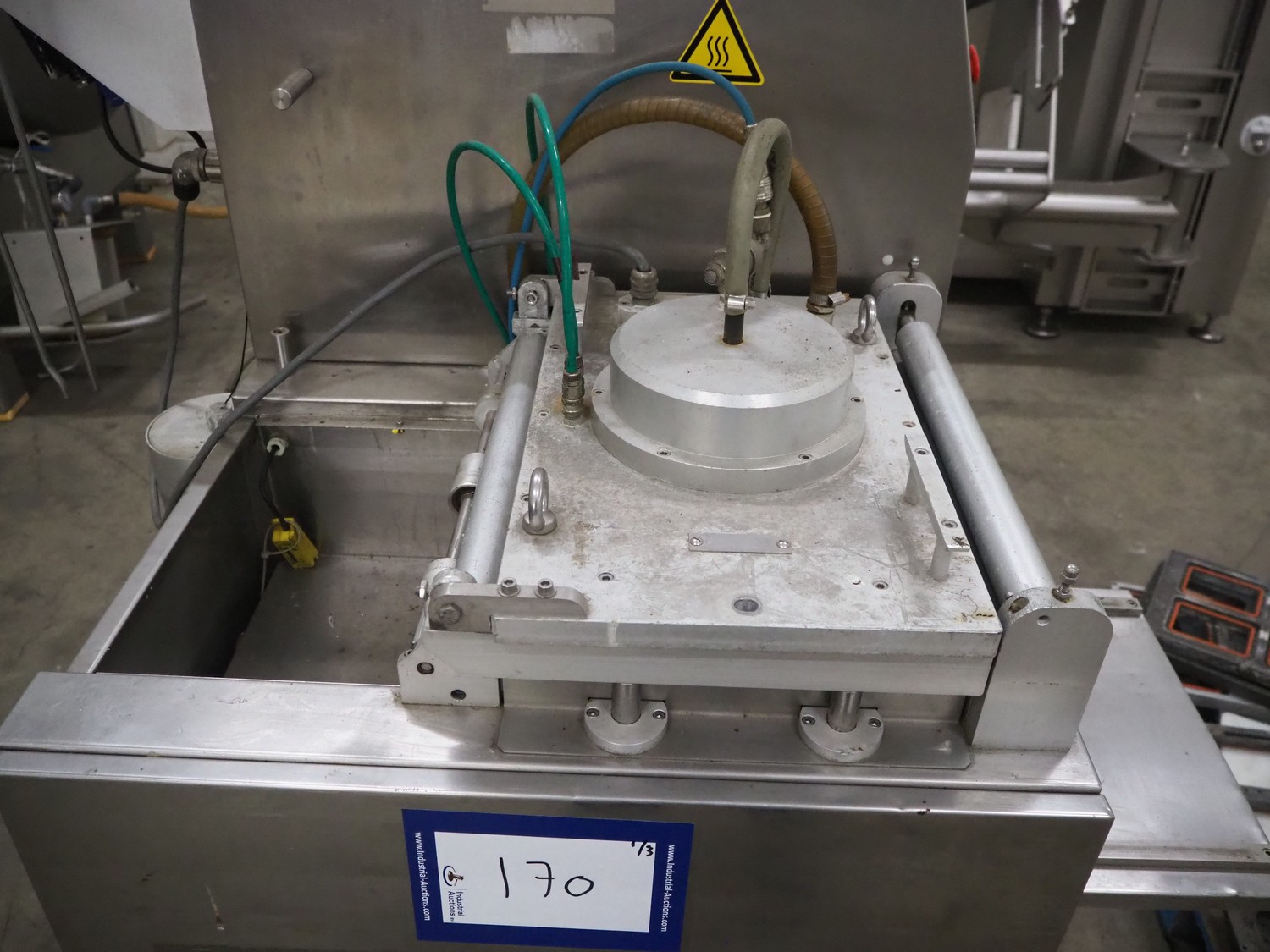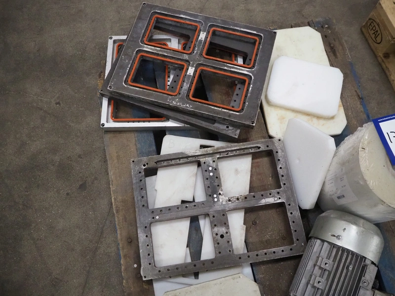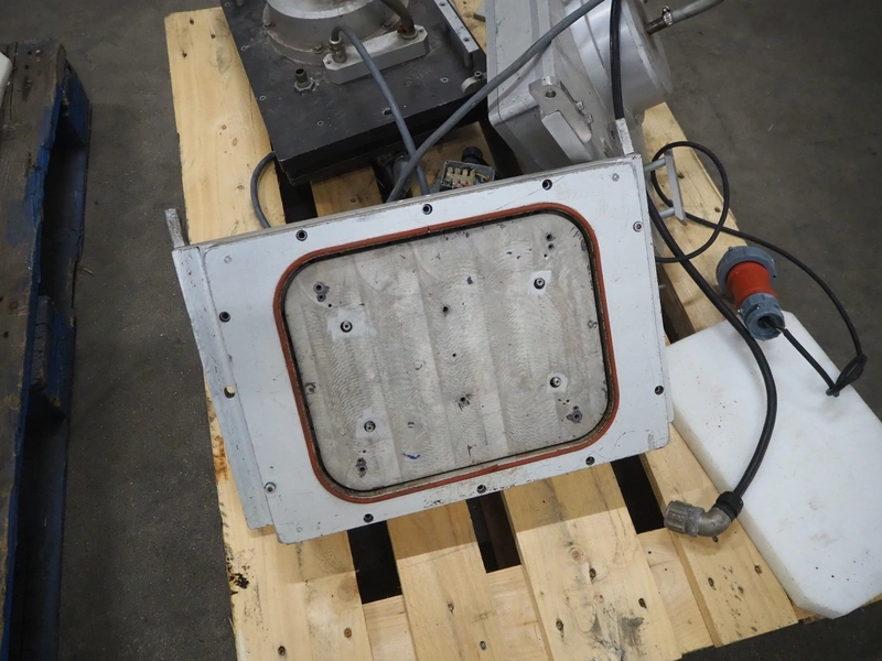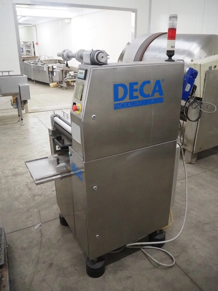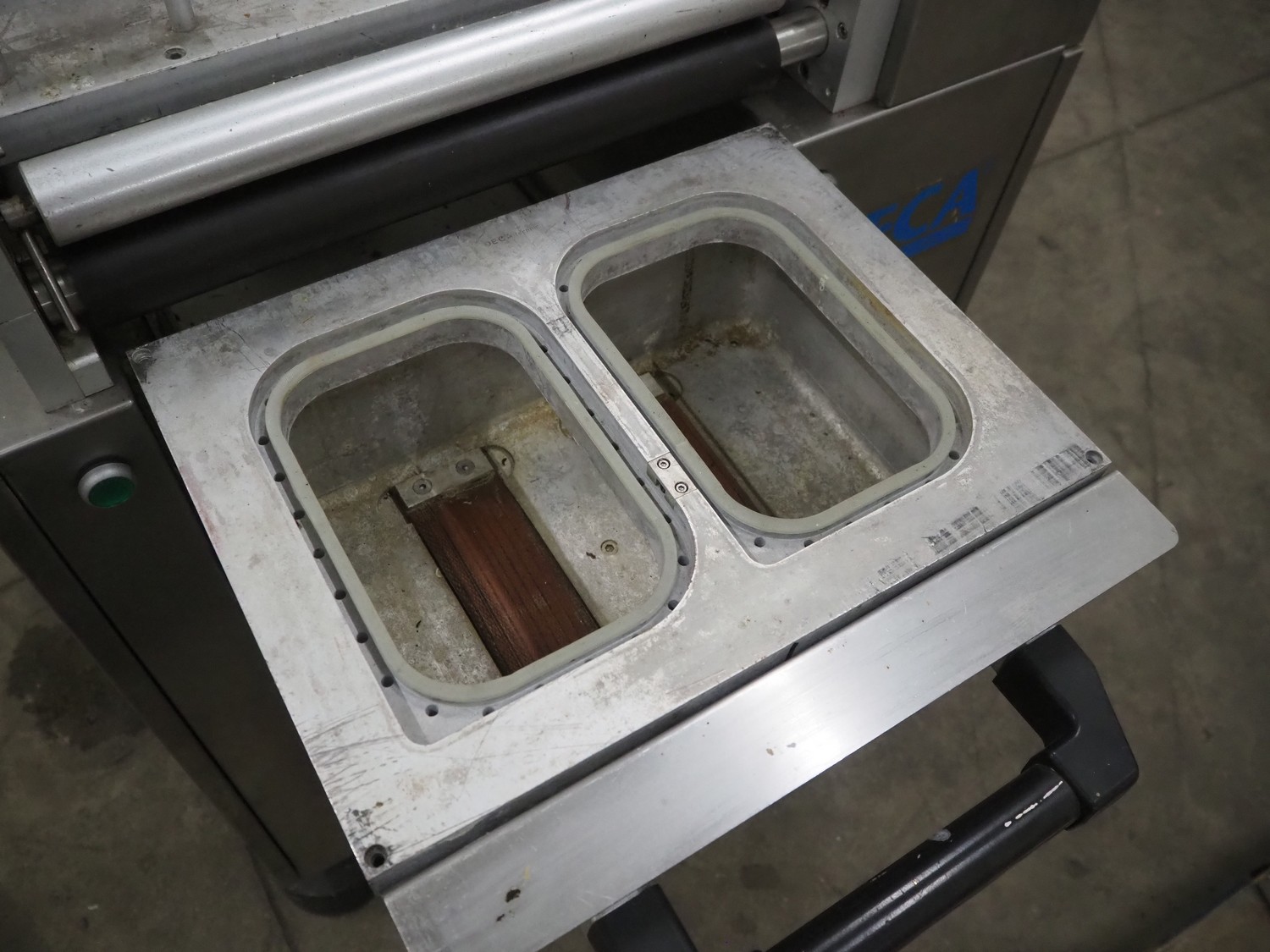 Deca traysealer, type: MECA 900, serial number: S.M. 1201, year of construction: 2001, film width: 270 mm, dimensions dye: (2x) 200 mm x 140 mm, total dimensions: 1400 mm x 800 mm x 1800 mm. Including 2 pallets with parts, dimensions dyes: 220 mm x 150 mm, 280 mm x 180 mm, 320 mm x 270 mm.