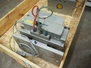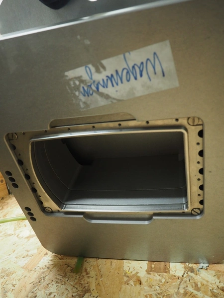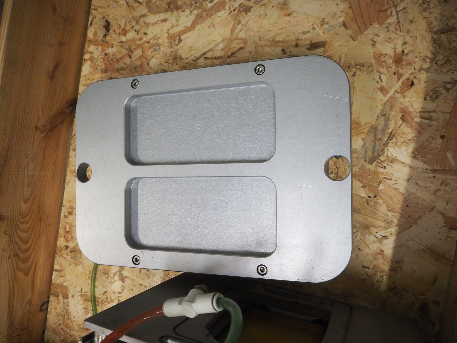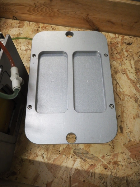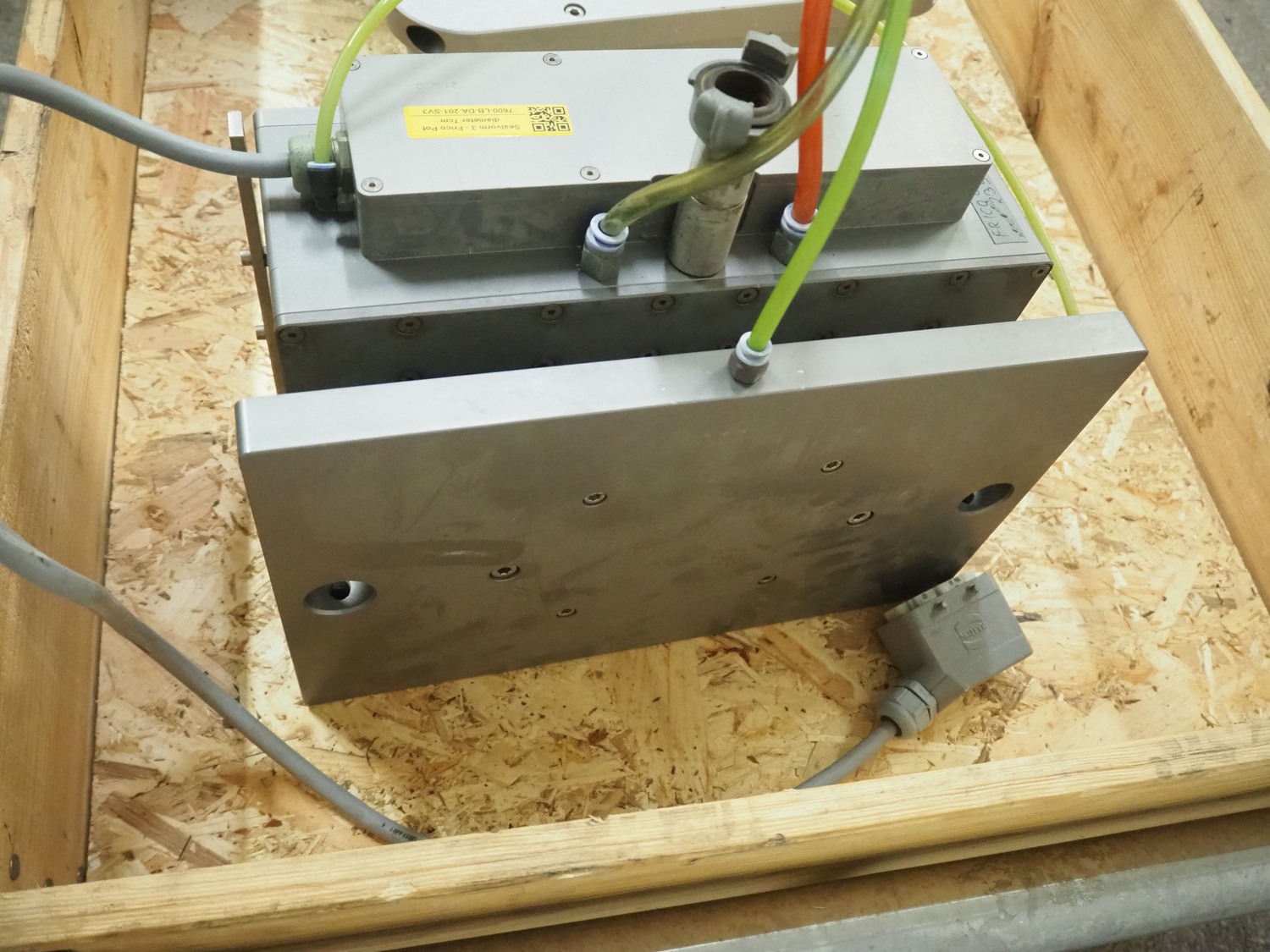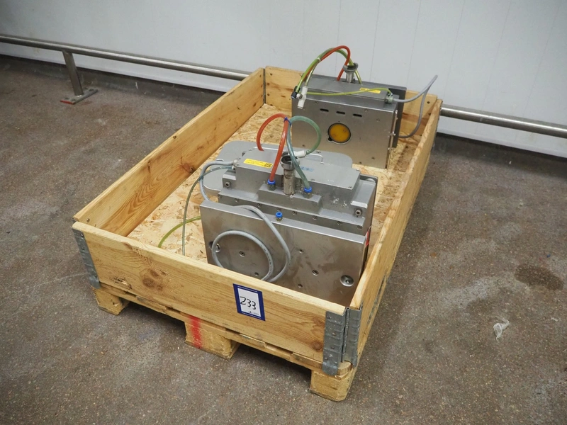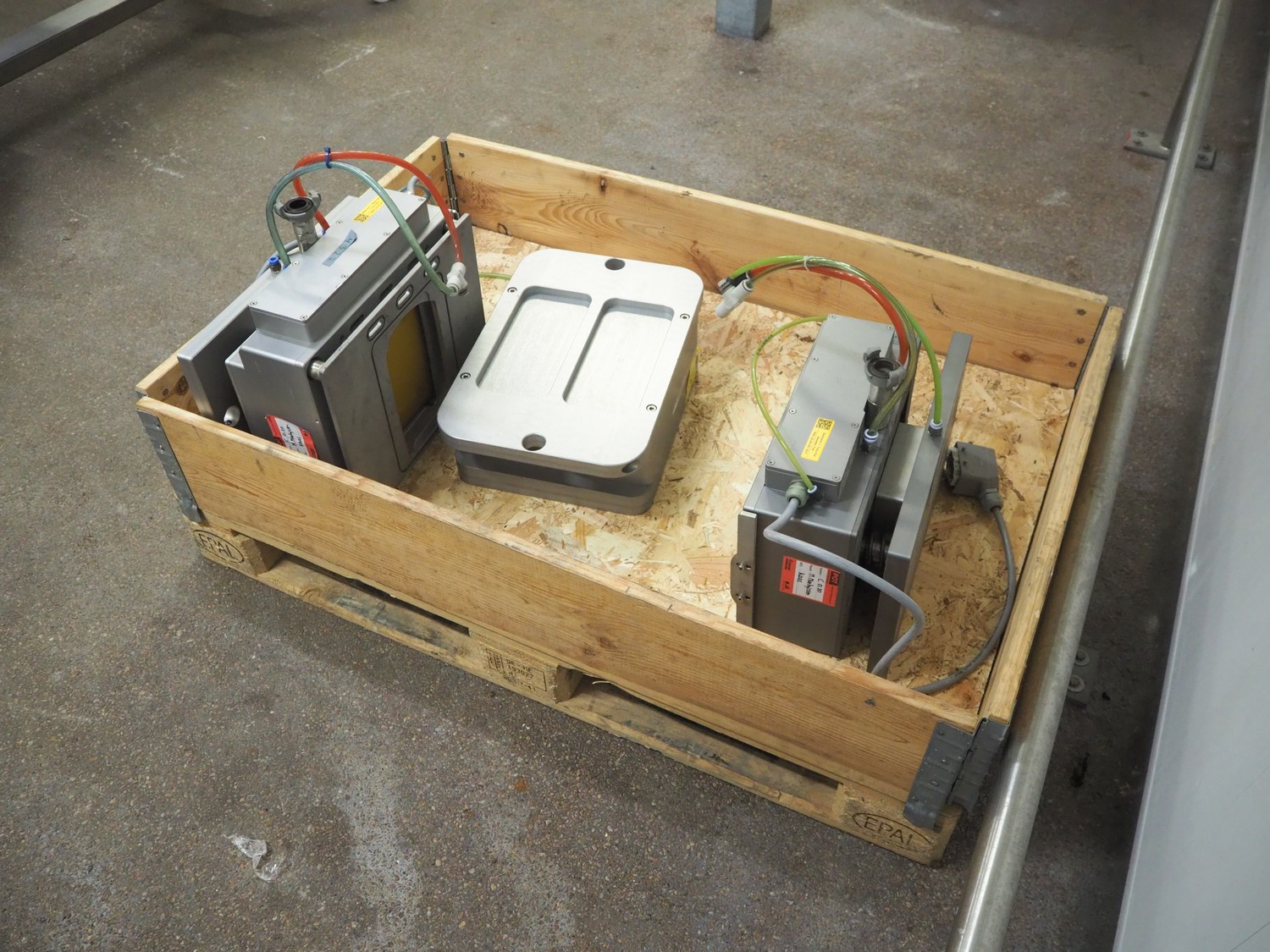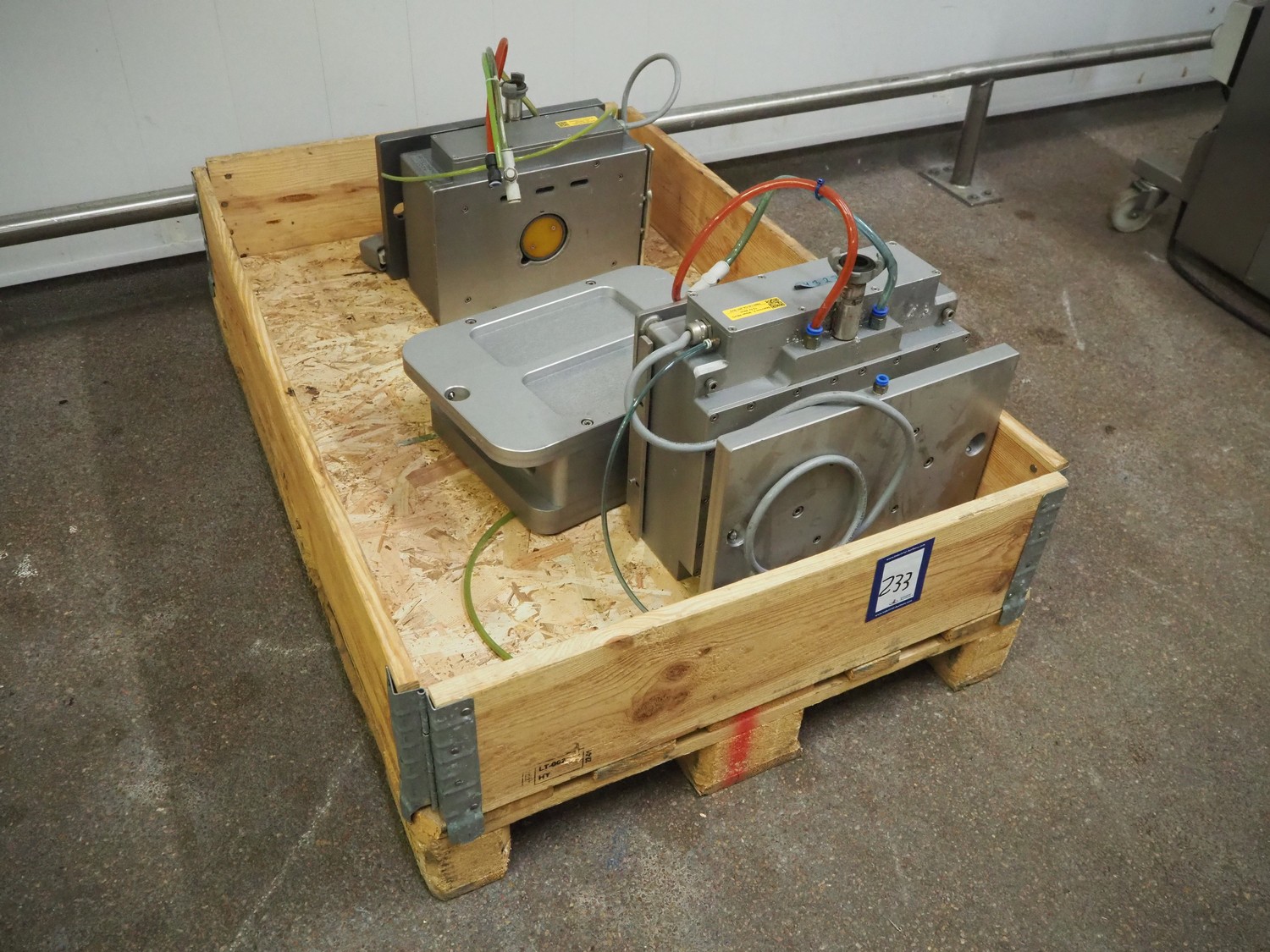 Pallet with 3 dyes for traysealer, dimensions dye: (2x) 200 mm x 125 mm and (1x) Ø 70 mm, total dimensions: 400 mm x 350 mm x 250 mm, 420 mm x 350 mm x 200 mm and 400 mm x 240 mm x 200 mm.
