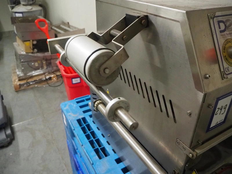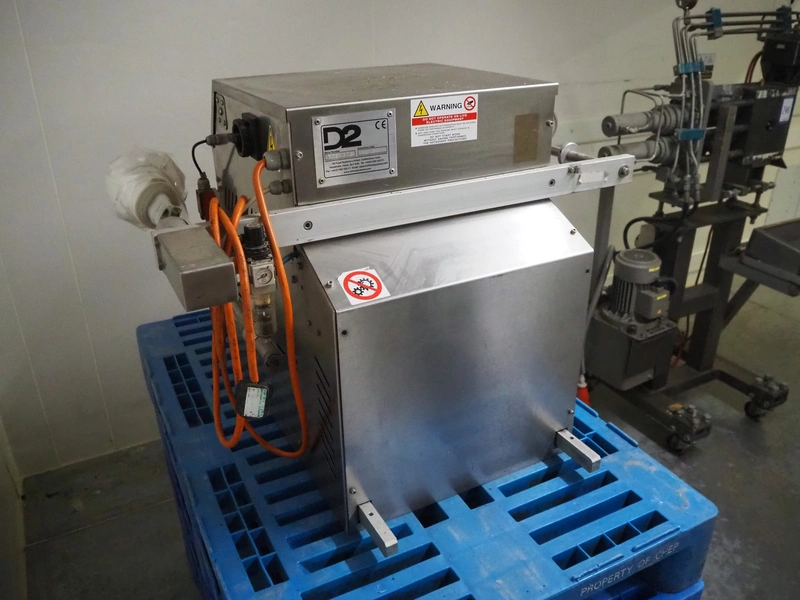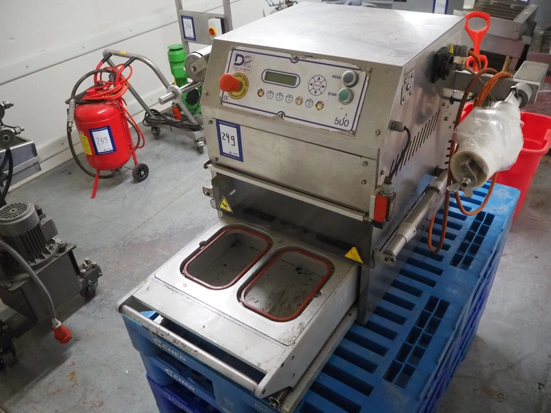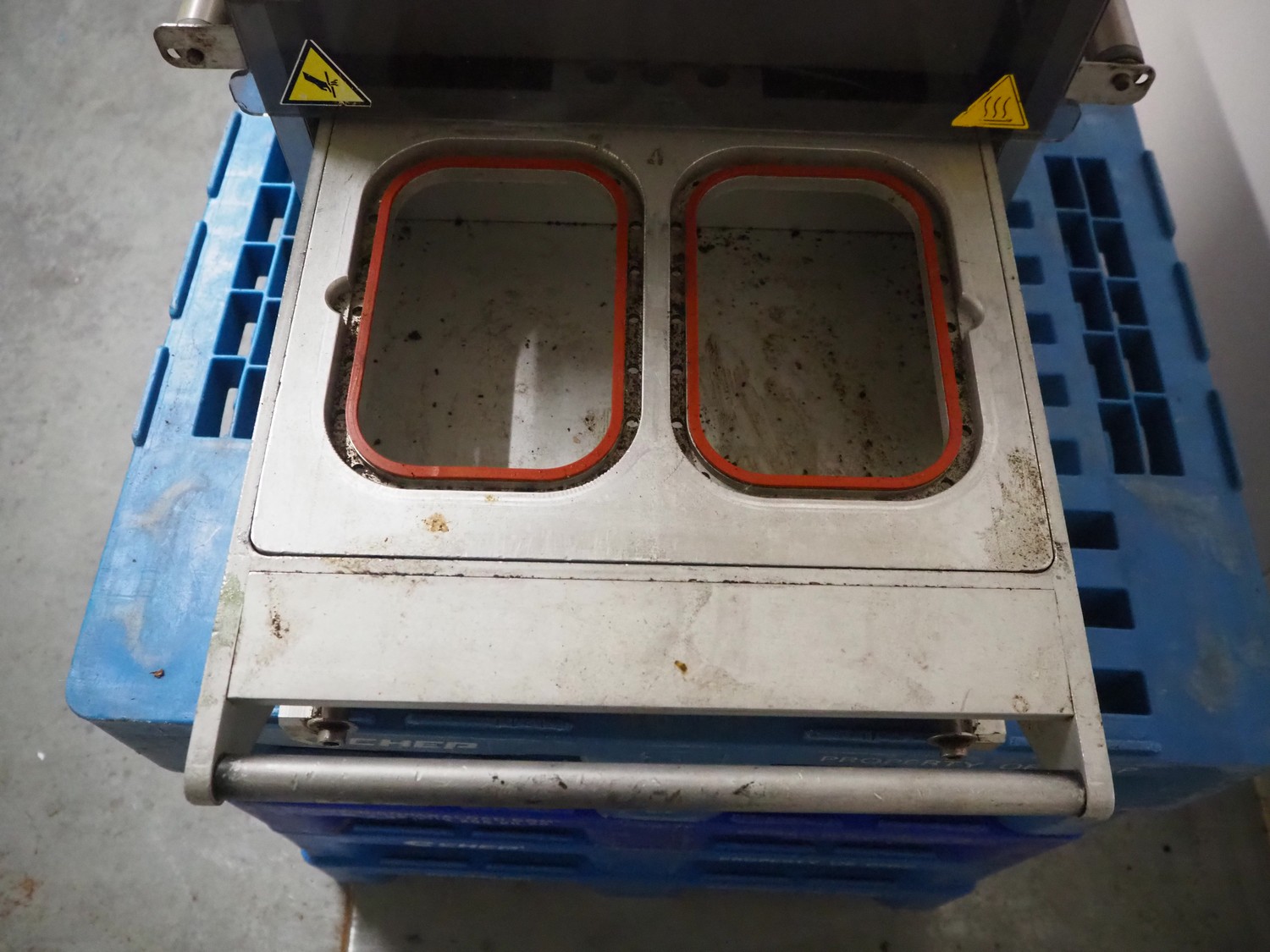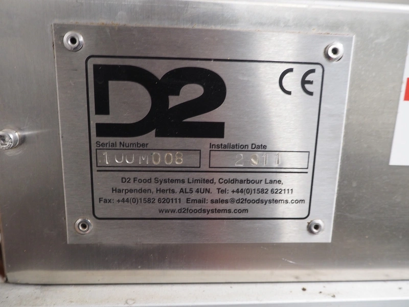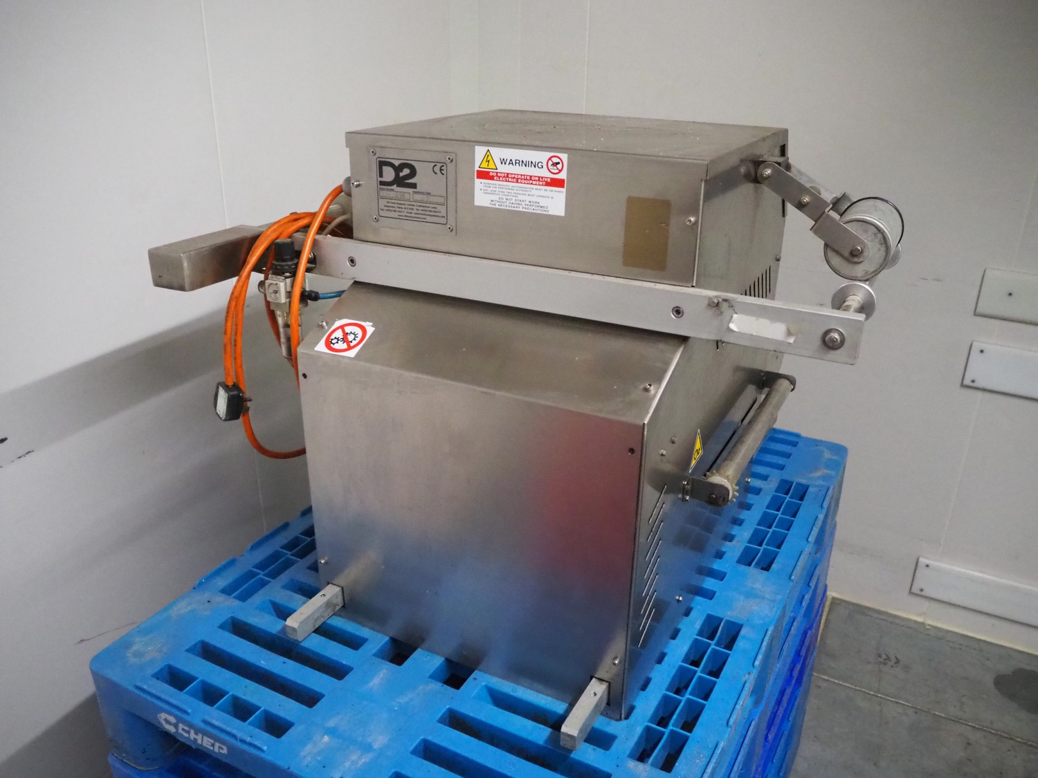 D2 Food Systems Limited traysealer, serial number: 100M008, film width: 280 mm, dimensions dye: (2x) 200 mm x 130 mm, total dimensions: 1150 mm x 900 mm x 670 mm.