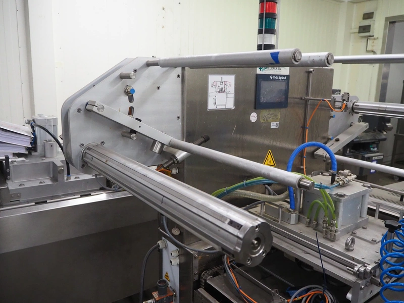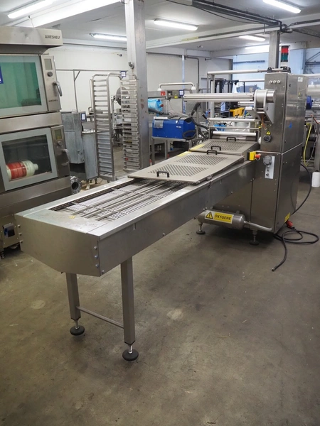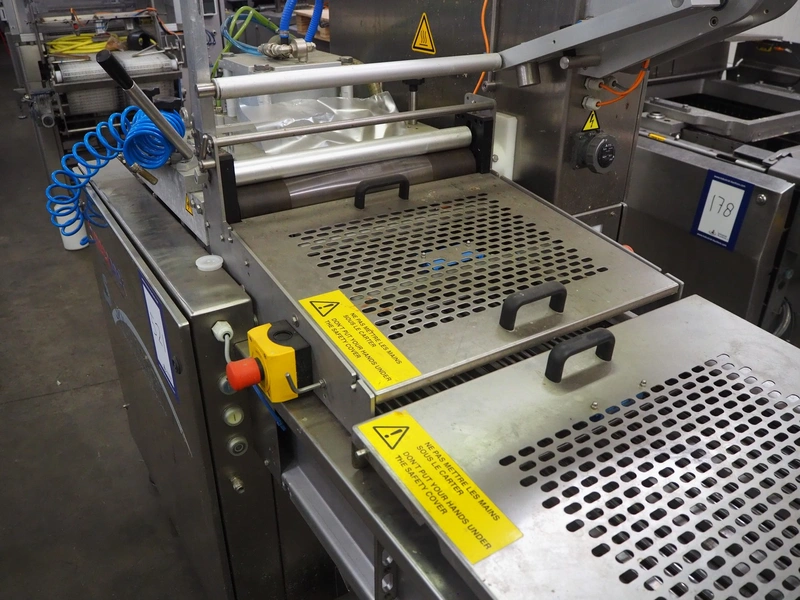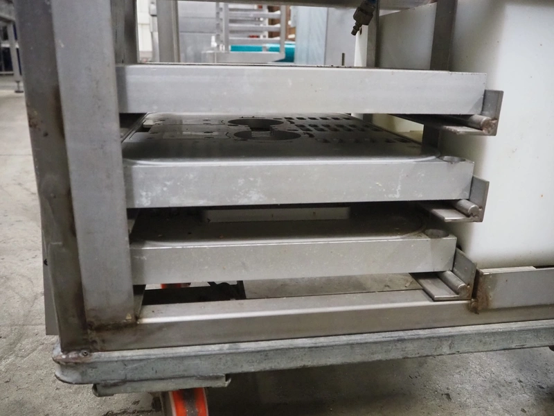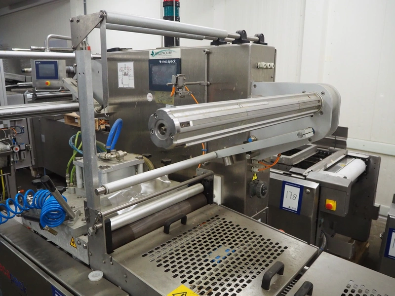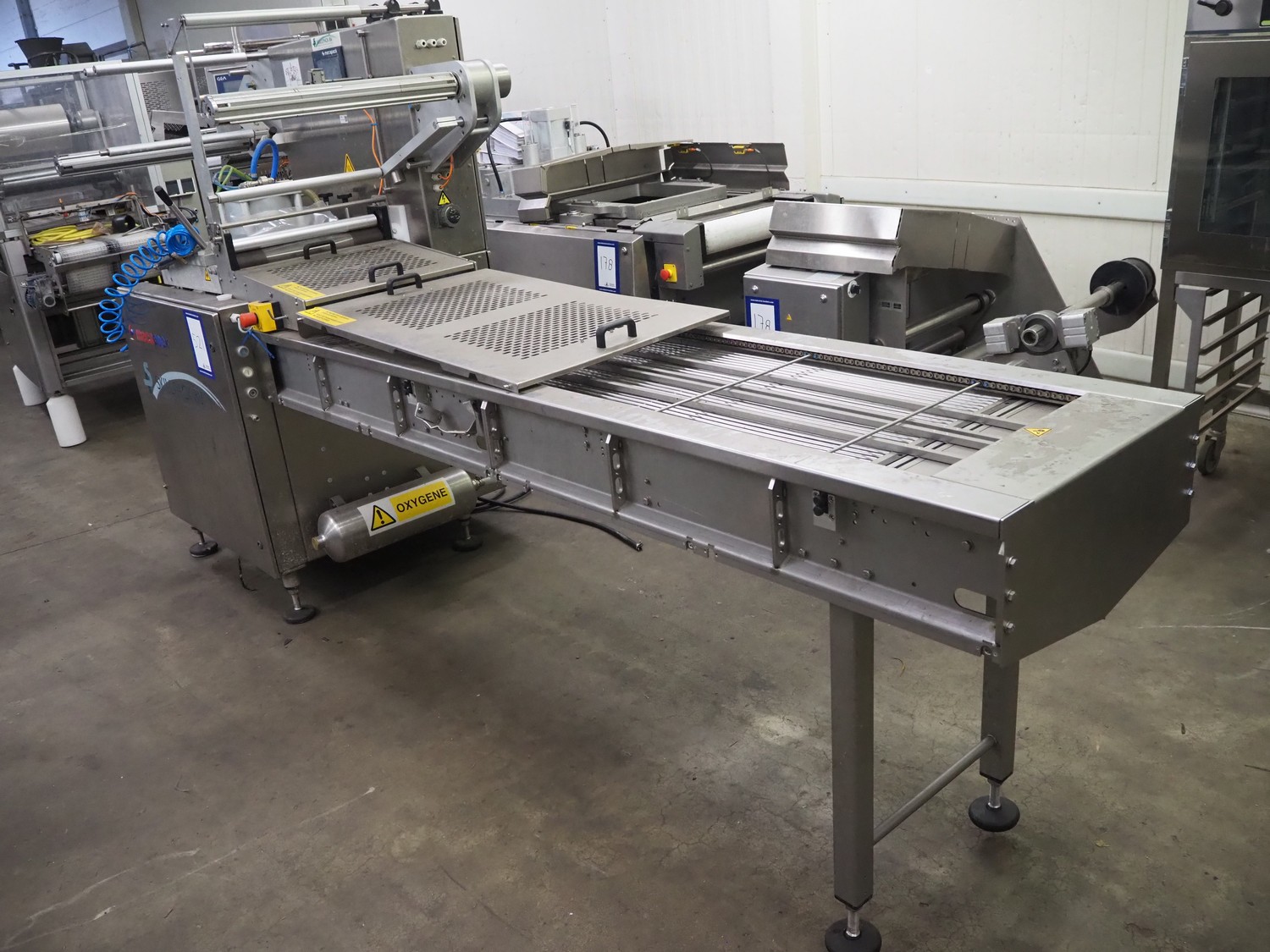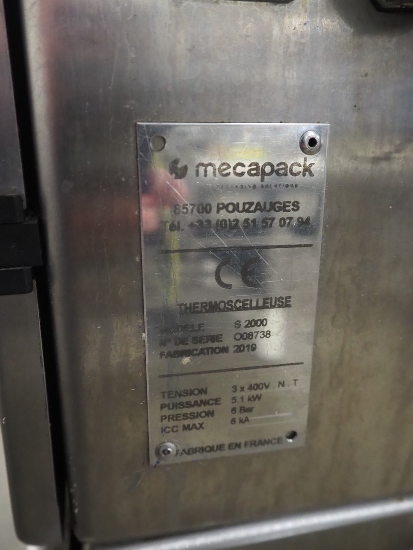 Mecapack traysealer, model: S 2000, serial number: O08738, year of construction: 2019, 400 V, 3 Ph, 5.1 kW, ø dye: (2x) 105 mm, total dimensions: 3580 mm x 850 mm x 1580 mm. Including trolley with extra forms, transport belt, plastic mesh belt, belt width: 465 mm, total dimensions transport belt: 1600 mm x 650 mm x 1000 mm and 6 pallets with film rolls.