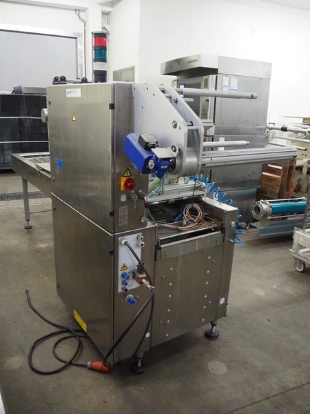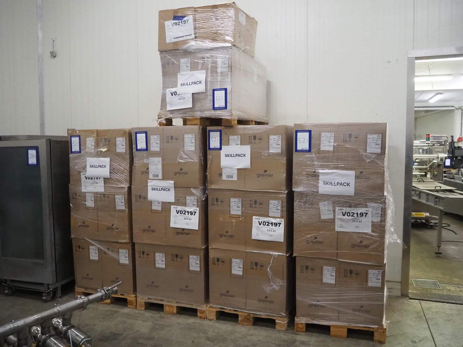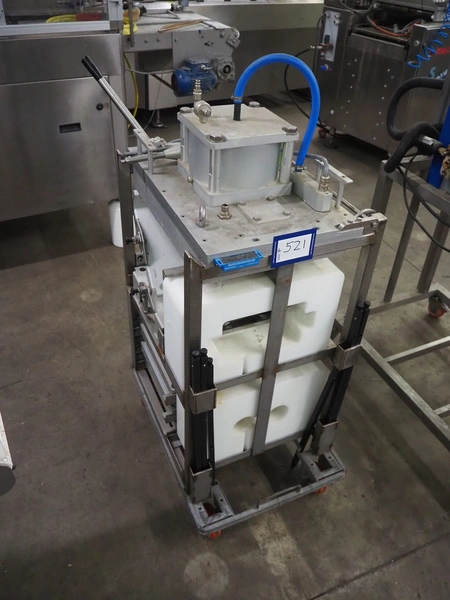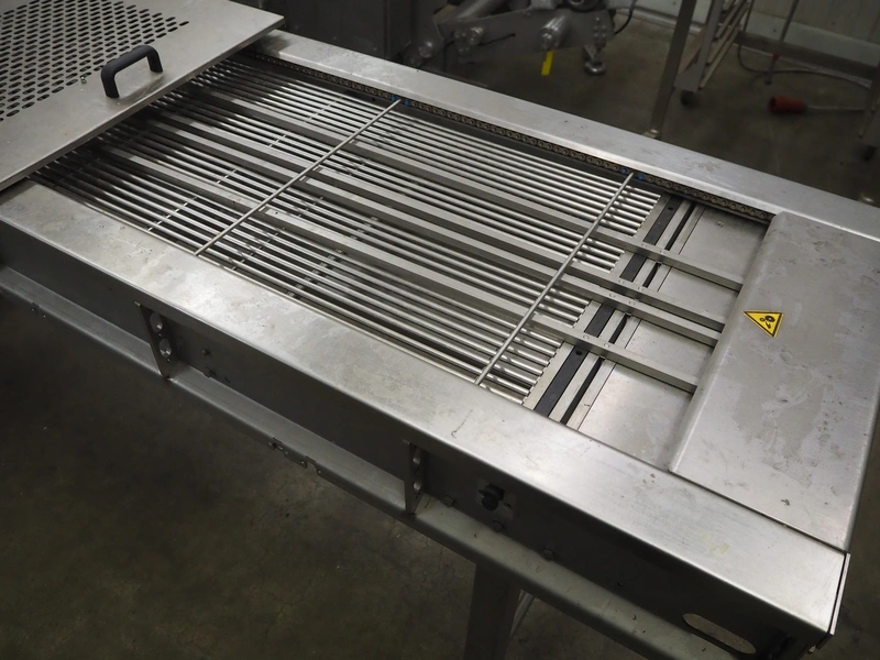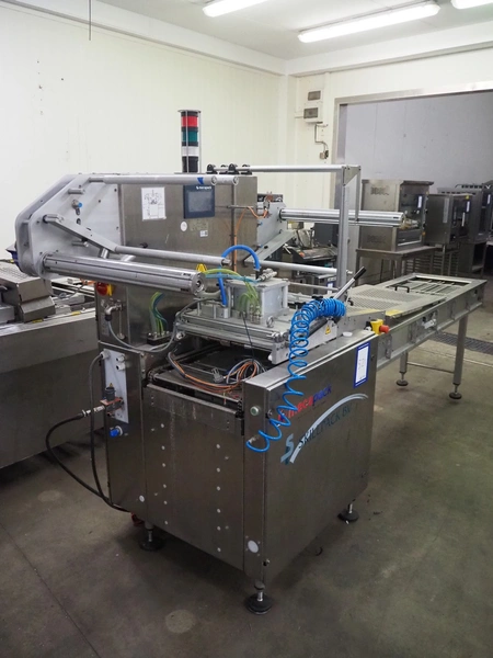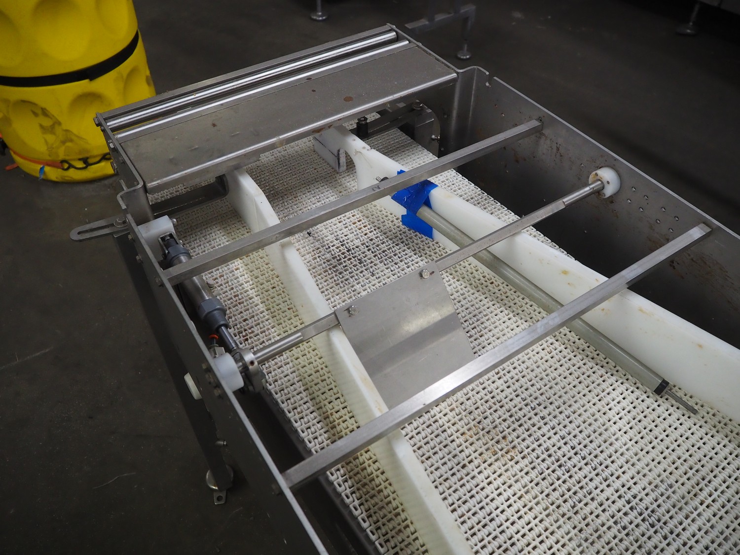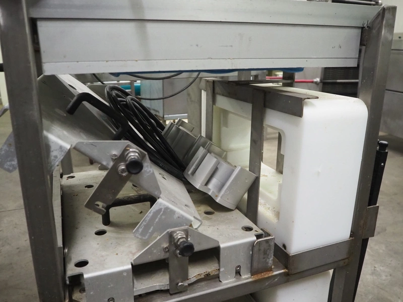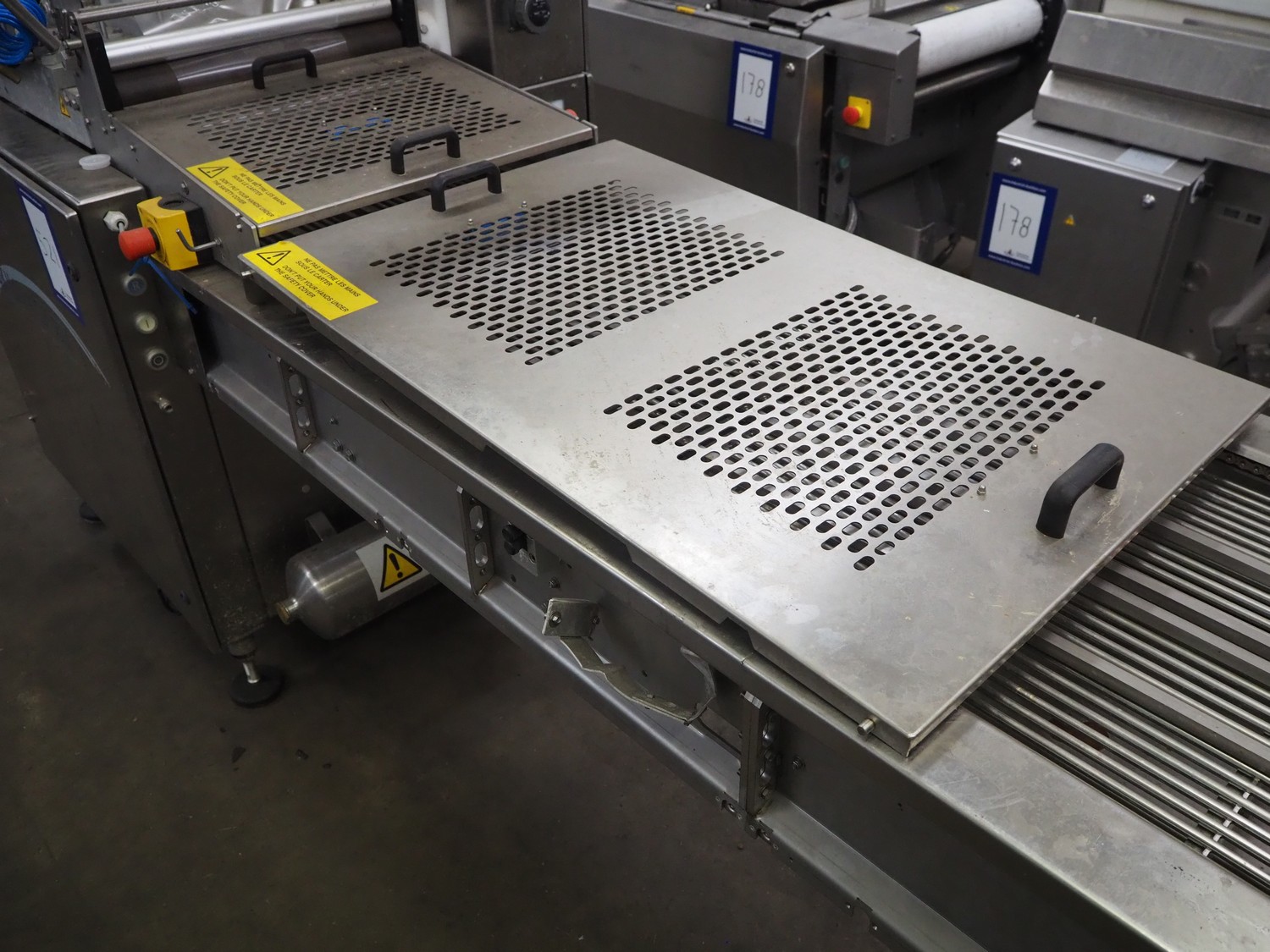 Mecapack traysealer, model: S 2000, serial number: O08738, year of construction: 2019, 400 V, 3 Ph, 5.1 kW, ø dye: (2x) 105 mm, total dimensions: 3580 mm x 850 mm x 1580 mm. Including trolley with extra forms, transport belt, plastic mesh belt, belt width: 465 mm, total dimensions transport belt: 1600 mm x 650 mm x 1000 mm and 6 pallets with film rolls.
