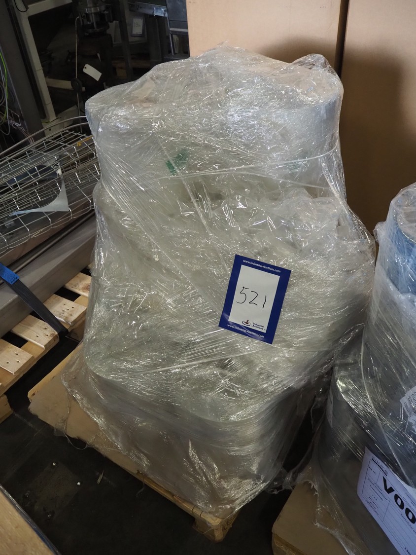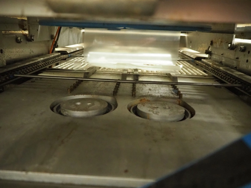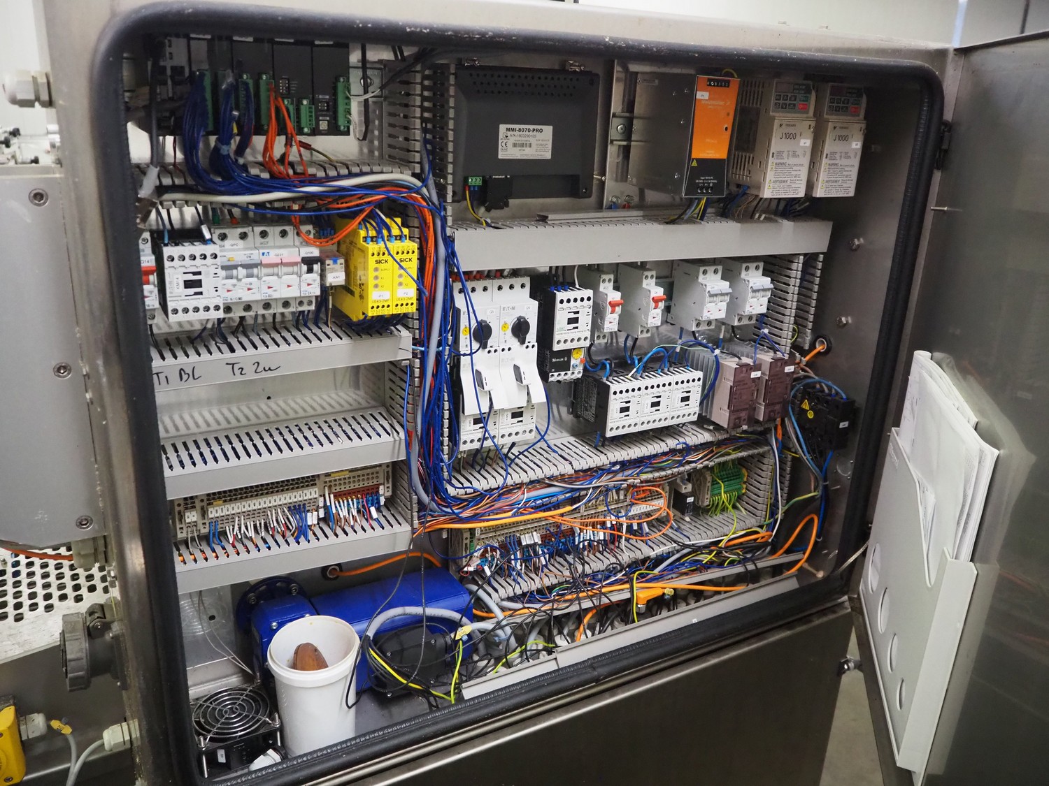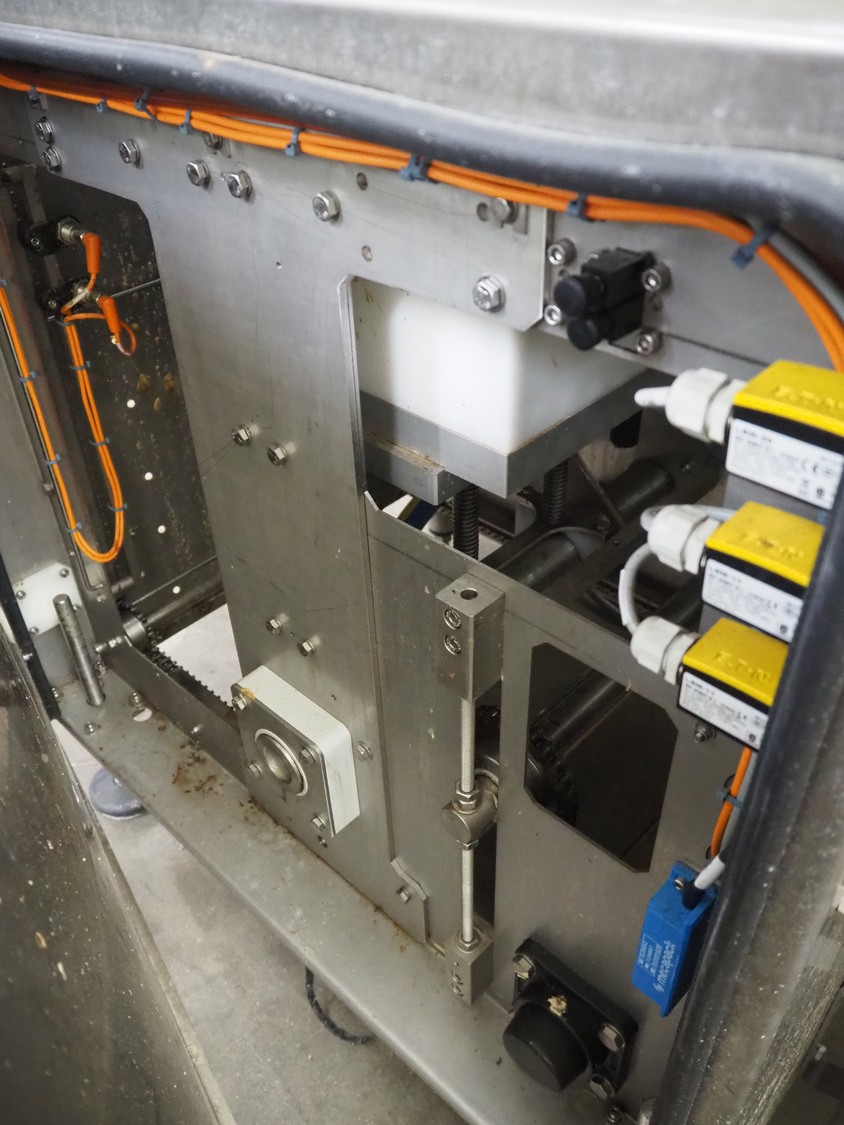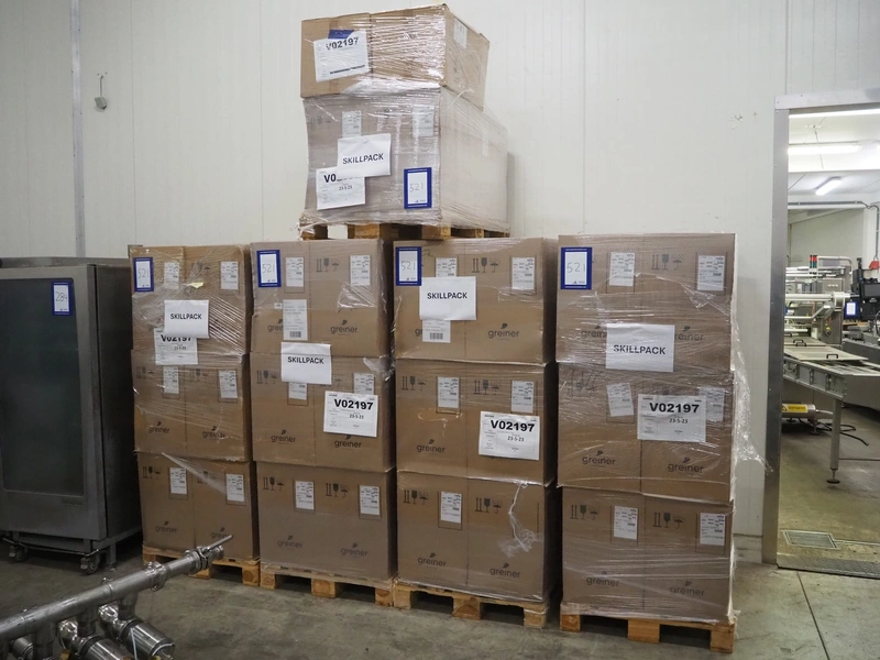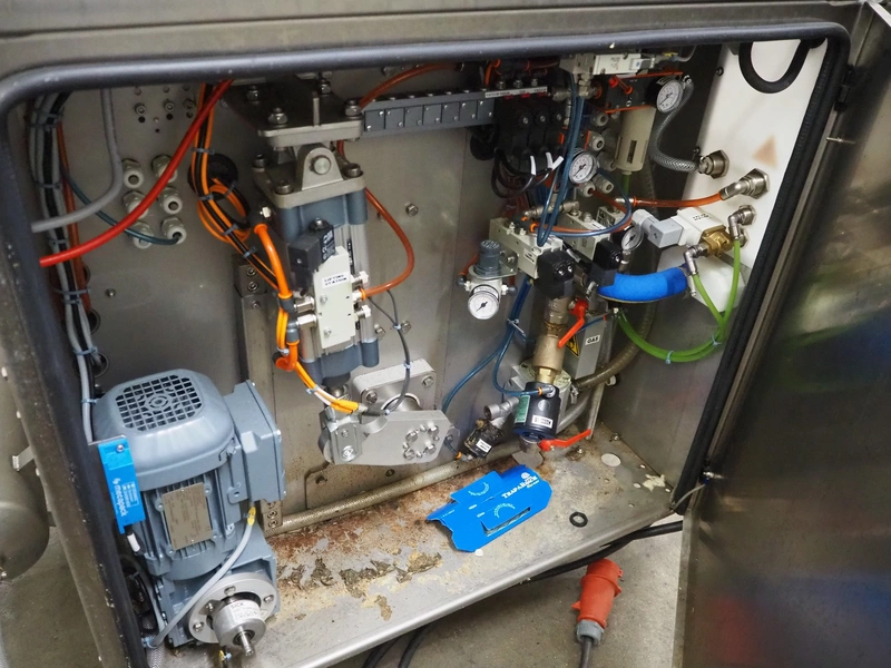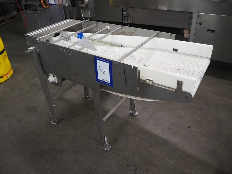 Mecapack traysealer, model: S 2000, serial number: O08738, year of construction: 2019, 400 V, 3 Ph, 5.1 kW, ø dye: (2x) 105 mm, total dimensions: 3580 mm x 850 mm x 1580 mm. Including trolley with extra forms, transport belt, plastic mesh belt, belt width: 465 mm, total dimensions transport belt: 1600 mm x 650 mm x 1000 mm and 6 pallets with film rolls.