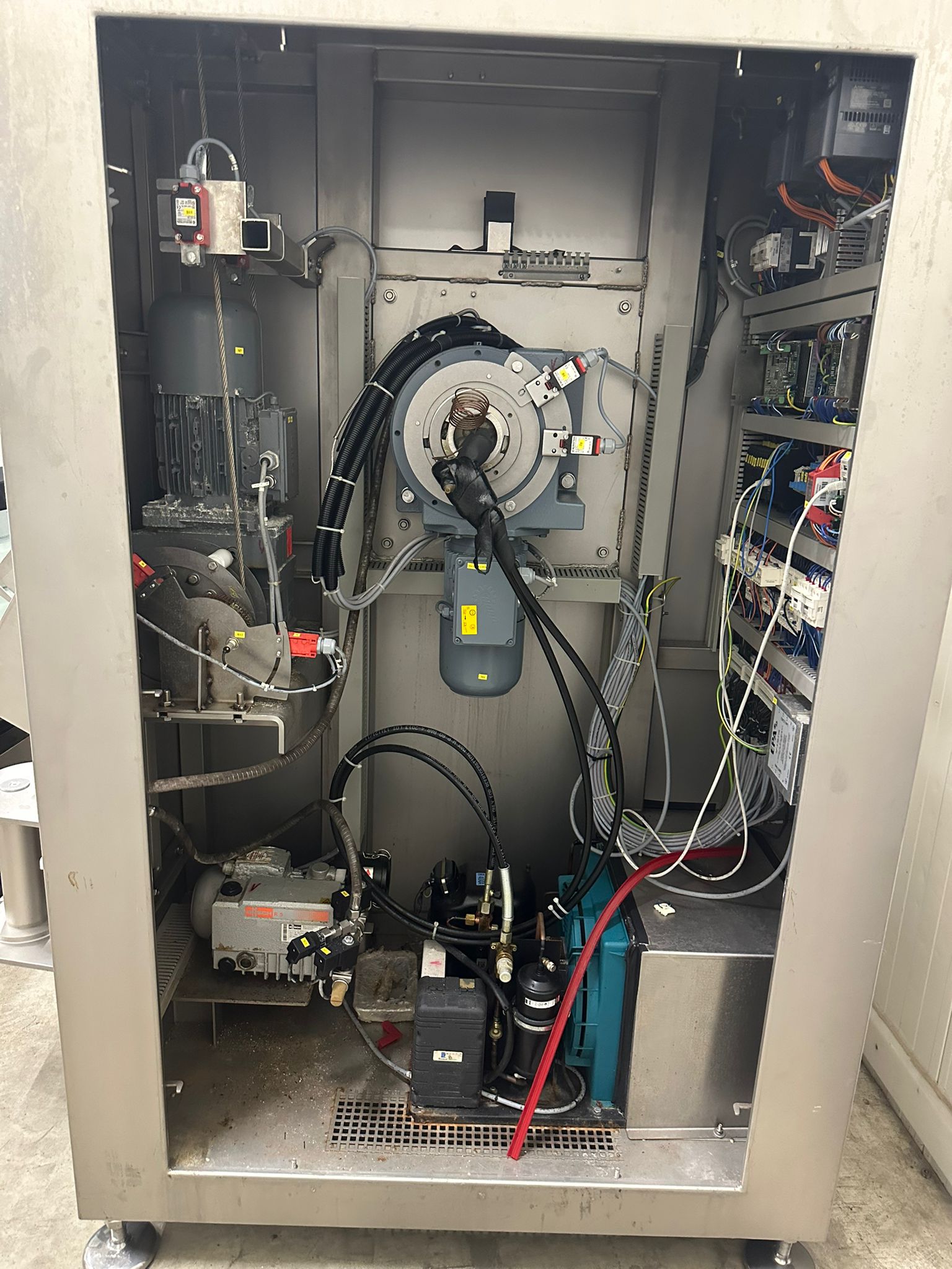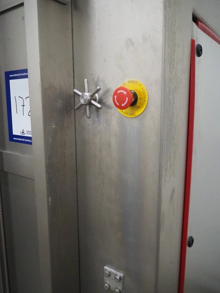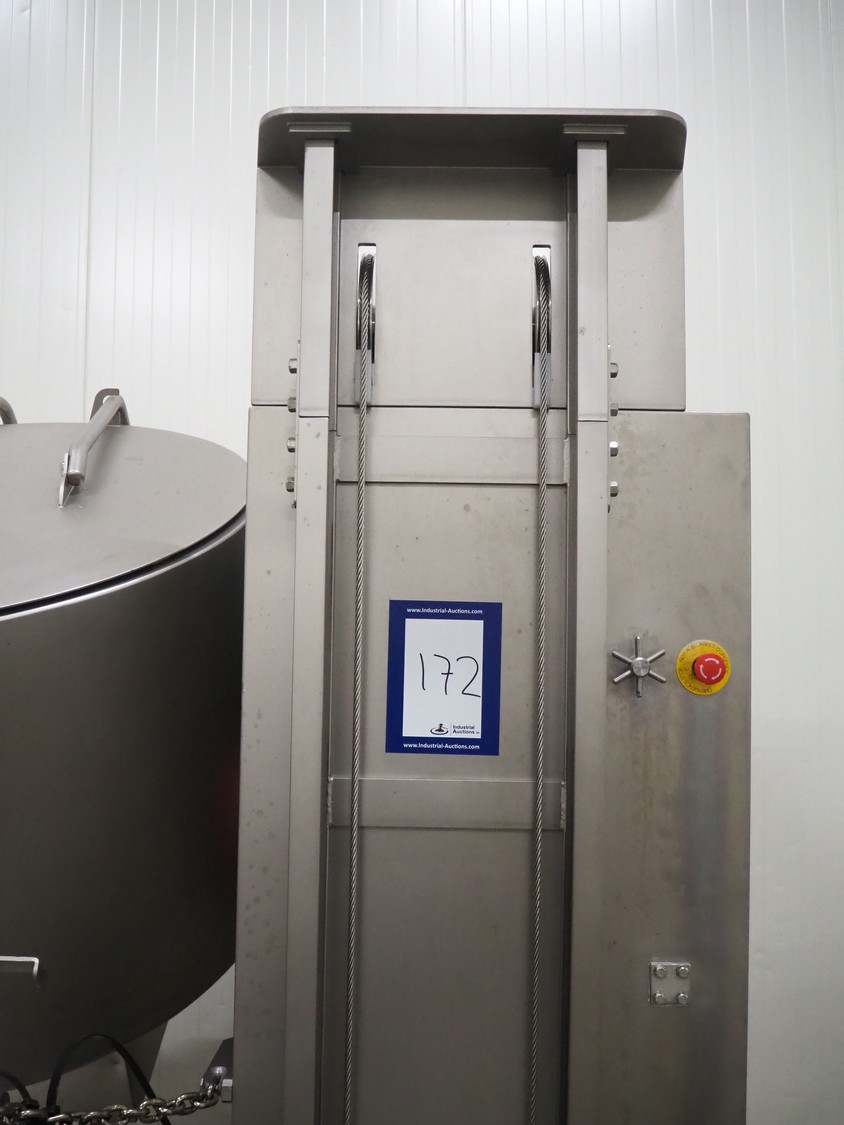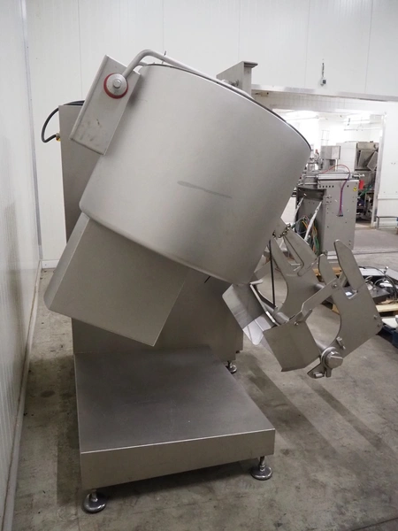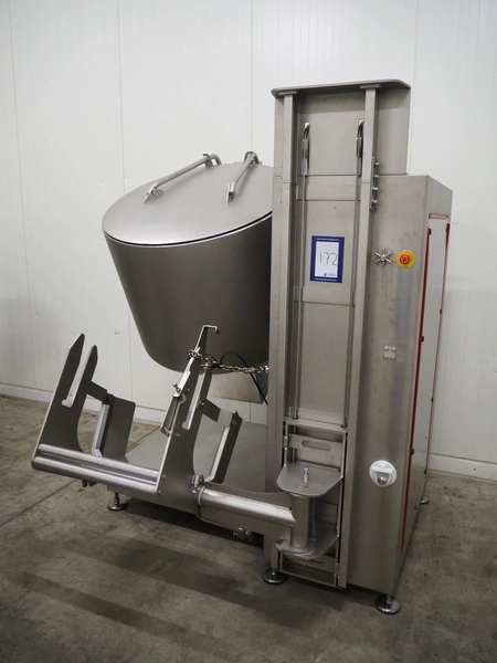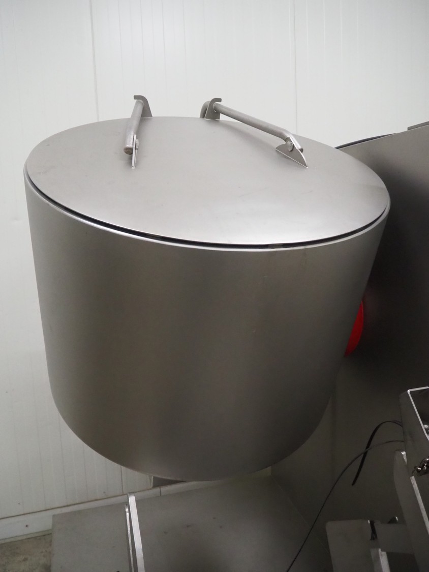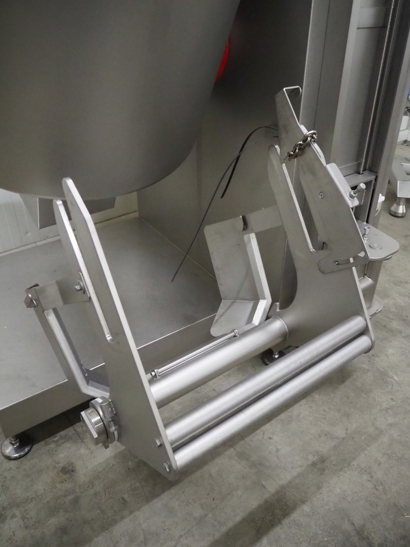 Ruhle vacuum tumbler with lift for 200 liter meat bin, type: MPR 500, number: 0401, year of construction: 2014, 400 V, 3 Ph, 50/60 Hz, 24.9 A, 12.6 kW, refrigerant: R404A, Busch vacuum pump, serial number: 140040161, volume: 19 m³ per hour, total dimensions: 2000 mm x 1850 mm x 2320 mm. Including 3 tablets used as control panel.