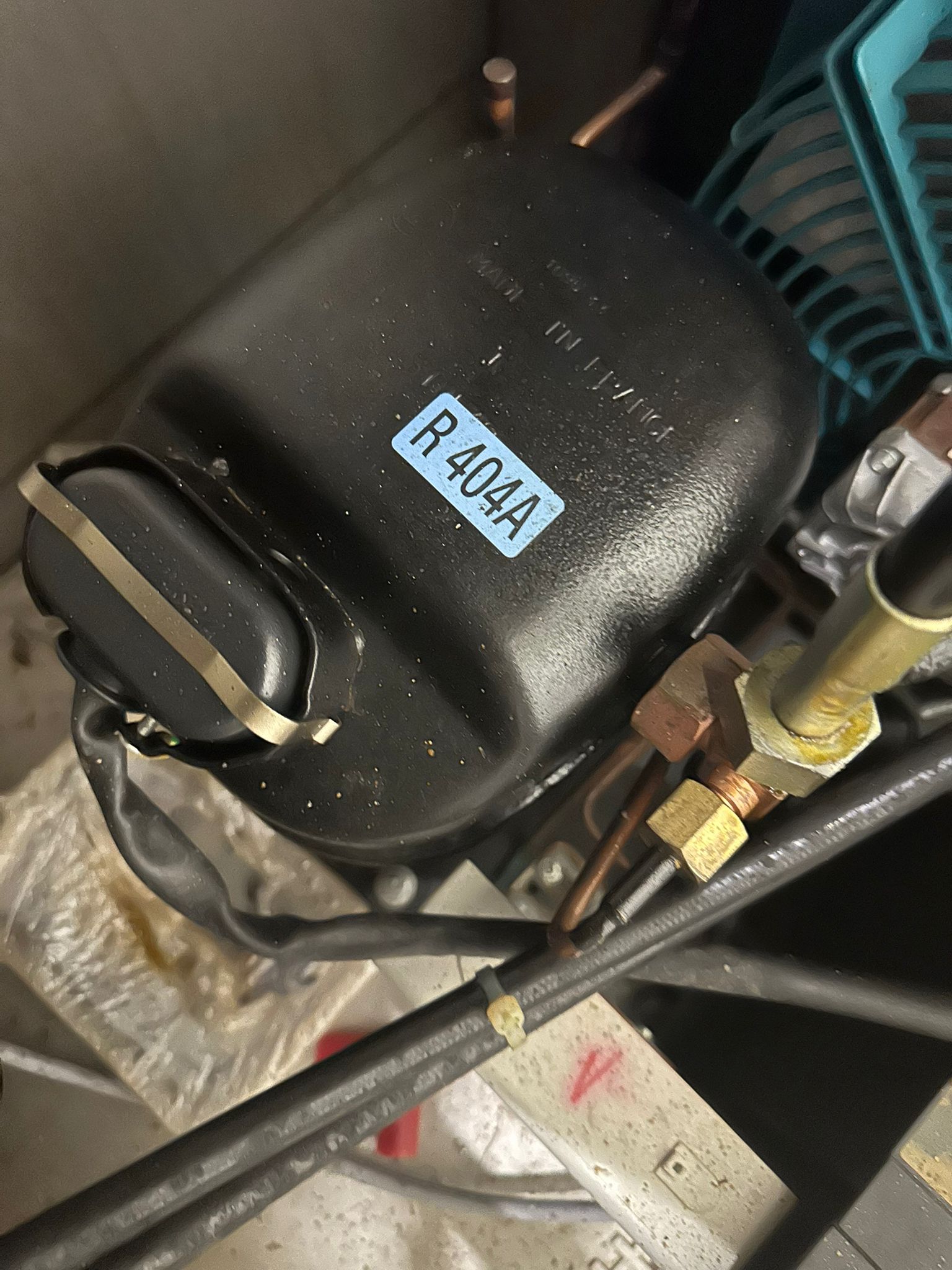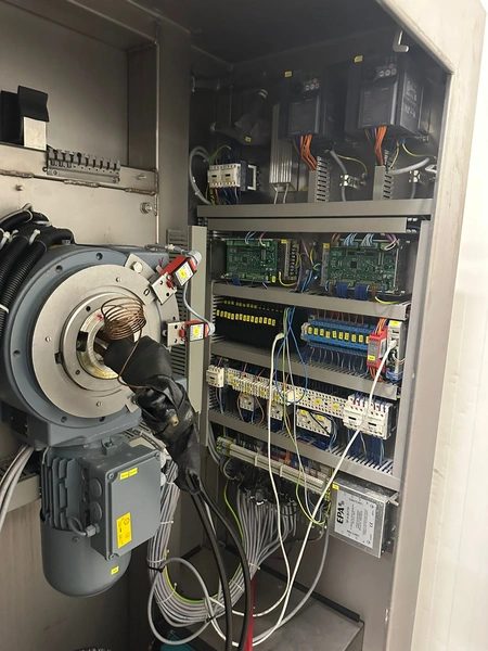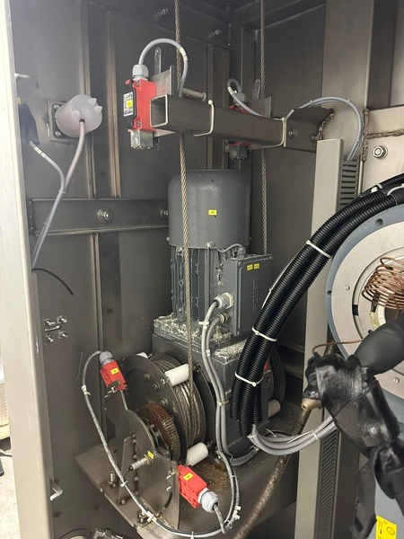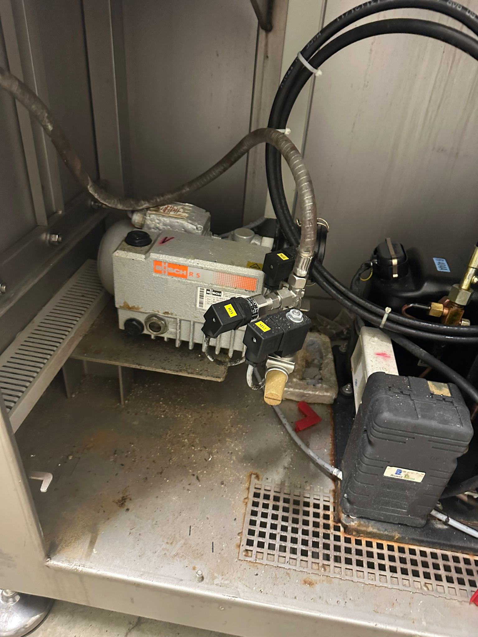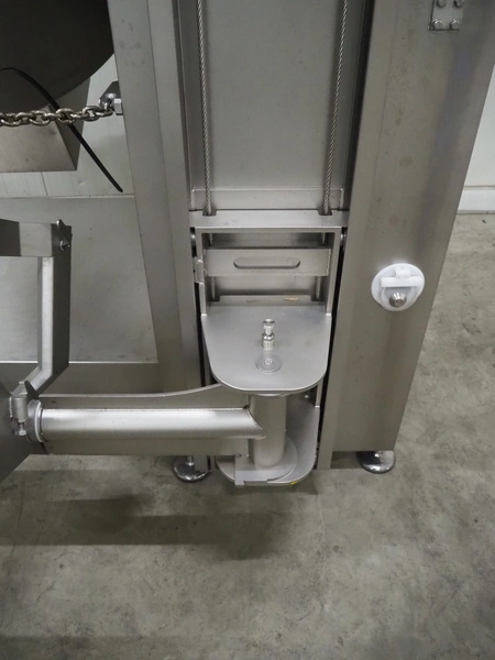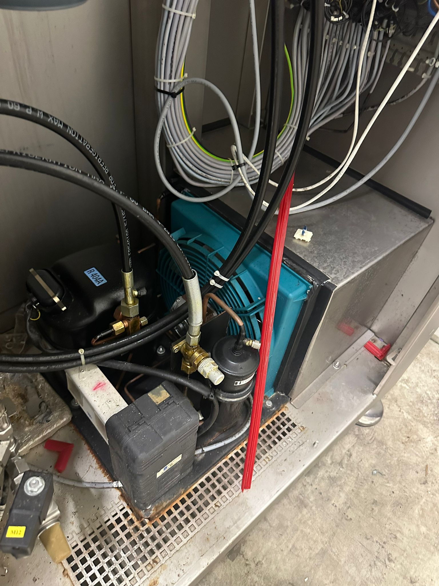 Ruhle vacuum tumbler with lift for 200 liter meat bin, type: MPR 500, number: 0401, year of construction: 2014, 400 V, 3 Ph, 50/60 Hz, 24.9 A, 12.6 kW, refrigerant: R404A, Busch vacuum pump, serial number: 140040161, volume: 19 m³ per hour, total dimensions: 2000 mm x 1850 mm x 2320 mm. Including 3 tablets used as control panel.