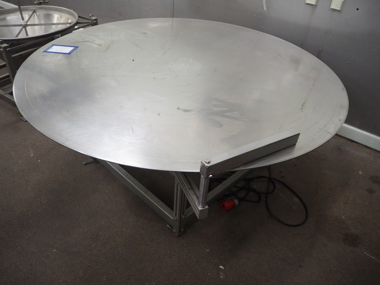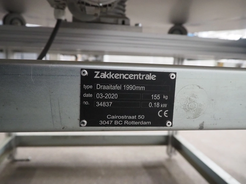 Zakkencentrale turning table, type: Draaitafel 1990mm, number: 34837, year of construction: 03-2020, weight: 155 kg, 0.18 kW, s/s top, steel frame, dimensions: ø 2000 mm x 910 mm.