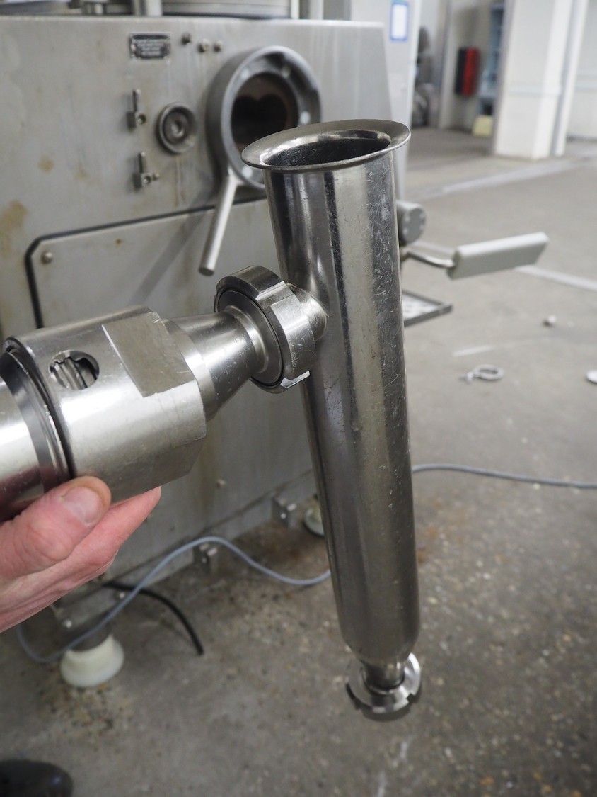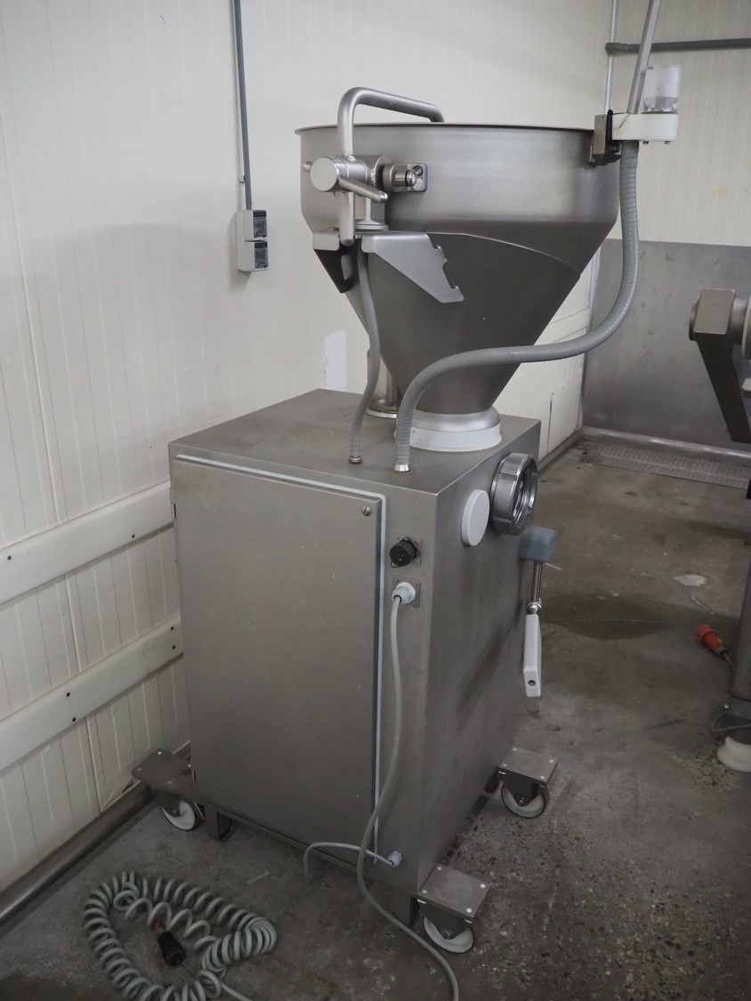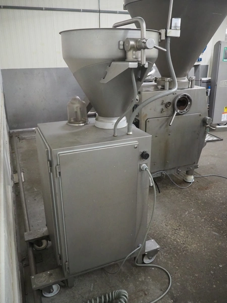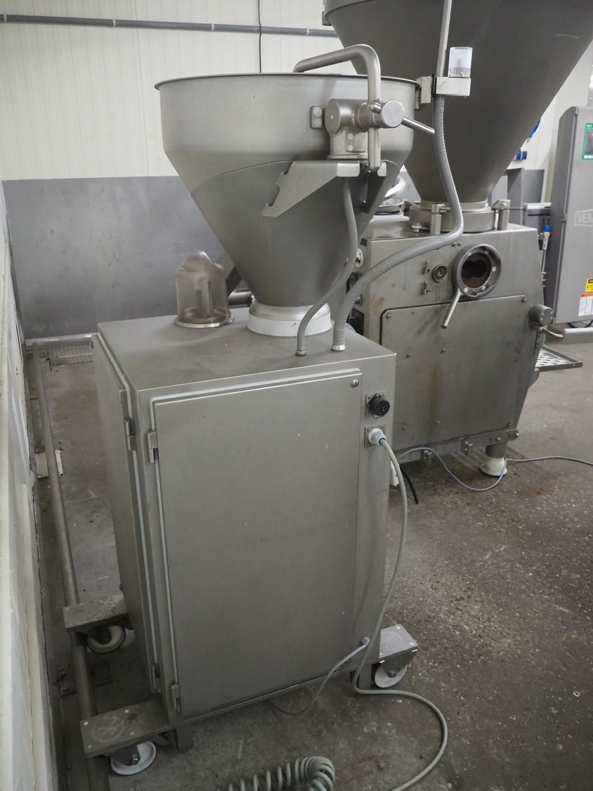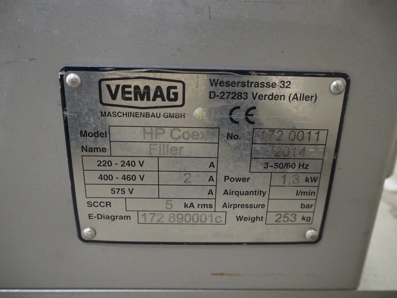 Vemag Maschinenbau GmbH mobile vacuum filling machine and co-extrusion, model: HP Coex, number: 172 0011, year of construction: 2014, 400-460 V, 3 Ph, 50/60 Hz, 2 A, 1.3 kW, weight: 253 kg, Vemag vacuum pump, type: 090113402, number: 425899, dimensions: 1100 mm x 800 mm x 2100 mm.