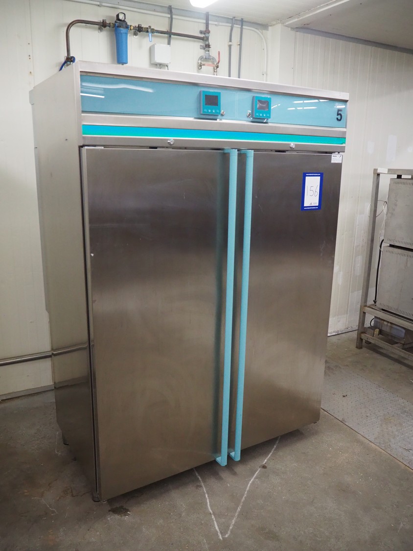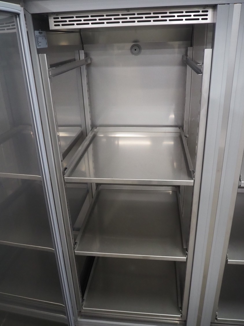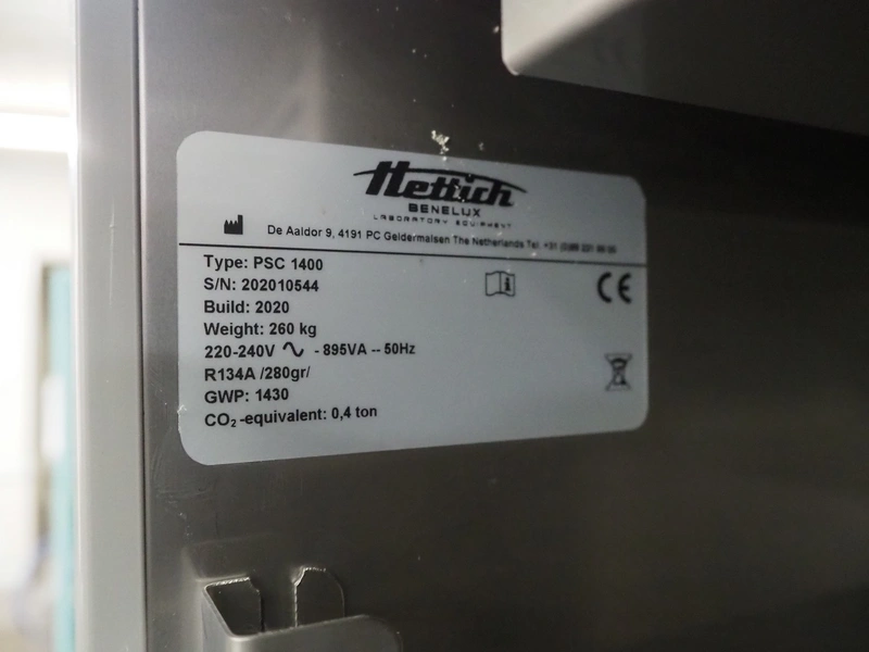 Hettich laboratory cabinet, type: PSC 1400, serial number: 202010544, year of construction: 2020, 220/240 V, 50 Hz, weight: 260 kg, 20-40 degrees, refrigerant: R134A, 6 floors, dimensions each floor: 600 mm x 520 mm, total dimensions: 1420 mm x 950 mm x 2000 mm.