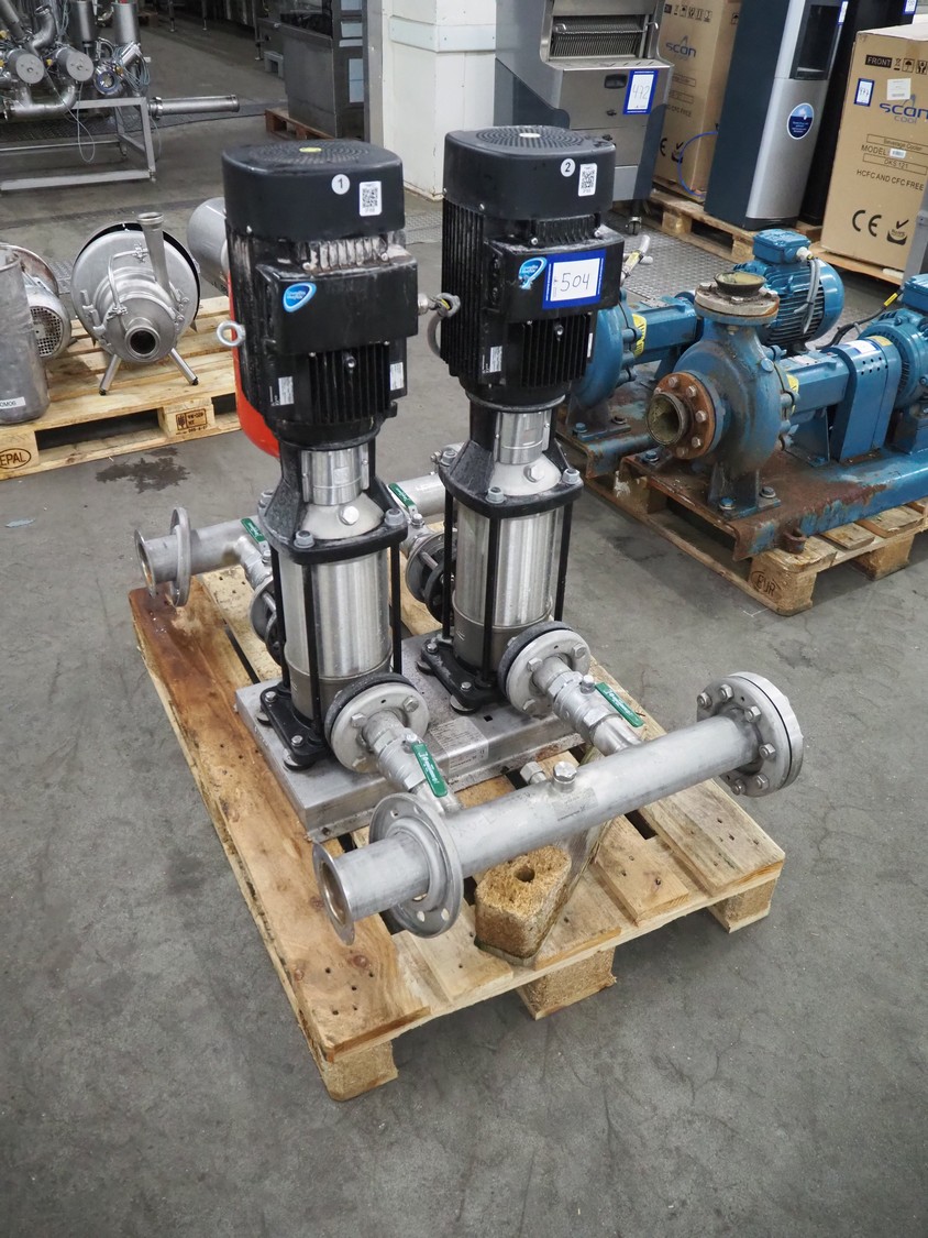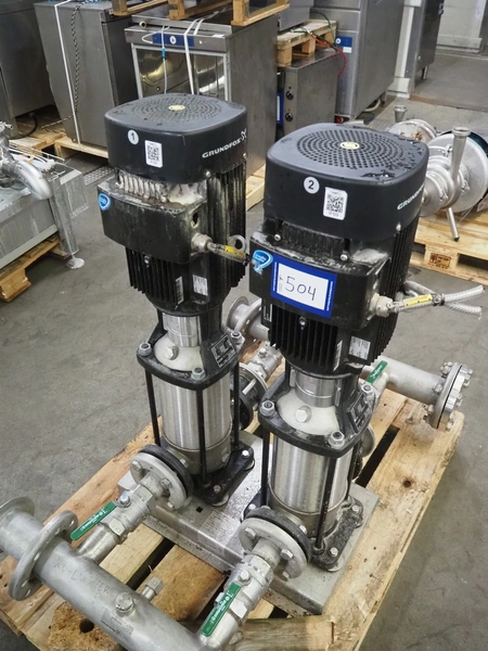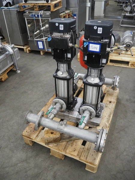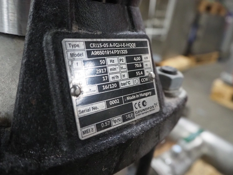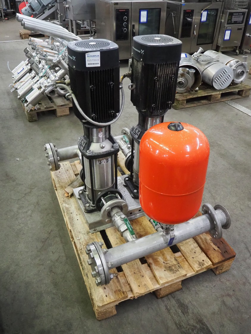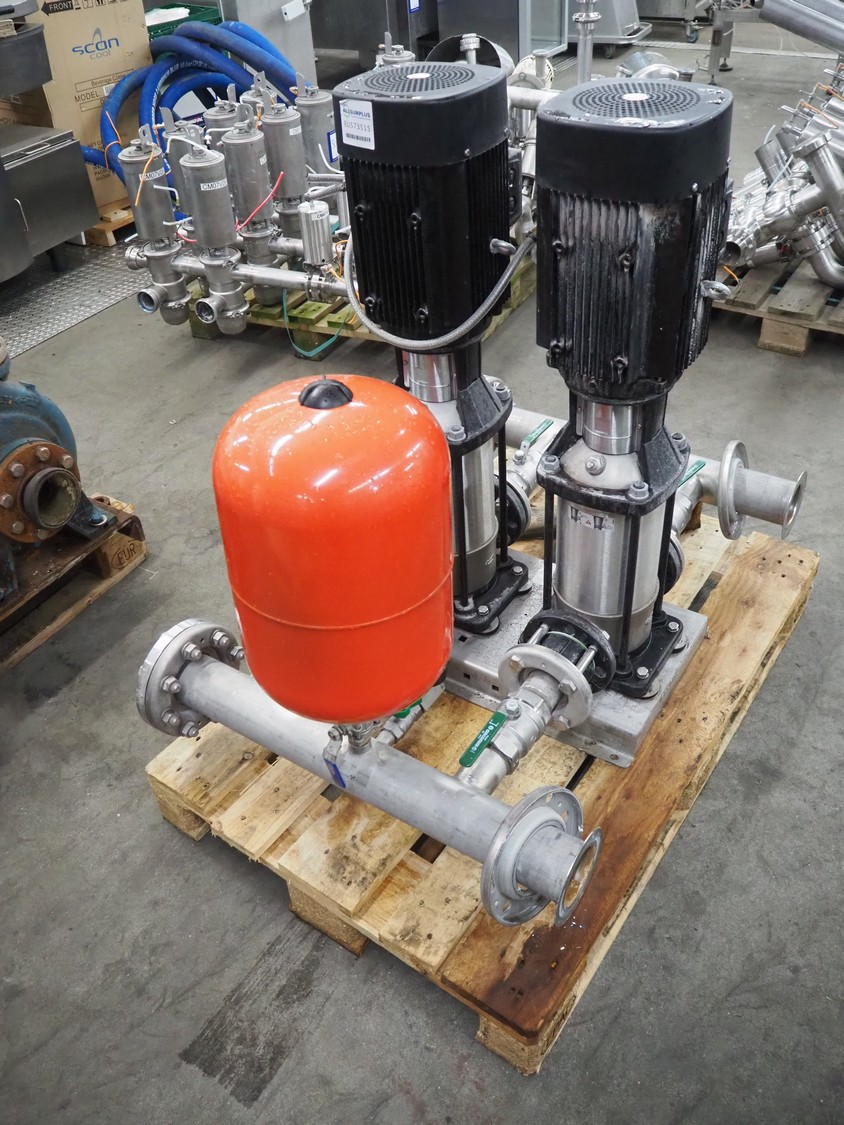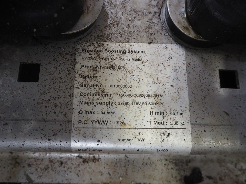 Pressure boosting system with 2 Grundfos centrifugal pumps, model: A96501914P31325, type: CRI15-05 A-FGJ-I-E-HQQE, capacity: 17 m³ per hour, dimensions: 1200 mm x 800 mm x 1000 mm.