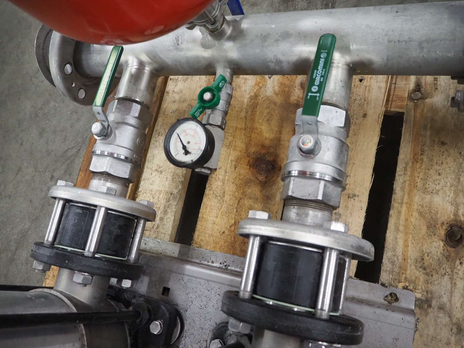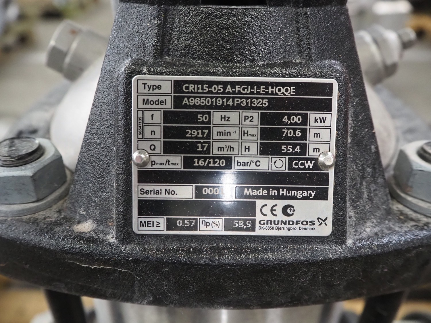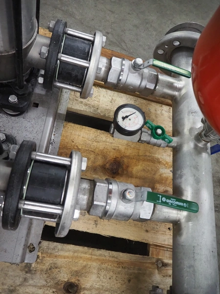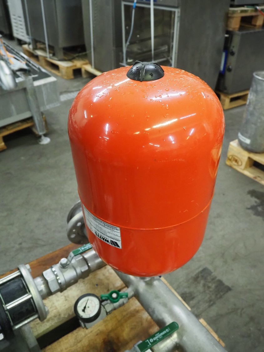 Pressure boosting system with 2 Grundfos centrifugal pumps, model: A96501914P31325, type: CRI15-05 A-FGJ-I-E-HQQE, capacity: 17 m³ per hour, dimensions: 1200 mm x 800 mm x 1000 mm.