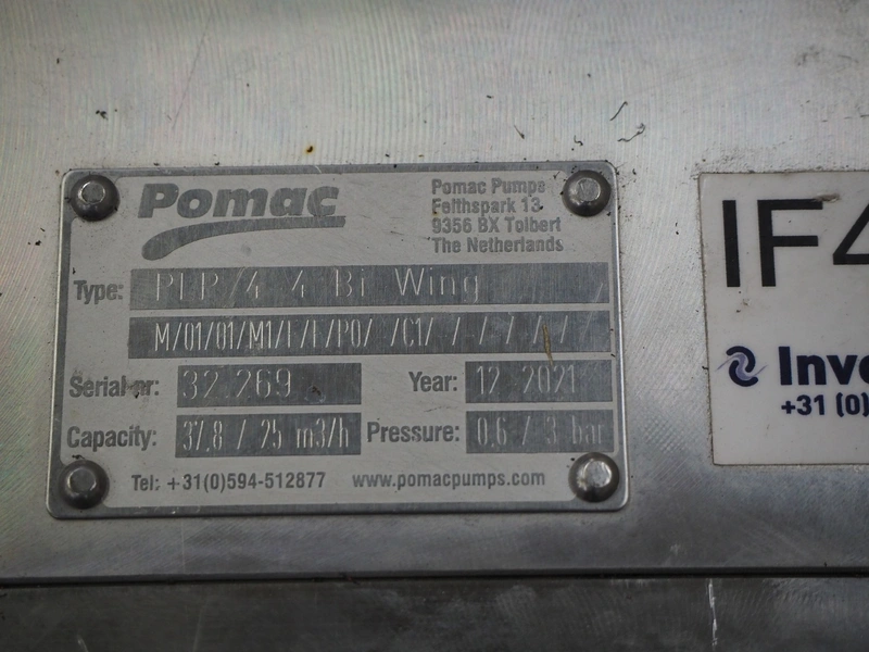 Pomac lobe pump, type: PLP 4-4 Bi Wing, serial number: 32 269, year of construction: 12/2021, capacity: 37.8/ 25 m³ per hour, dimensions: 1480 mm x 550 mm x 750 mm.