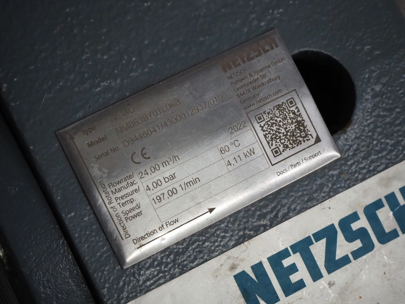 Netzsch progressing cavity pump, type: NM063BY01L06B, serial number: D9446041/4300012937/0100, year of construction: 2022, 4.11 kW, capacity: 24 m³ per hour, dimensions: 220 mm x 350 mm x 450 mm.
