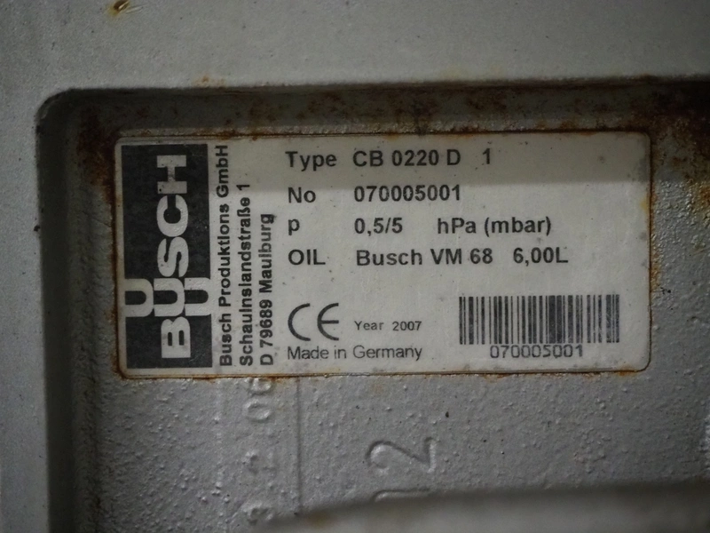 Busch vacuum pump, CB 0220 D 1, number: 070005001, capacity: 220 m³ per hour, dimensions: 1100 mm x 300 mm x 600 mm.