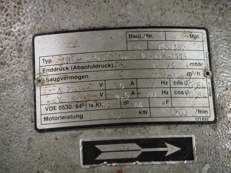 Rietschle vacuum pump, type: VFS 220 80 (01), year of construction: 2008, 1450 rates per minute, capacity: 220 / 80 m³ per hour, dimensions: 960 mm x 430 mm x 620 mm.