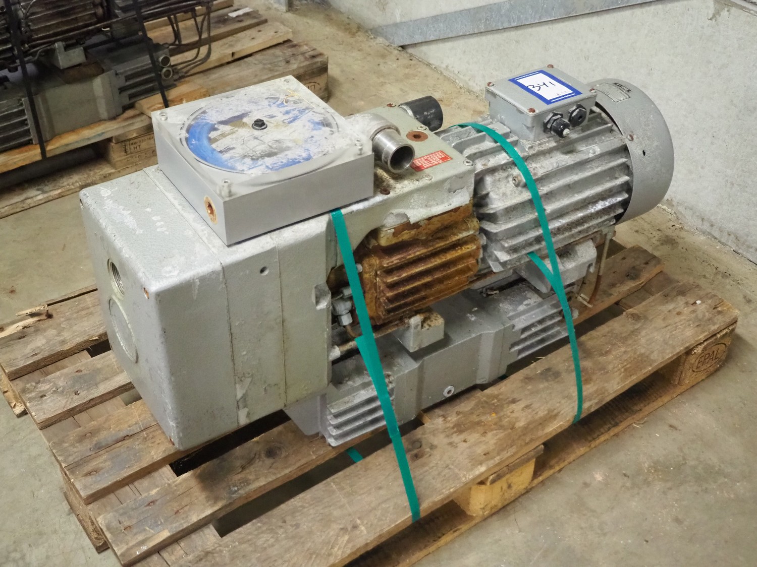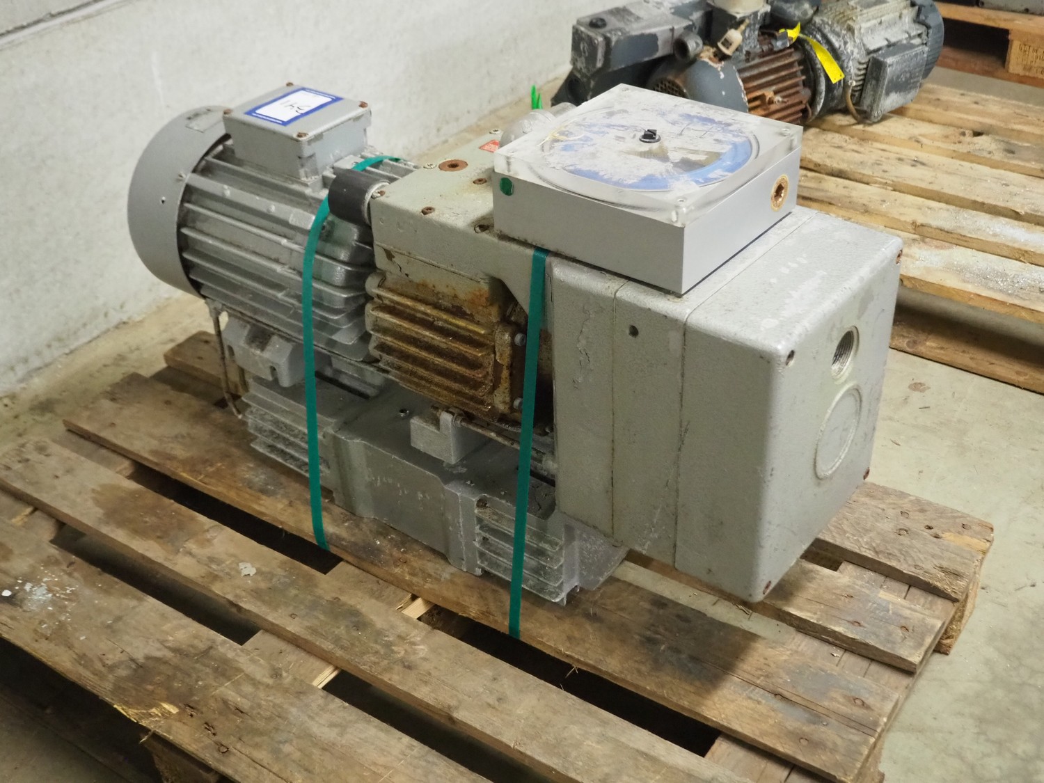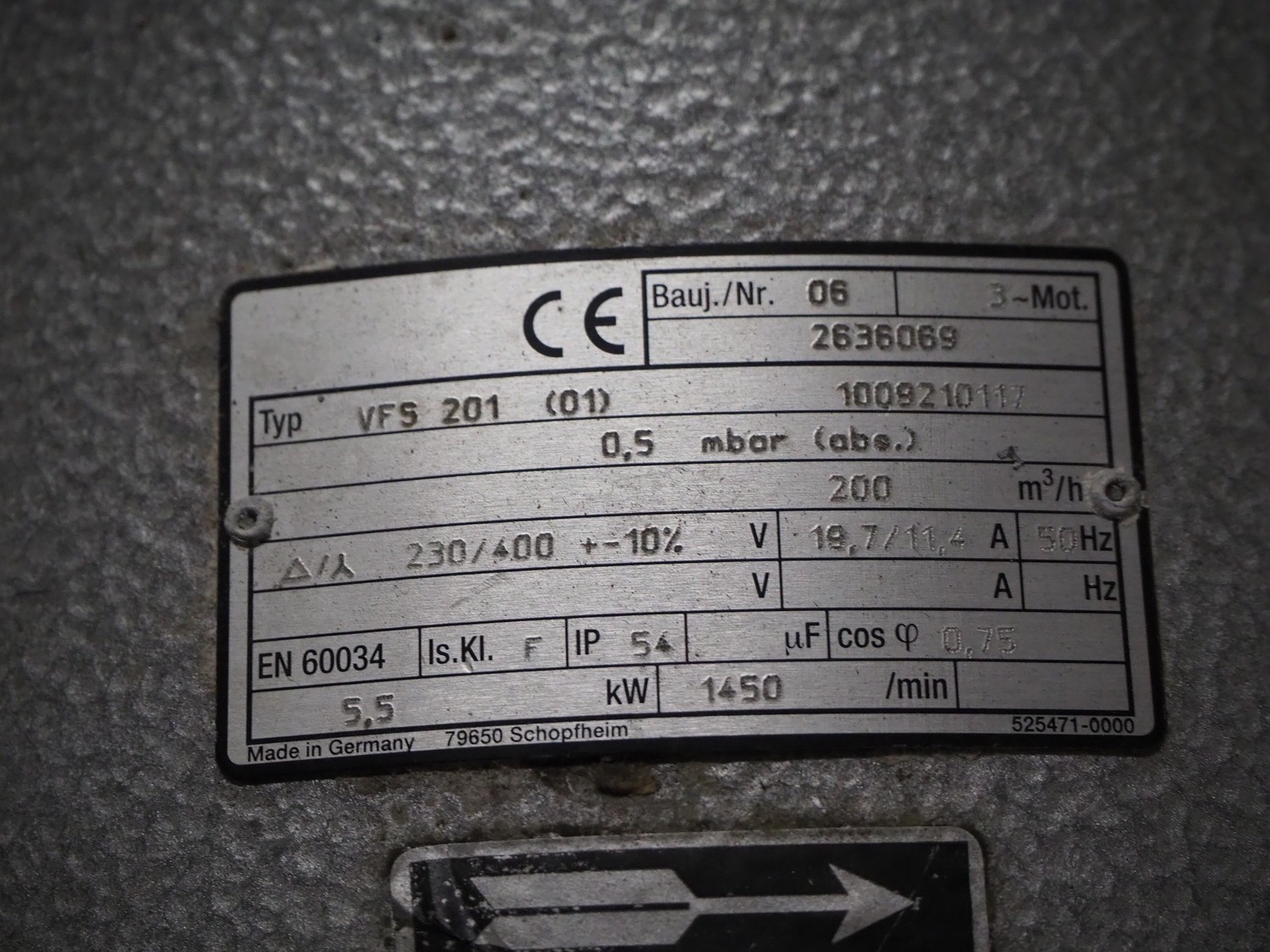 Rietschle vacuum pump, type: VFS 201 (01), serial number: 2636069, year of construction: 2006, 230/400 V, 50 Hz, 19.7/11.4 A, 1450 rates per minute, capacity: 200 m³ per hour, dimensions: 960 mm x 300 mm x 600 mm.