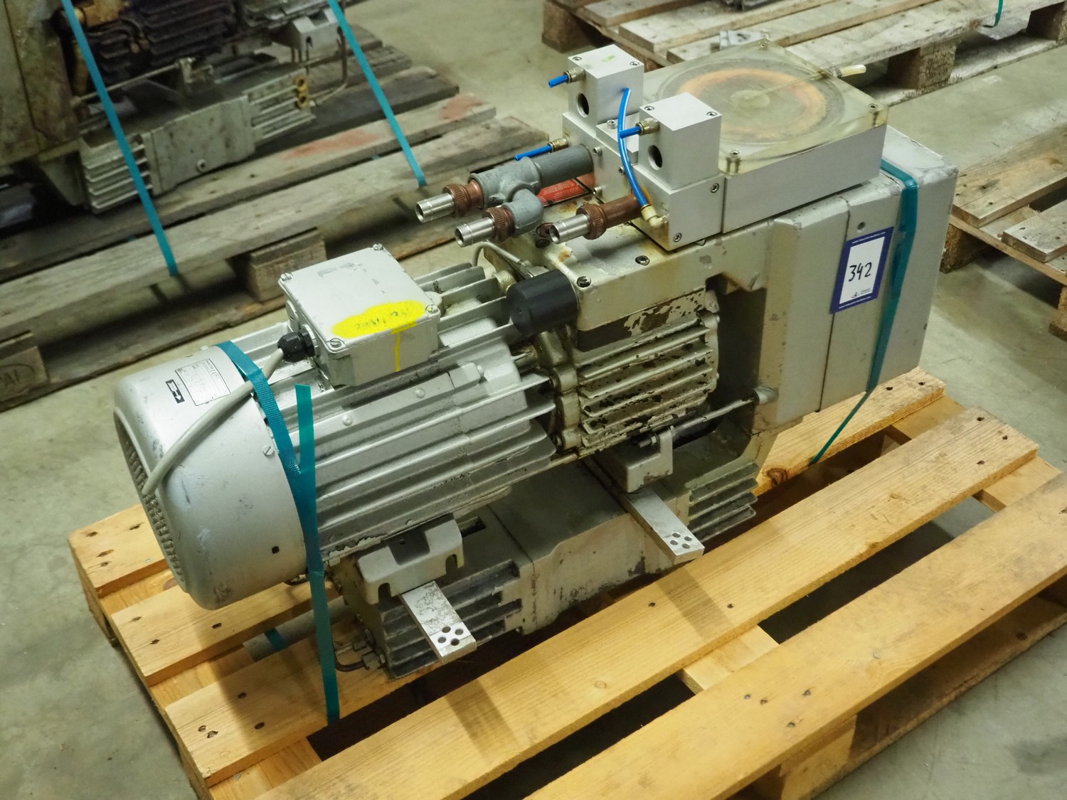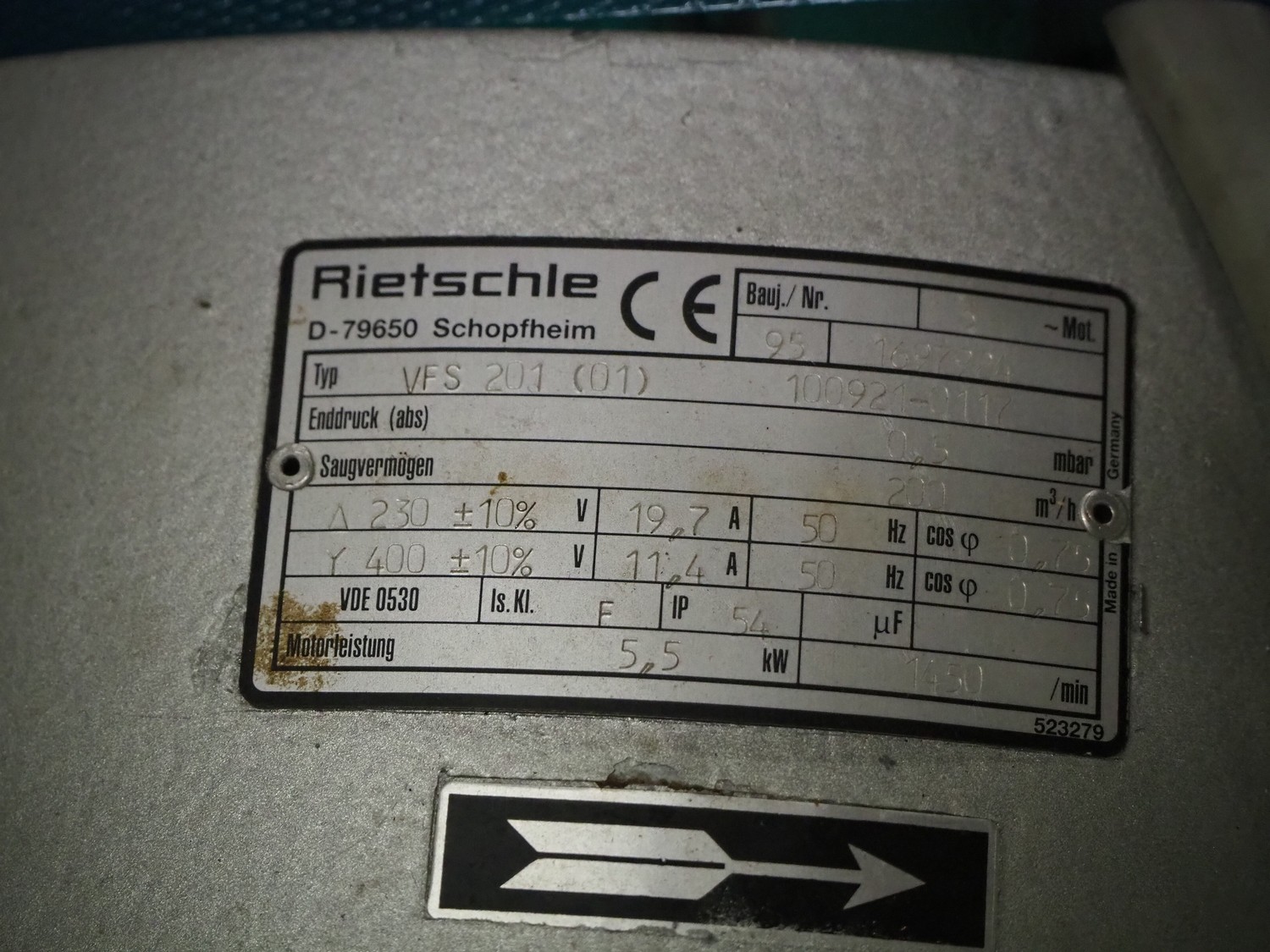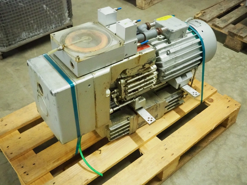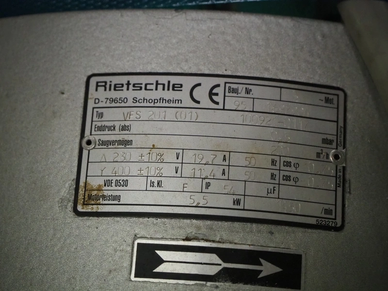 Rietschle vacuum pump, type: VFS 201 (01), serial number: 1697924, year of construction: 1995, 1450 rates per minute, capacity: 200 m³ per hour, dimensions: 960 mm x 430 mm x 620 mm.