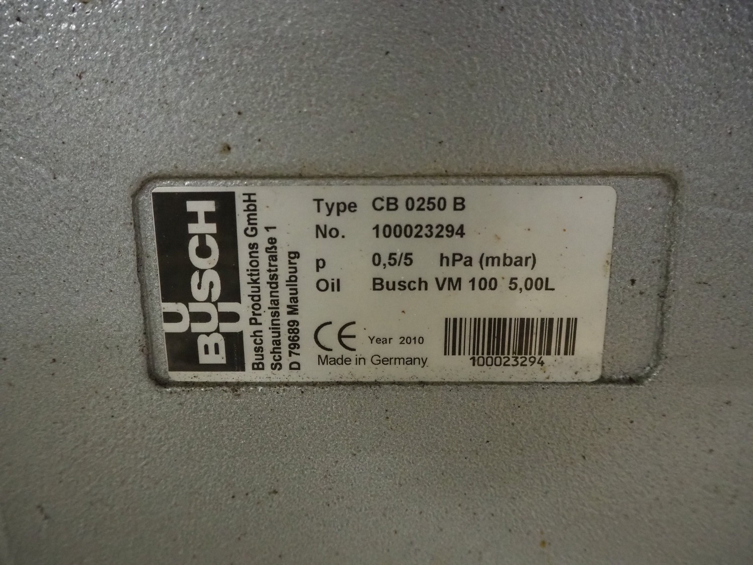 Busch vacuum pump, type: CB 0250 B, serial number: 100023294, capacity: 250 m³ per hour, dimensions: 1000 mm x 500 mm x 420 mm.