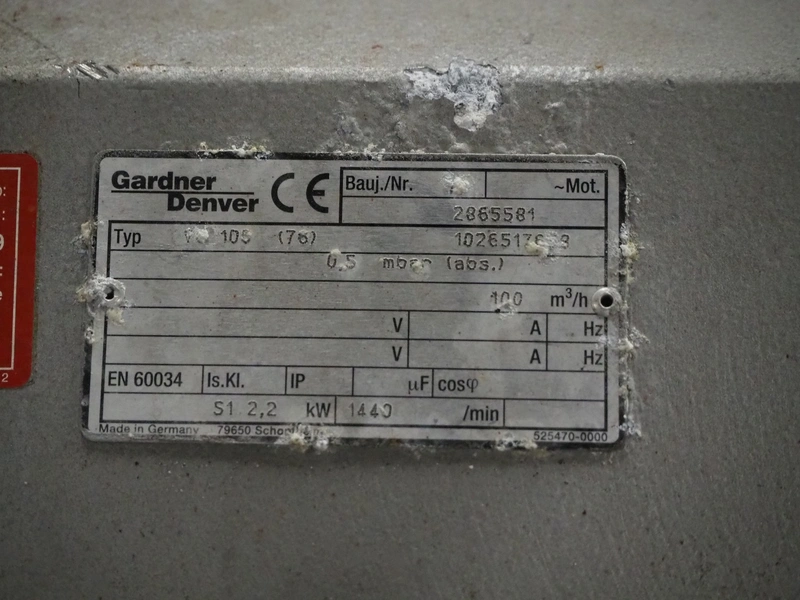 Gardner Denver vacuum pump, type: VC 150 (76), number: 2865581, capacity: 100 m³ per hour, dimensions: 700 mm x 420 mm x 300 mm.