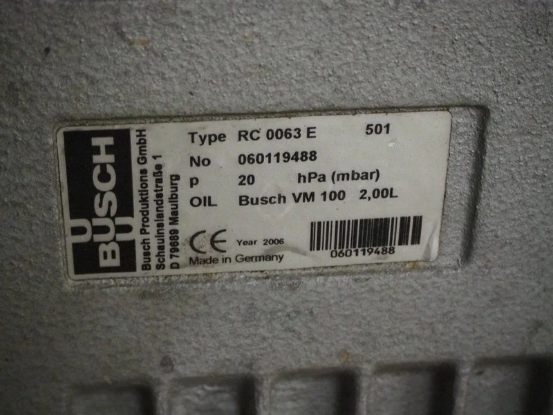 Busch vacuum pump, type: RC 0063 E 501, number: 060119488, year of construction: 2006, capacity: 60 m³ per hour, dimensions: 600 mm x 400 mm x 300 mm.