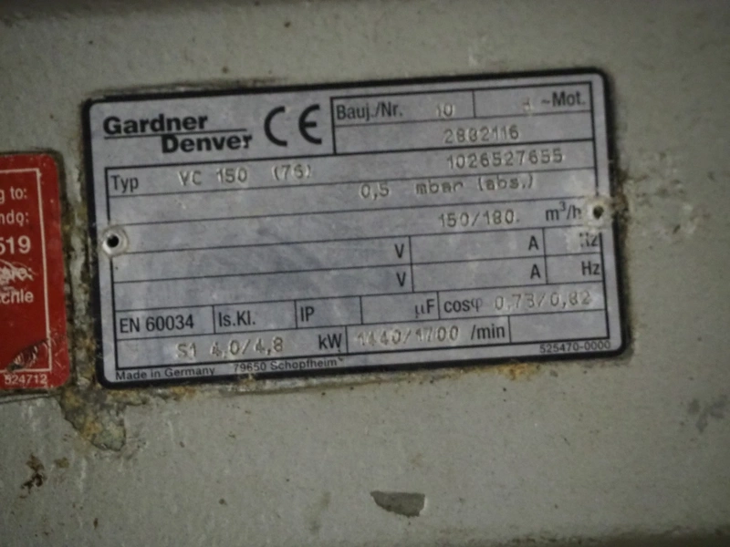Gardner Denver vacuum pump, type: VC 150 (75), number: 1026527655, year of construction: 2010, capacity: 150/180 m³ per hour, dimensions: 750 mm x 400 mm x 600 mm.