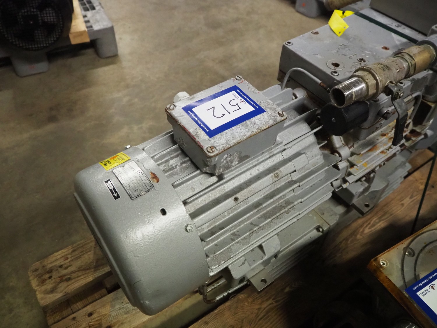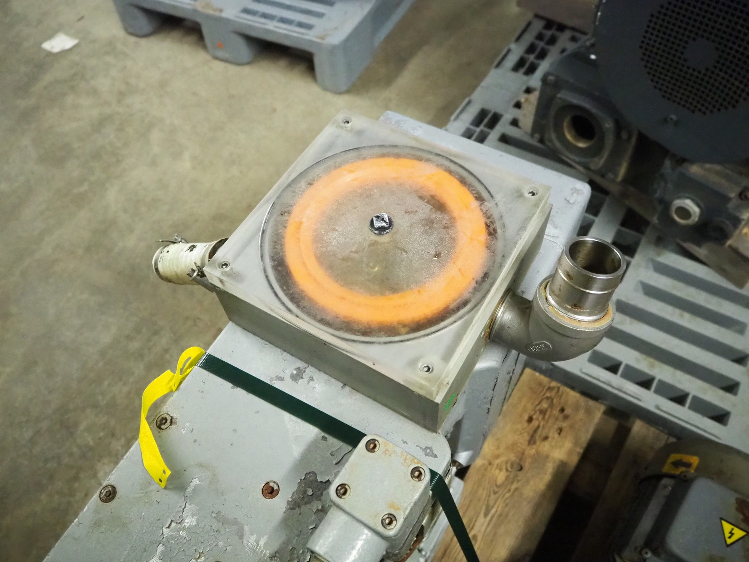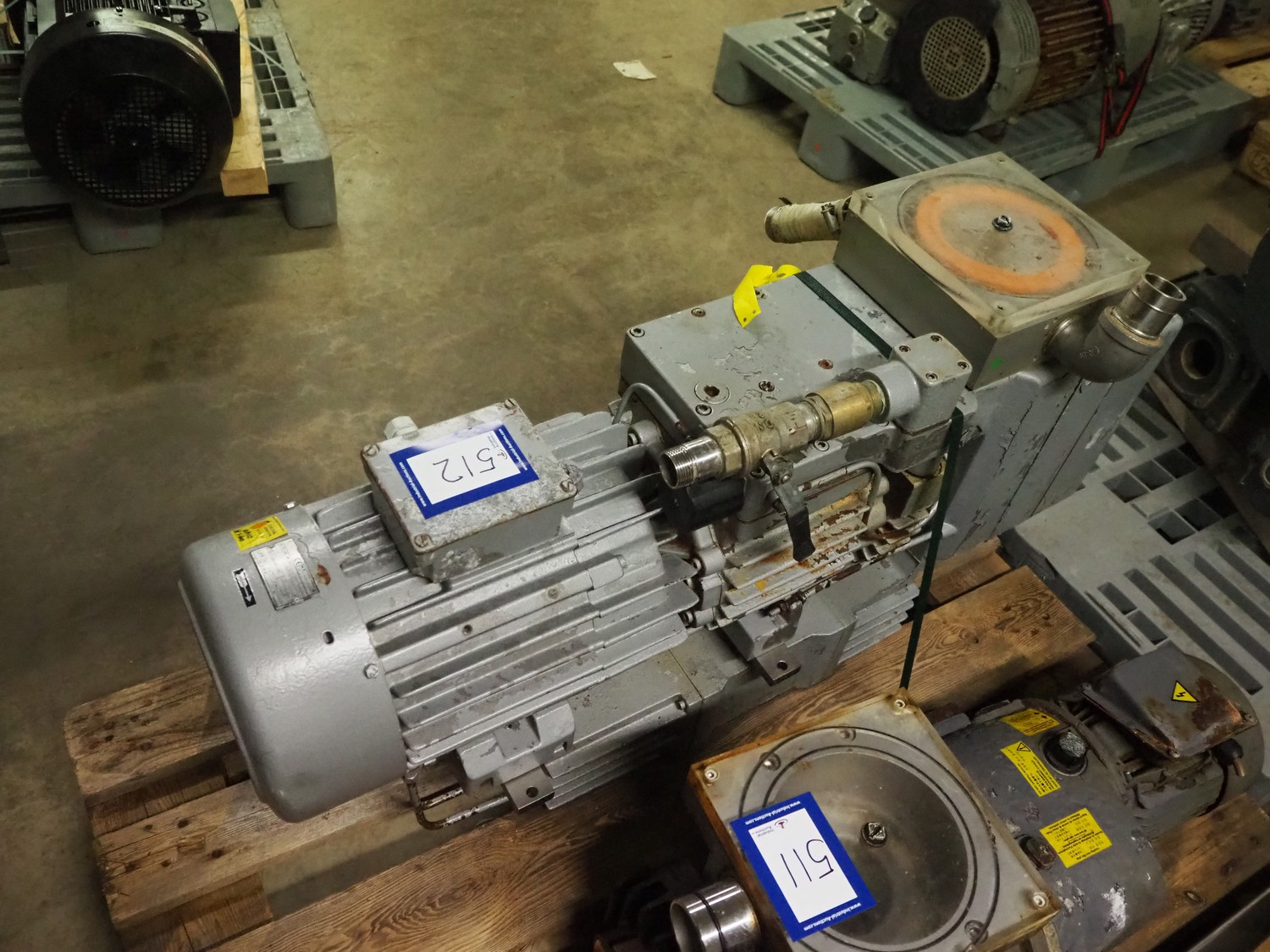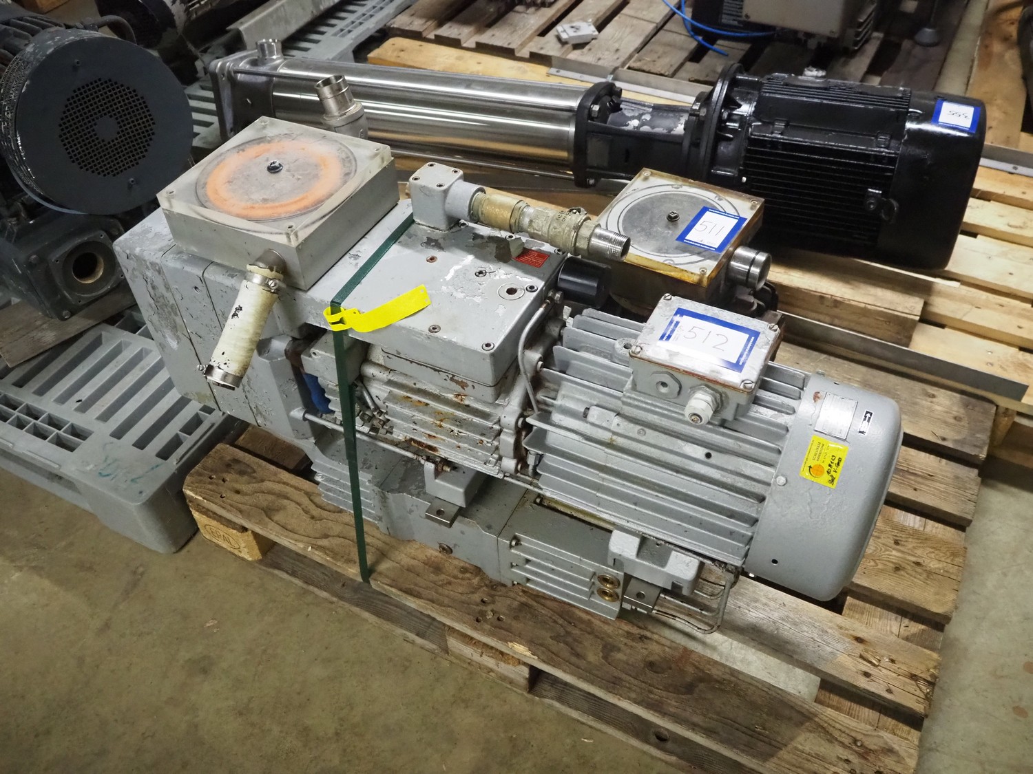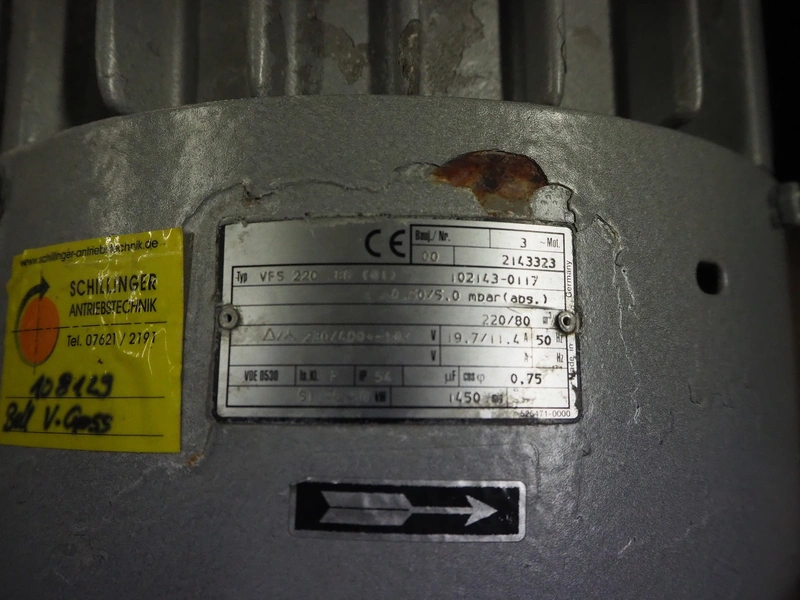 Rietschle vacuum pump, type: VFS 220 80 (01), number: 2143323, year of construction 2000, 1450 rates per minute, capacity: 220 / 80 m³ per hour, dimensions: 1050 mm x 300 mm x 600 mm.