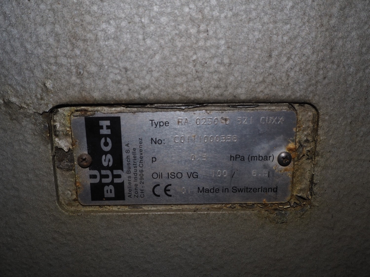 Busch vacuum pump, type: RA 0250 D 5ZI CUXX, number: C0111000356, capacity: 250 m³ per hour, dimensions: 1000 mm x 550 mm x 400 mm.