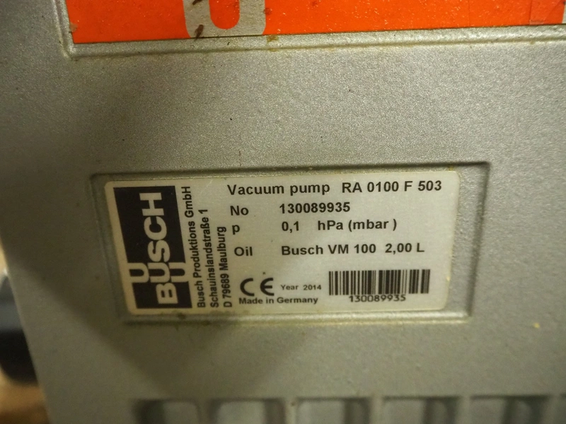 Busch vacuum pump, type: RA 0100 F 503, number: 130089935, year of construction: 2014, capacity: 100 m³ per hour, dimensions: 680 mm x 650 mm x 330 mm.
