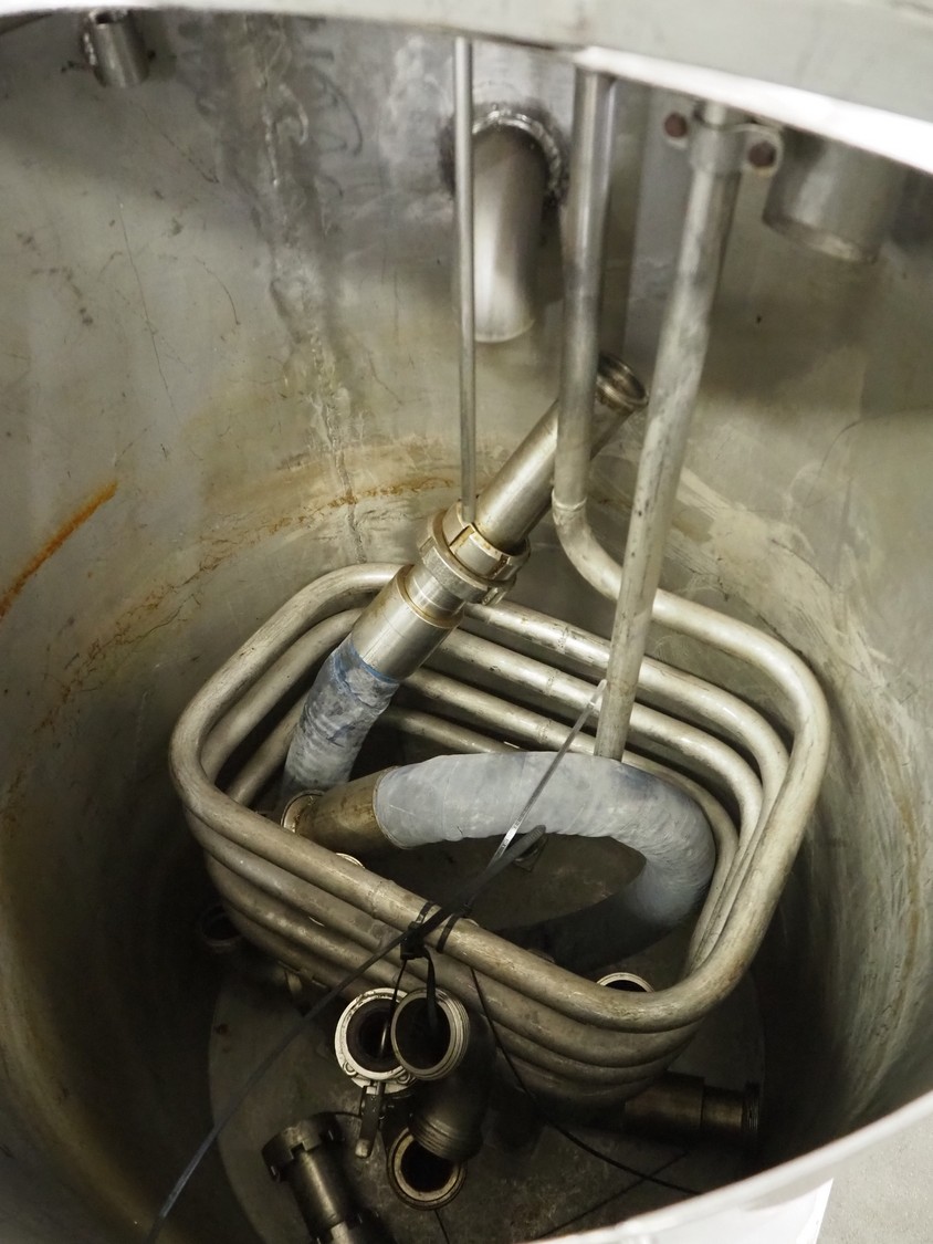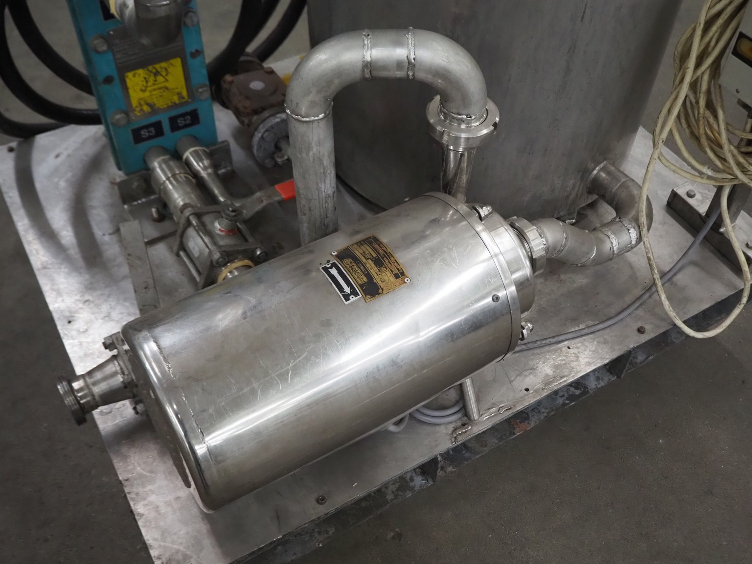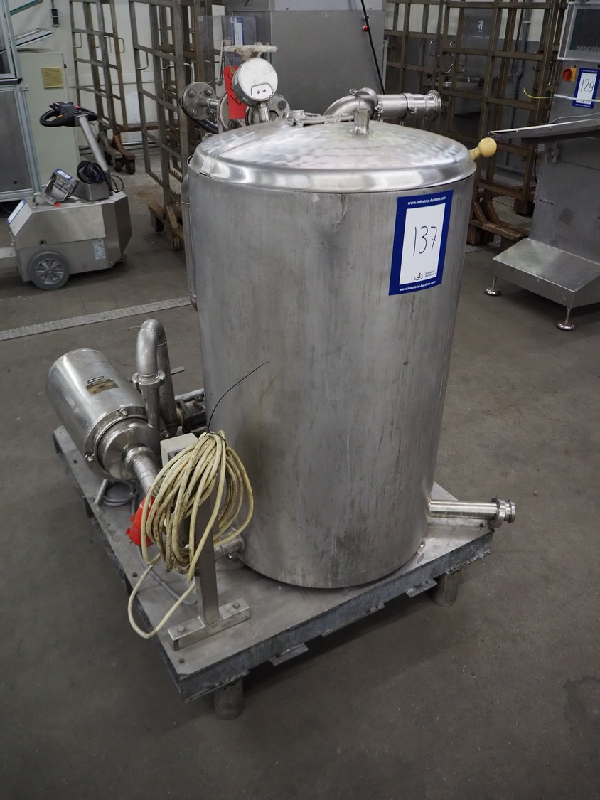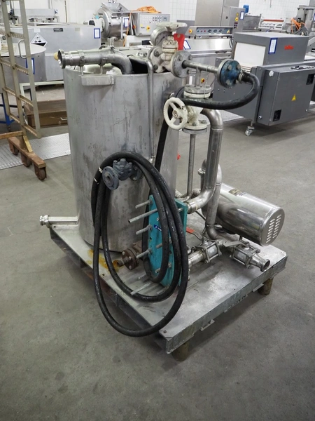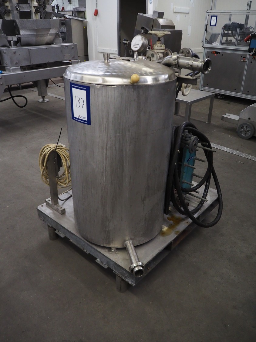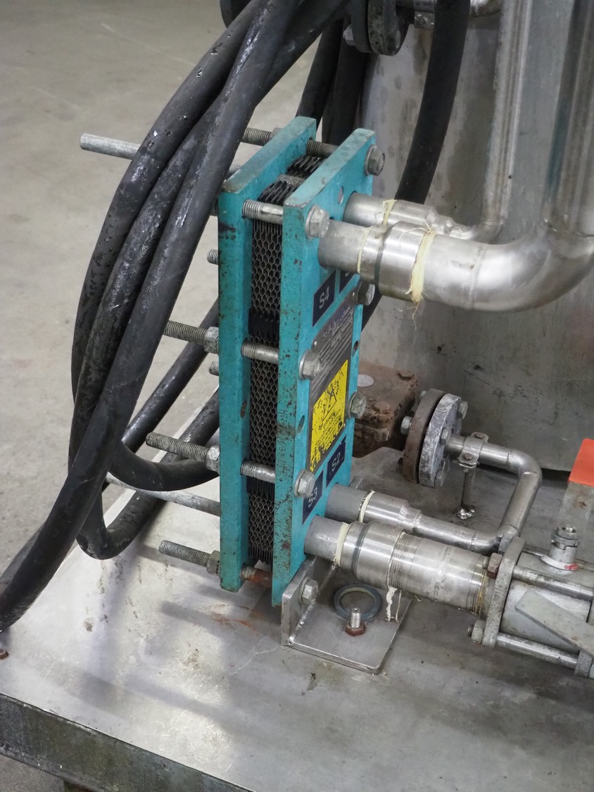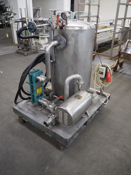 Hidro Mechanika heating tank on steel frame with Alfa Laval plate heat exchanger, type heating tank: HCLK-50-16, year of construction 1999, 4 kW, type heat exchanger: M3-FG, number: 30104-54430, year of construction: 1997, volume: 1liter, dimensions tank: Ø 700 mm x 1100 mm, total dimensions: 1300 mm x 1100 mm x 1600 mm.