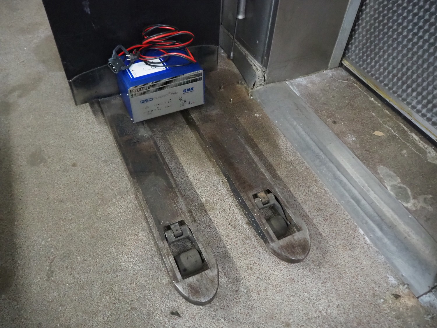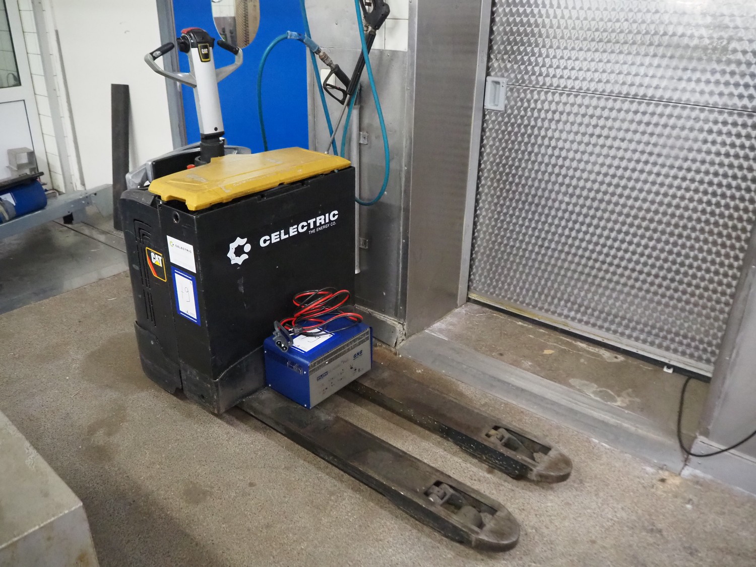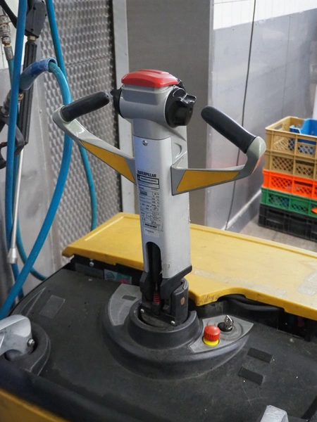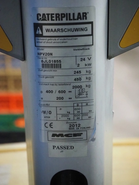 Caterpillar electric forklift, fork length: 1150 mm, total dimensions: 2400 mm x 800 mm x 1500 mm. Including IEB battery charger, type: E 230 G 24/40 B1-FML Puls, dimensions: 360 mm x 240 mm x 240 mm.