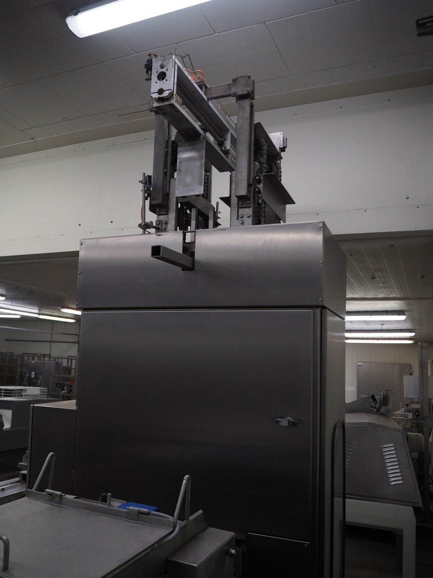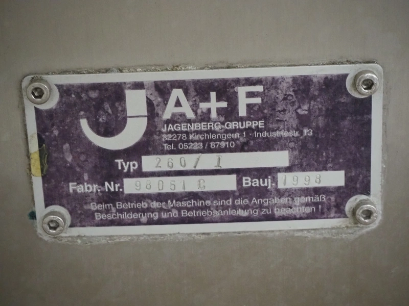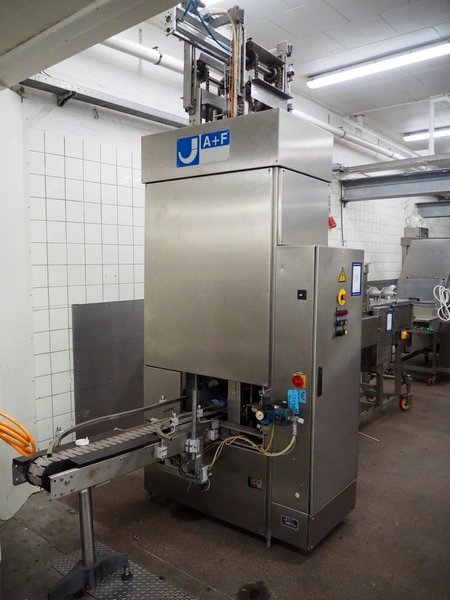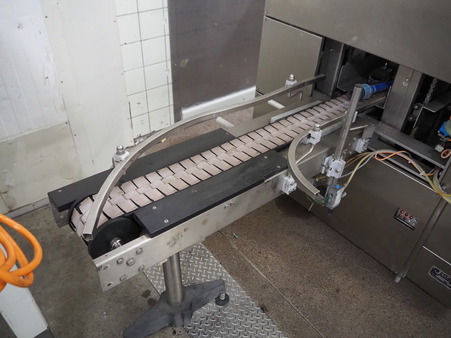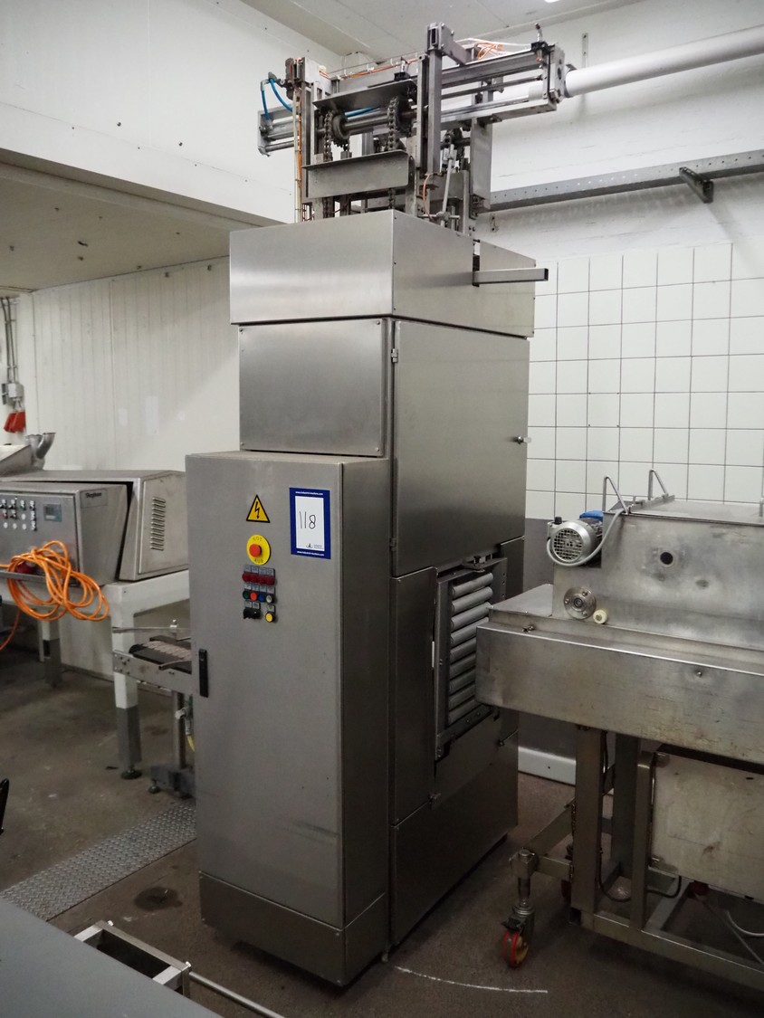 JA+F lifter for boxes, type: 260/I, fabrication number: 98041C, year of construction: 1998, plastic infeed belt, belt width: 120 mm, dimensions lifting divider: 400 mm x 230 mm x 100 mm, plastic rollers, roller width: 280 mm, total dimensions: 2500 mm x 1300 mm x 3000 mm.