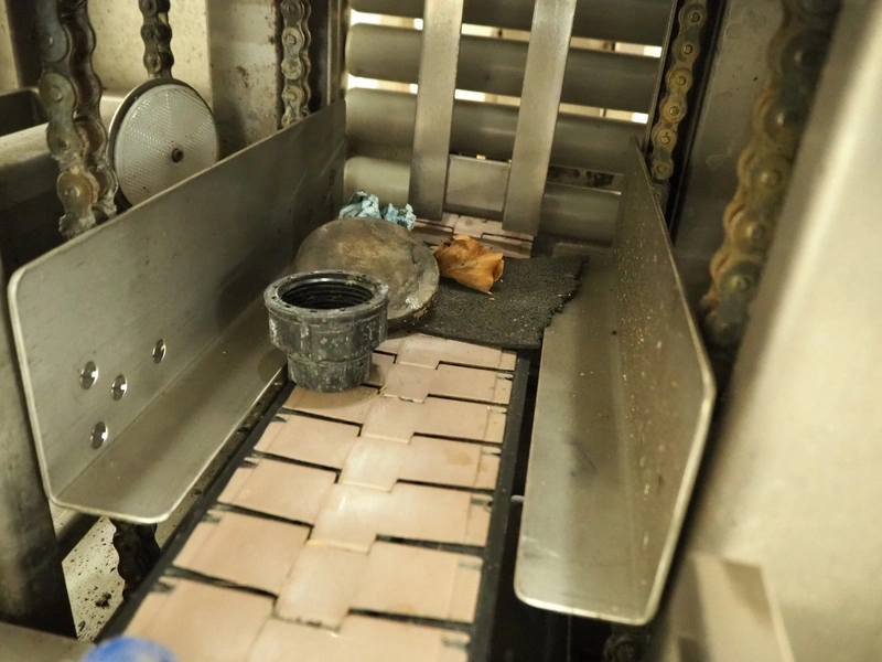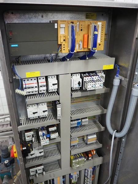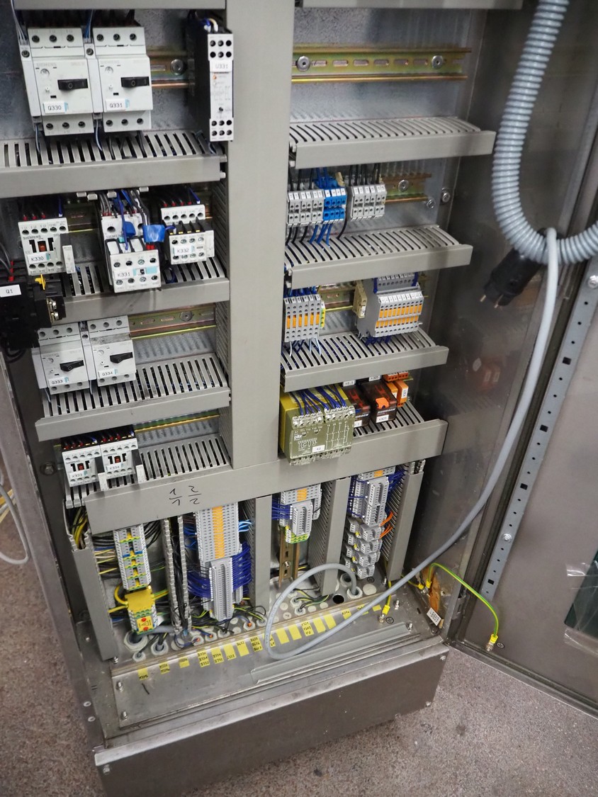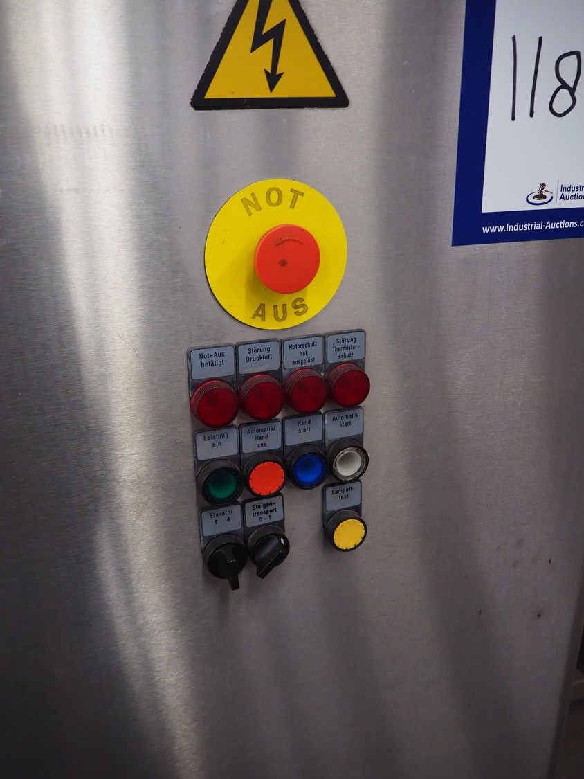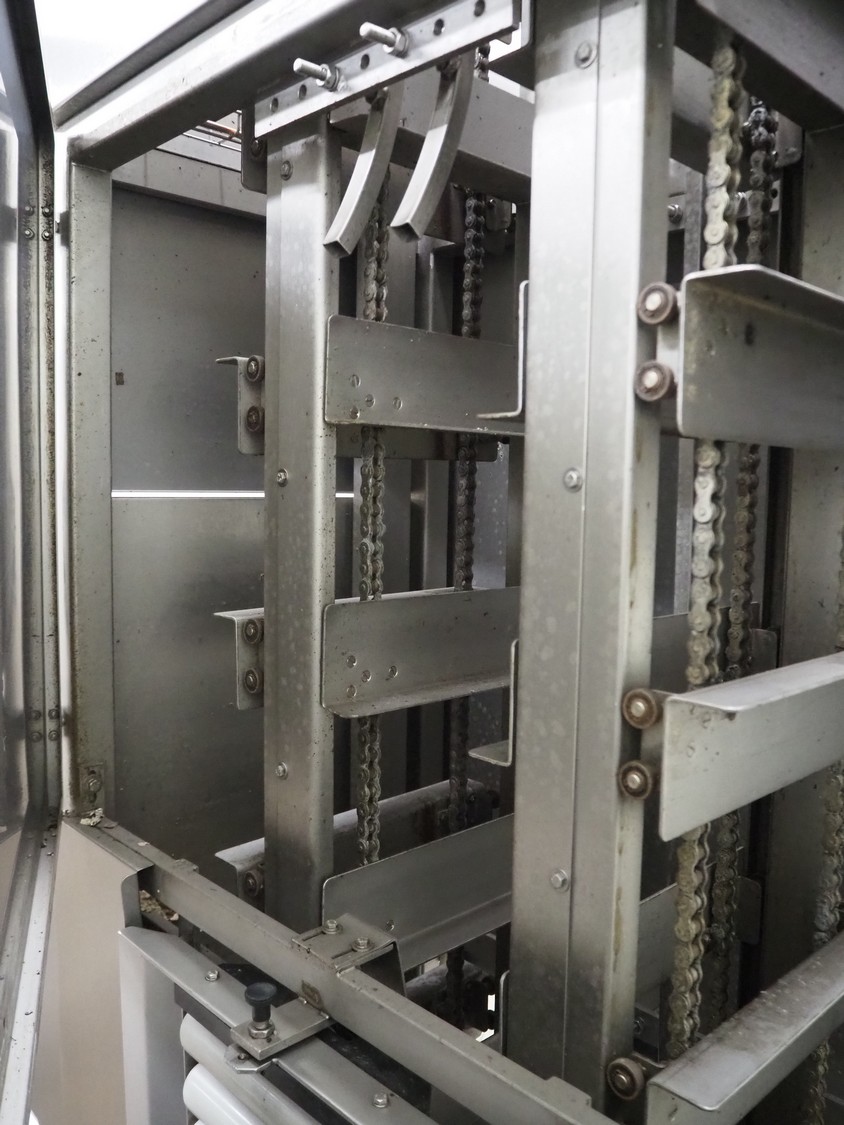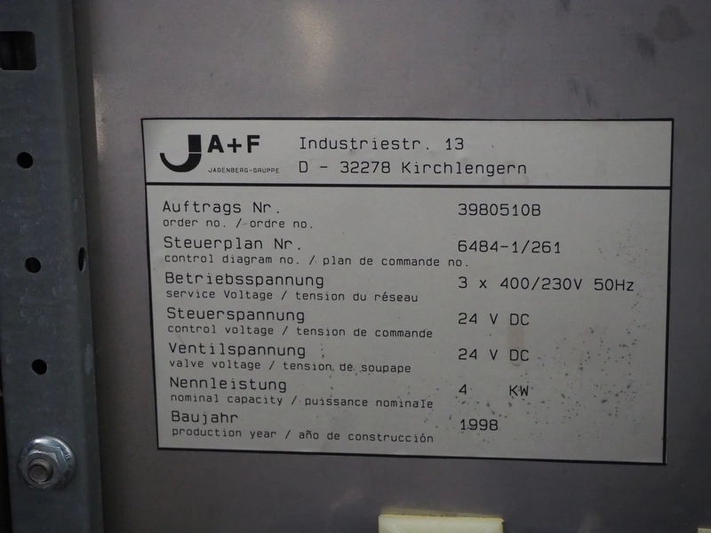 JA+F lifter for boxes, type: 260/I, fabrication number: 98041C, year of construction: 1998, plastic infeed belt, belt width: 120 mm, dimensions lifting divider: 400 mm x 230 mm x 100 mm, plastic rollers, roller width: 280 mm, total dimensions: 2500 mm x 1300 mm x 3000 mm.