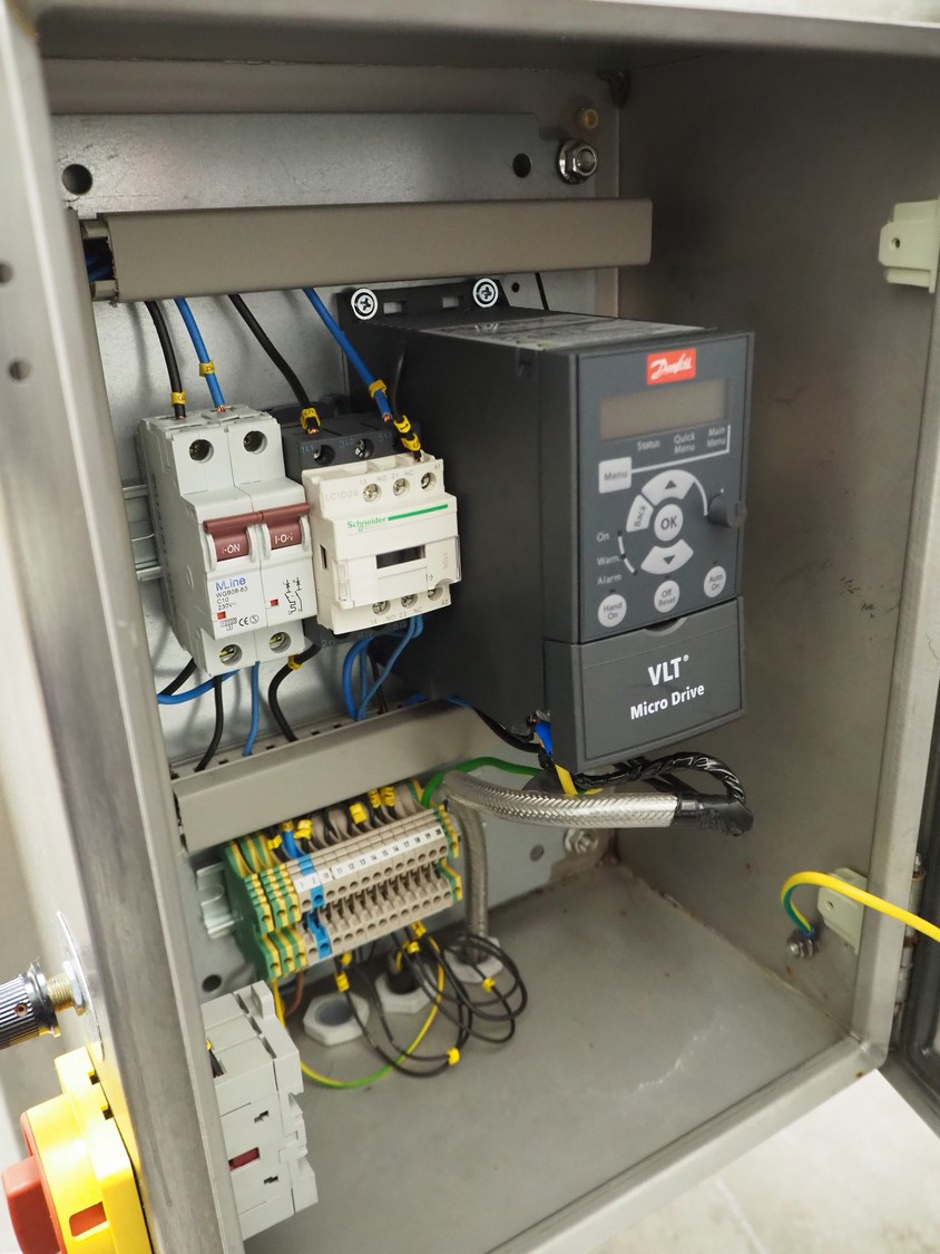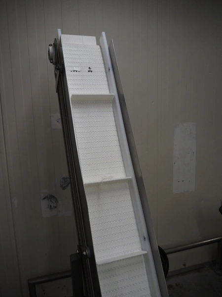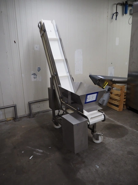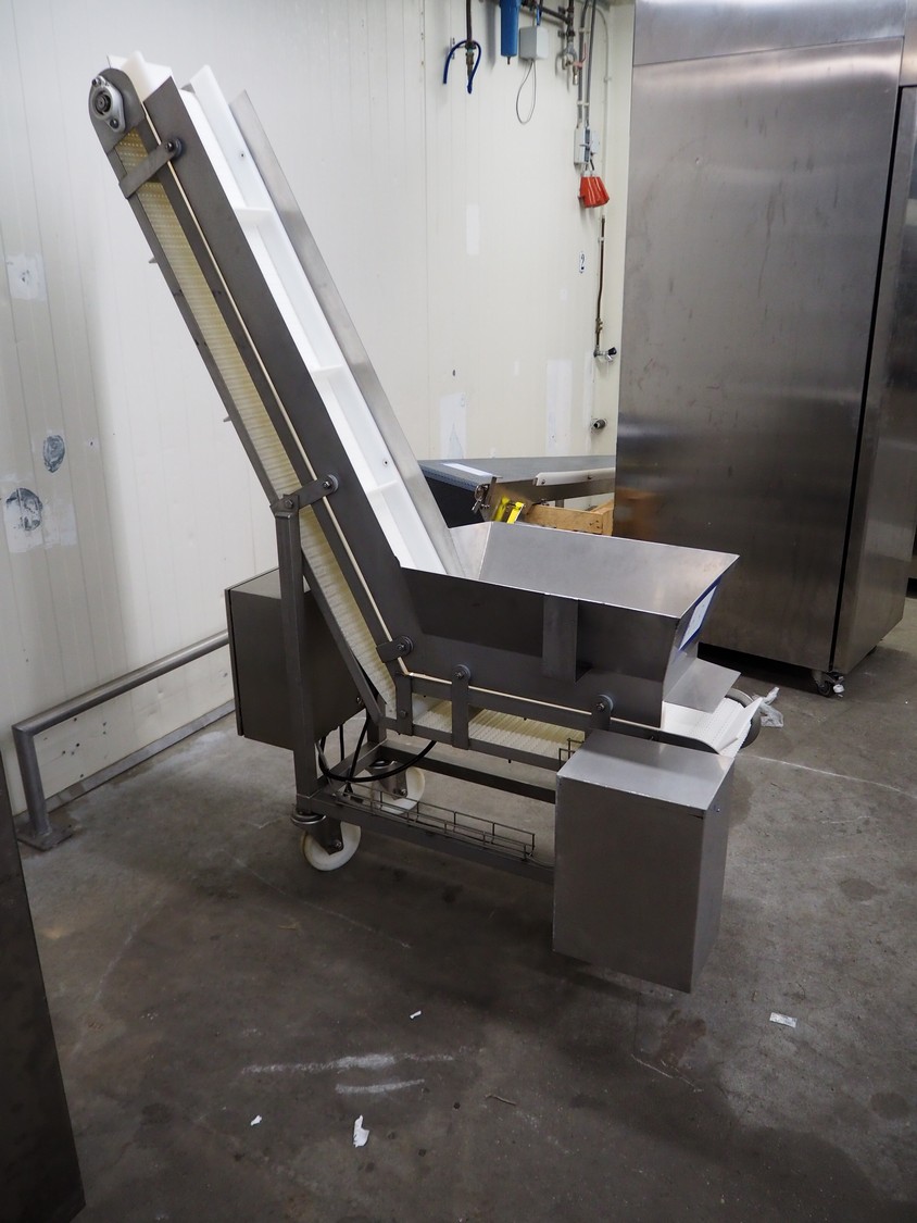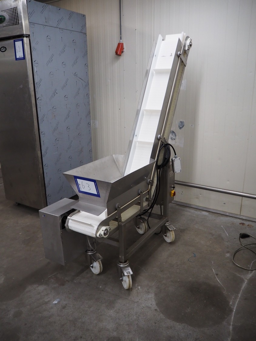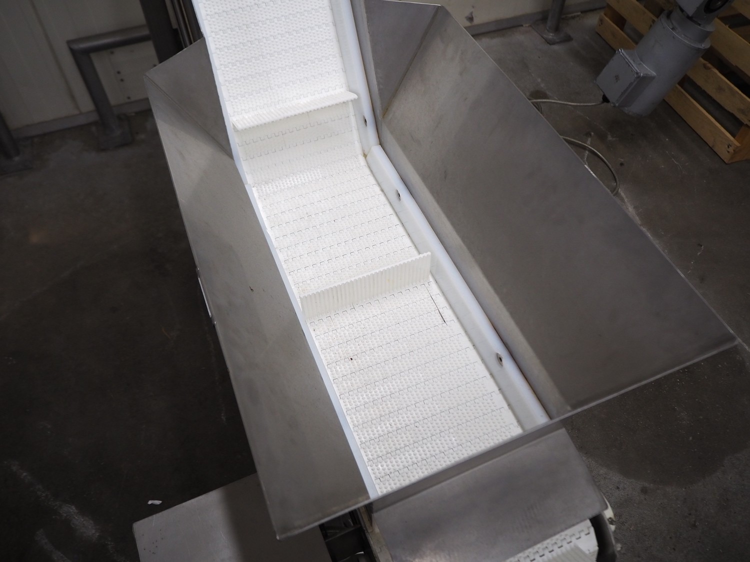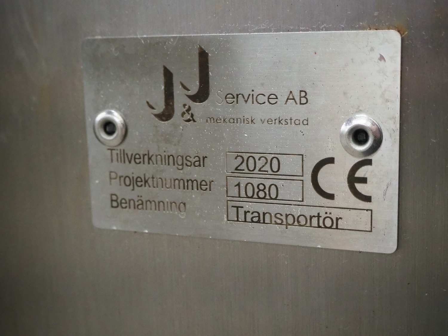 J&J service AB mobile elevating belt, number: 1080, year of construction: 2020, plastic belt with dividers, belt width: 210 mm, dividers height: 60 mm, distance between dividers: 300 mm, elevating height: 1900 mm, total dimensions: 1550 mm x 600 mm x 1960 mm.
