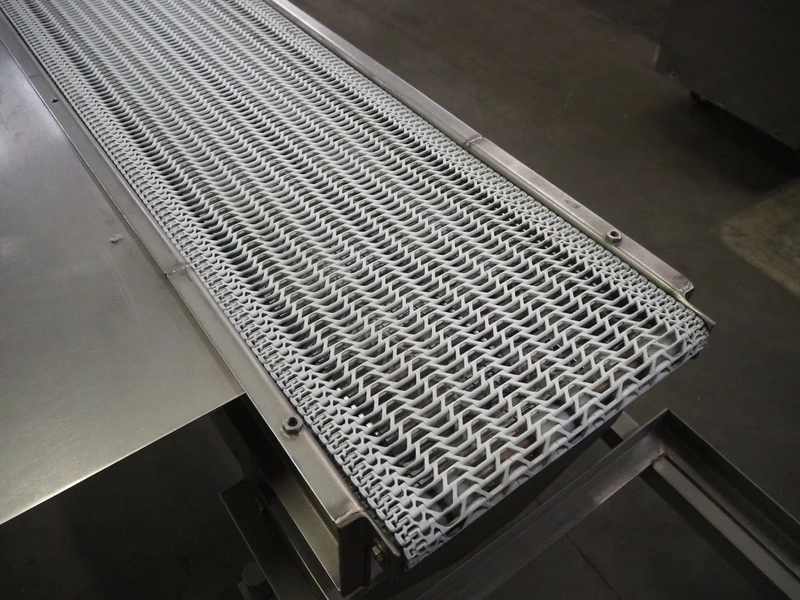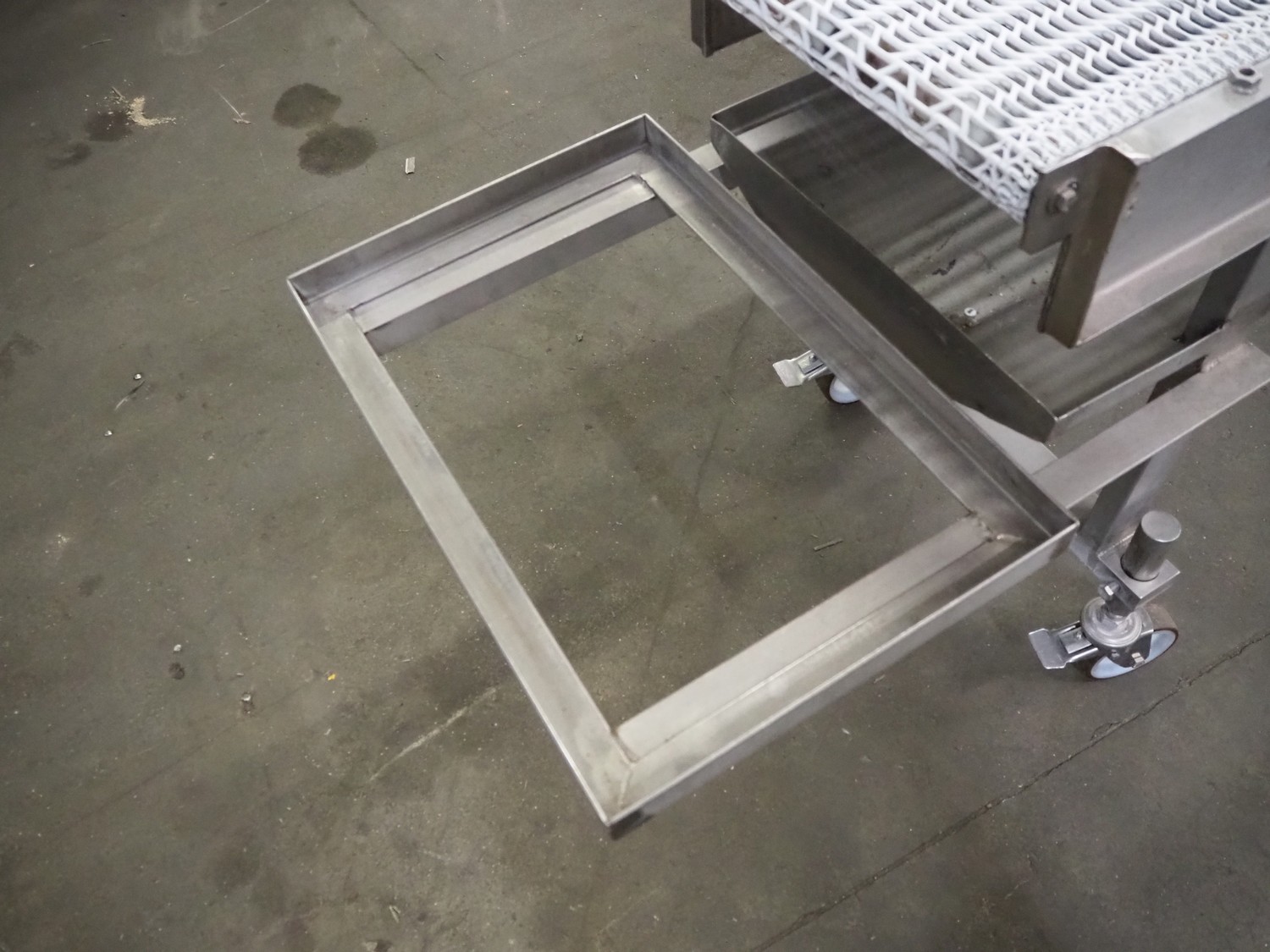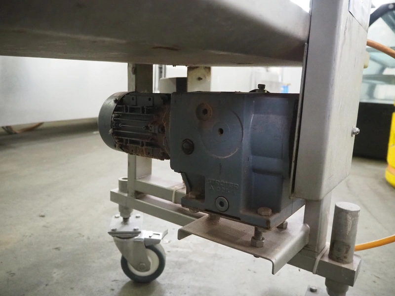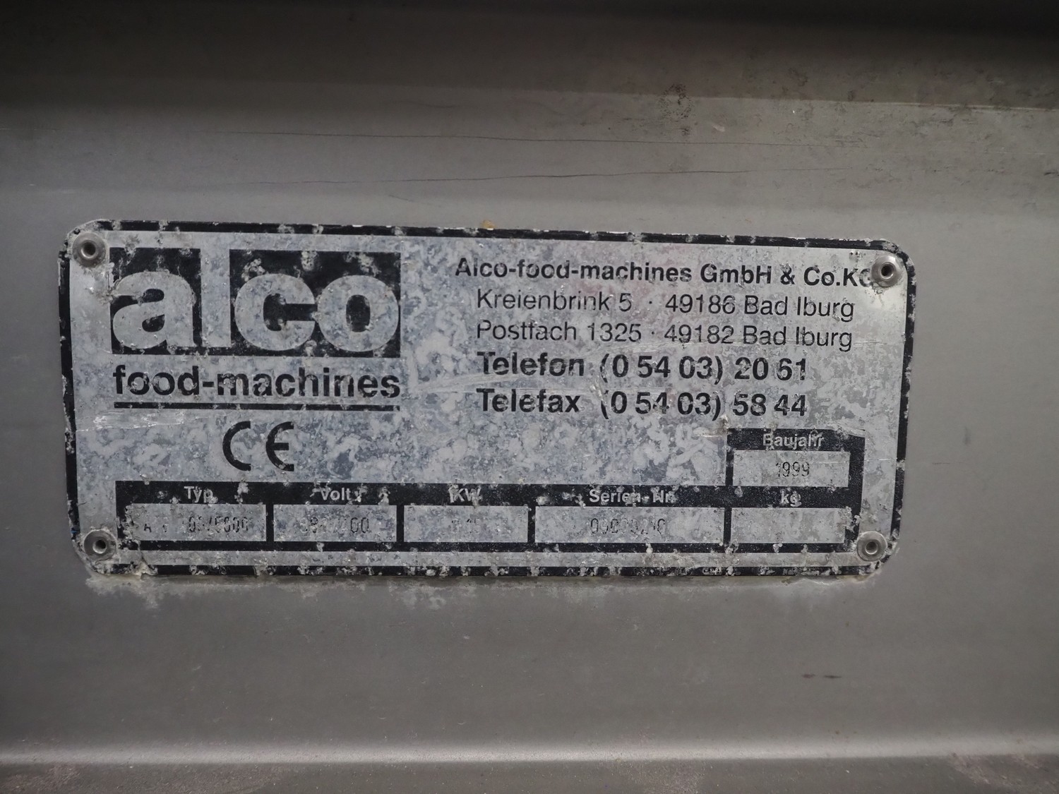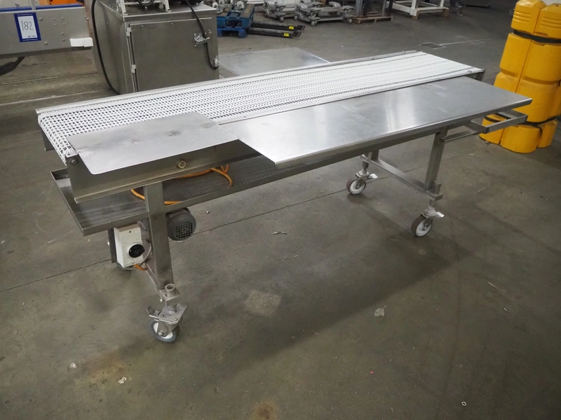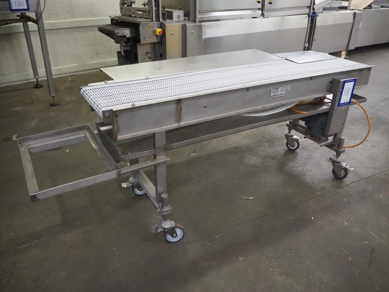 Alco food-machines mobile transport belt, serial number: 0903210, year of construction: 1999, 380 V, 60 Hz, plastic mesh belt, belt width: 410 mm, total dimensions: 2440 mm x 835 mm x 900 mm.