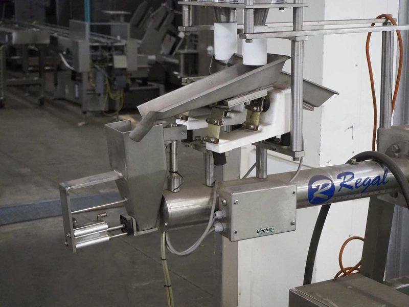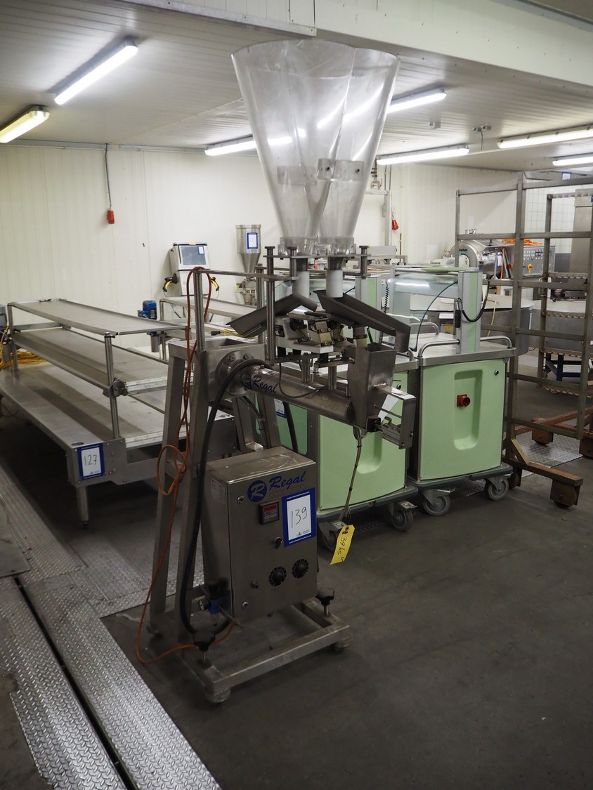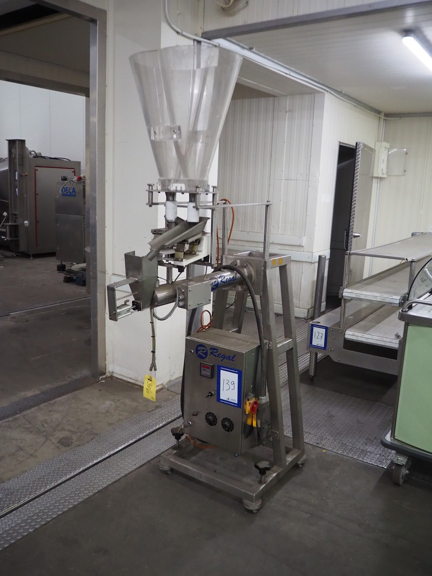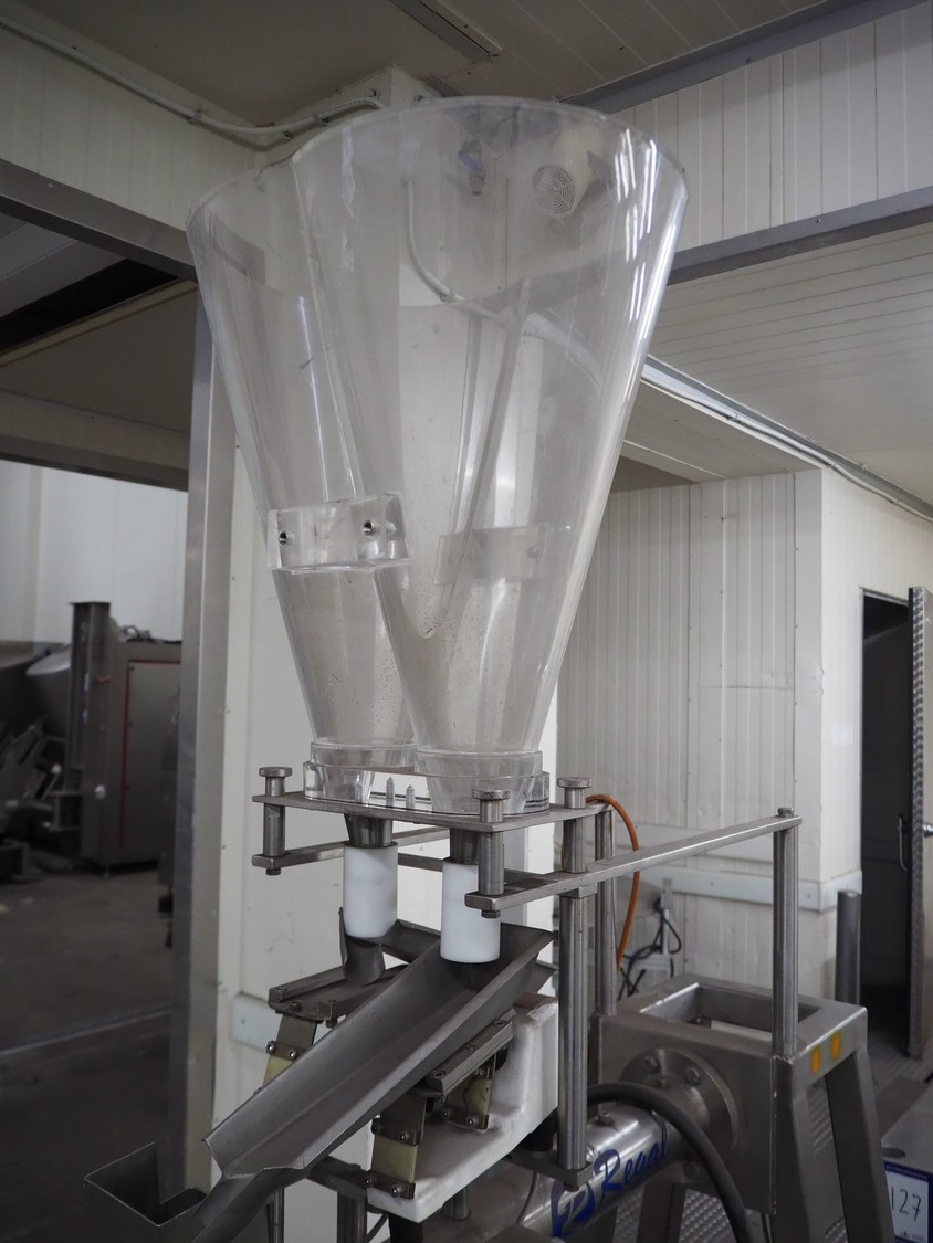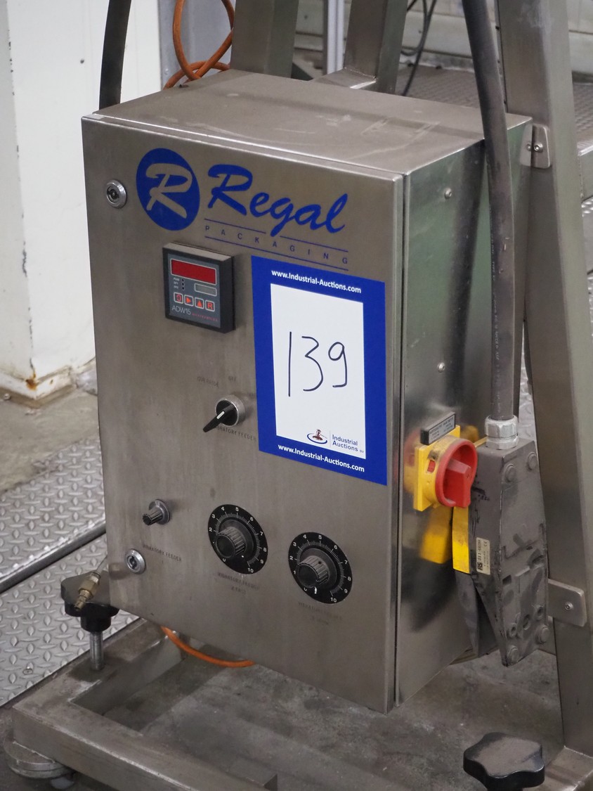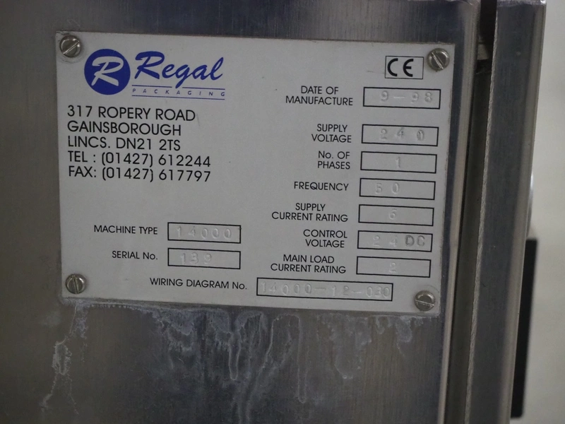 Regal denester with vibration gutter, type: 14000, serial number: 139, year of construction: 9-98, 240 V, 1 Ph, 50 Hz, dimensions gutter: (2x) 360 mm x 70 mm, dimensions funnel output: 90 mm x 90 mm x 230 mm, dimensions funnel input: 40 mm x 30 mm x 450 mm, total dimensions: 1200 mm x 600 mm x 2100 mm.