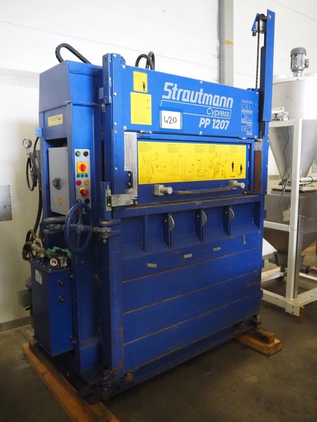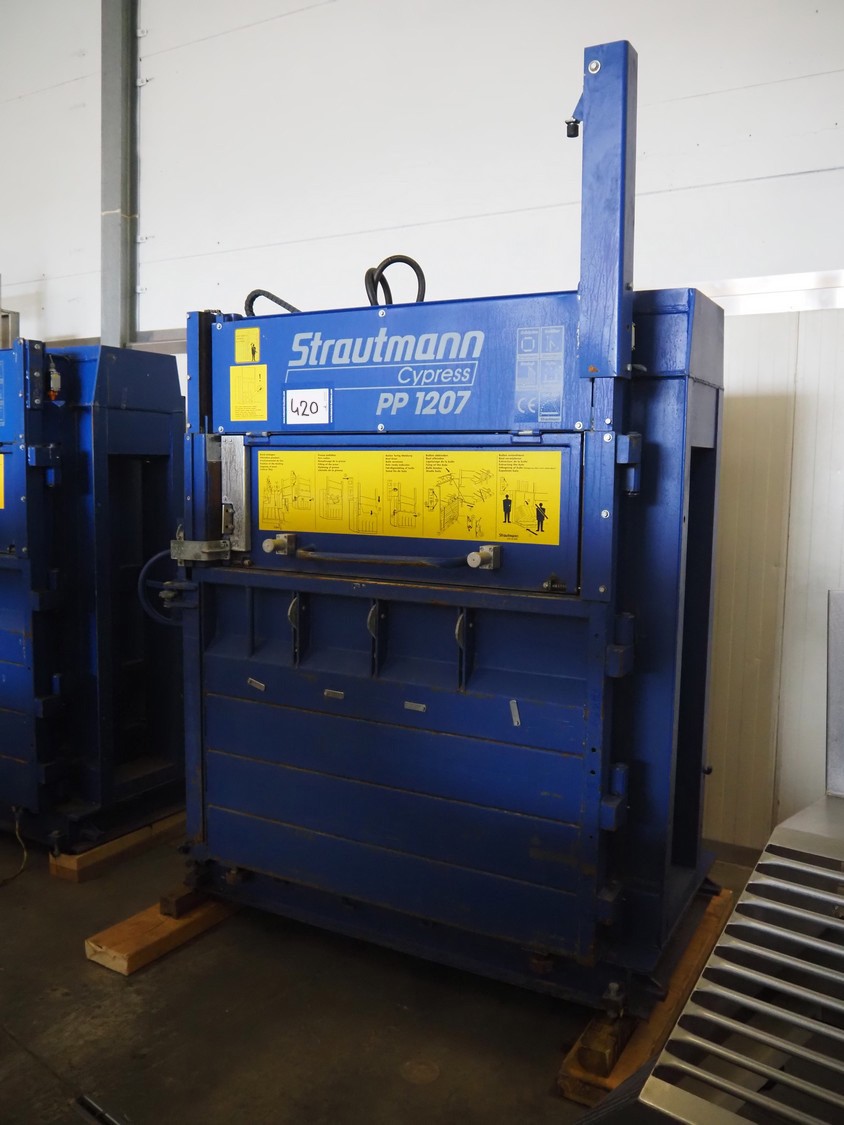 Strautmann baler, type: PP 1207, serial number: 533 02 062, year of construction: 2002, 400 V, 50 Hz, 4 kW, 580 kN, inside dimensions: 1190 mm x 680 mm x 1400 mm, total dimensions: 2400 mm x 1600 mm x 3100 mm.