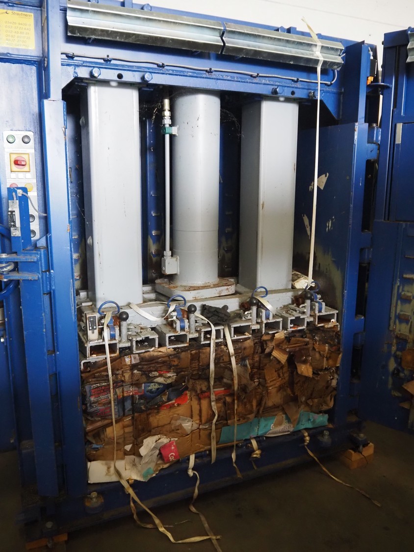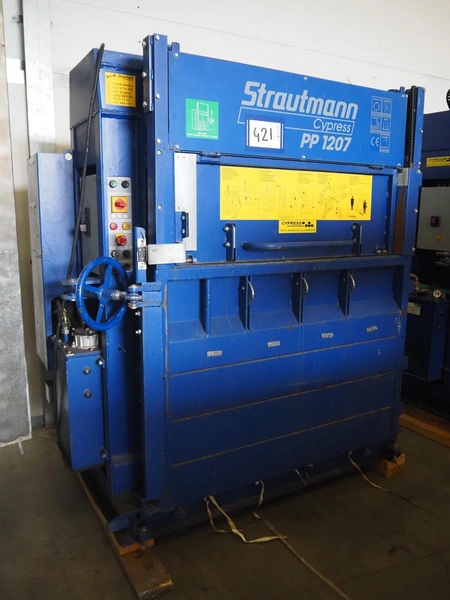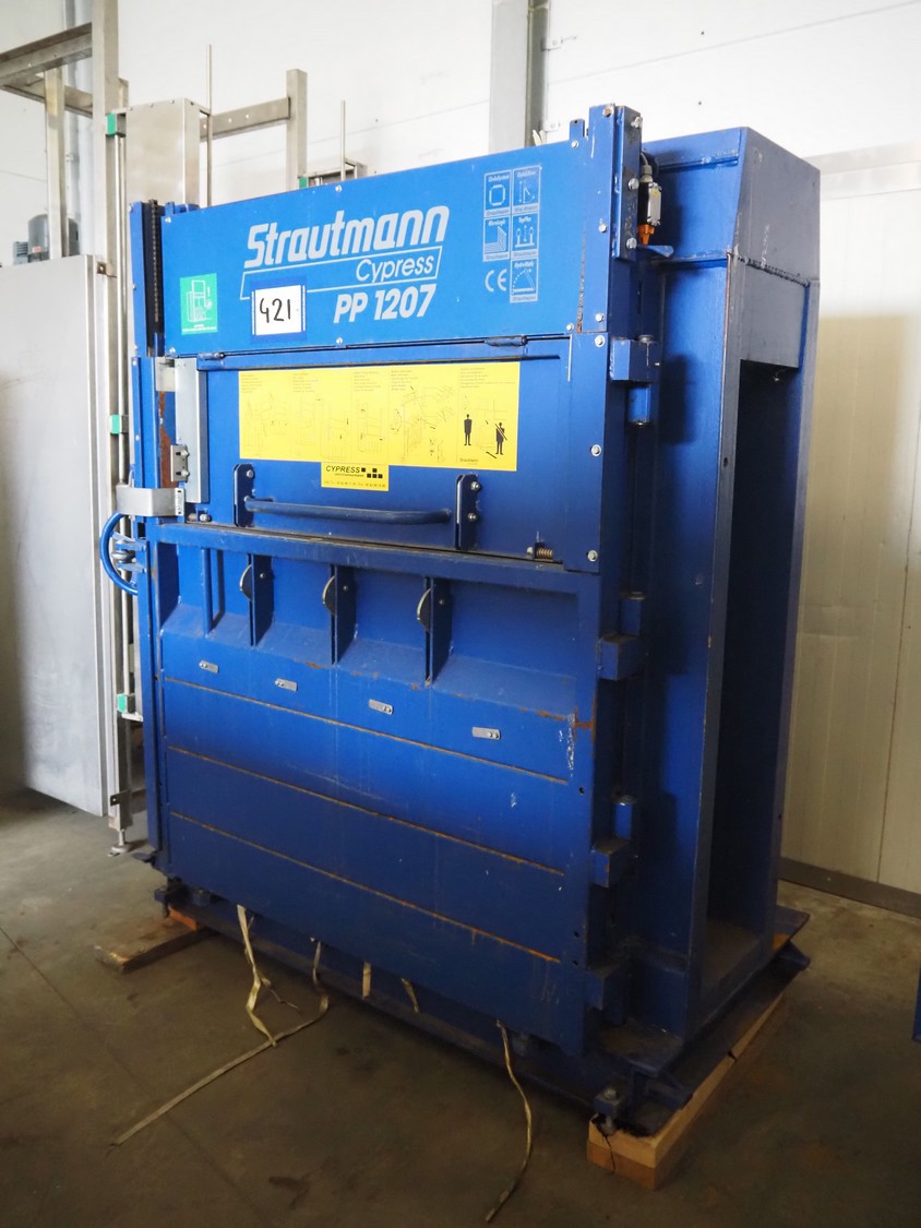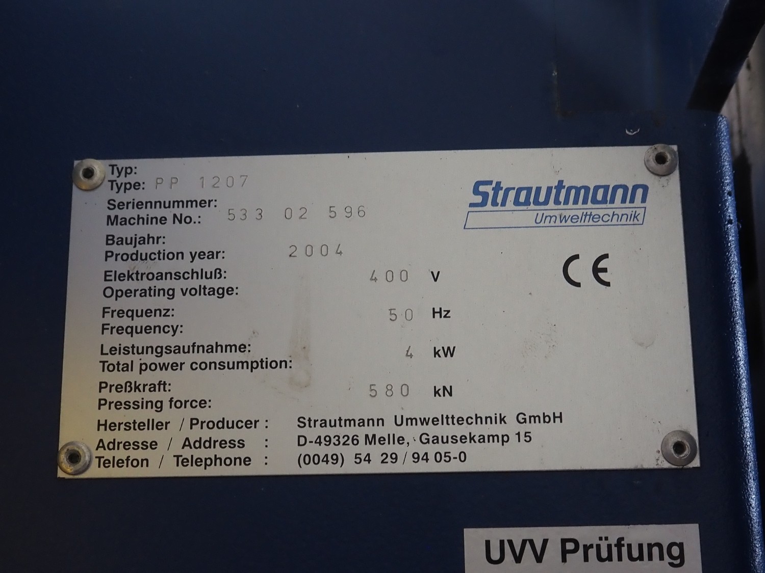Strautmann baler, type: PP 1207, serial number: 533 02 596, year of construction: 2004, 400 V, 50 Hz, 4 kW, 580 kN, inside dimensions: 1190 mm x 680 mm x 1400 mm, total dimensions: 2400 mm x 1600 mm x 3100 mm.
