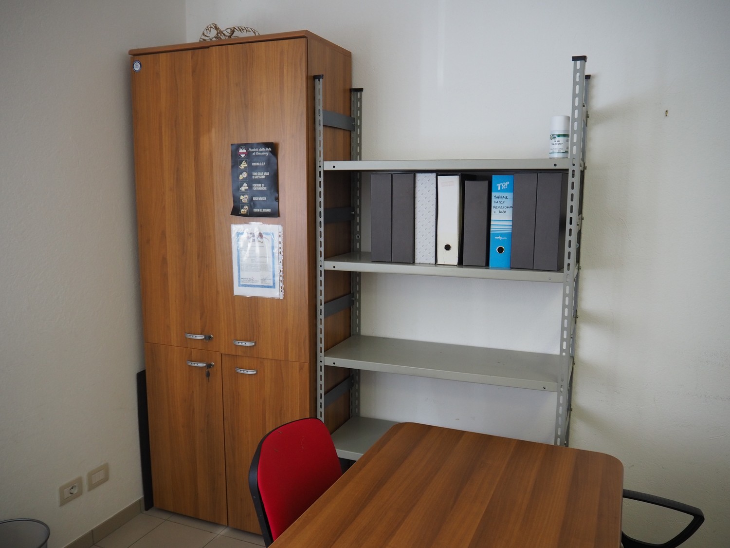 Office inventory consisting of 2 desks, dimensions: 1650 mm x 1800 mm x 650 mm, 750 mm x 1250 mm x 730 mm, 4 cabinets, dimensions: 600 mm x 620 mm x 840 mm, 600 mm x 800 mm x 840 mm, 470 mm x 870 mm x 1350 mm, 480 mm x 860 mm x 2160 mm, 2 racks, dimensions: 500 mm x 1700 mm x 1950 mm, 400 mm x 1000 mm x 1950 mm and 3 chairs.