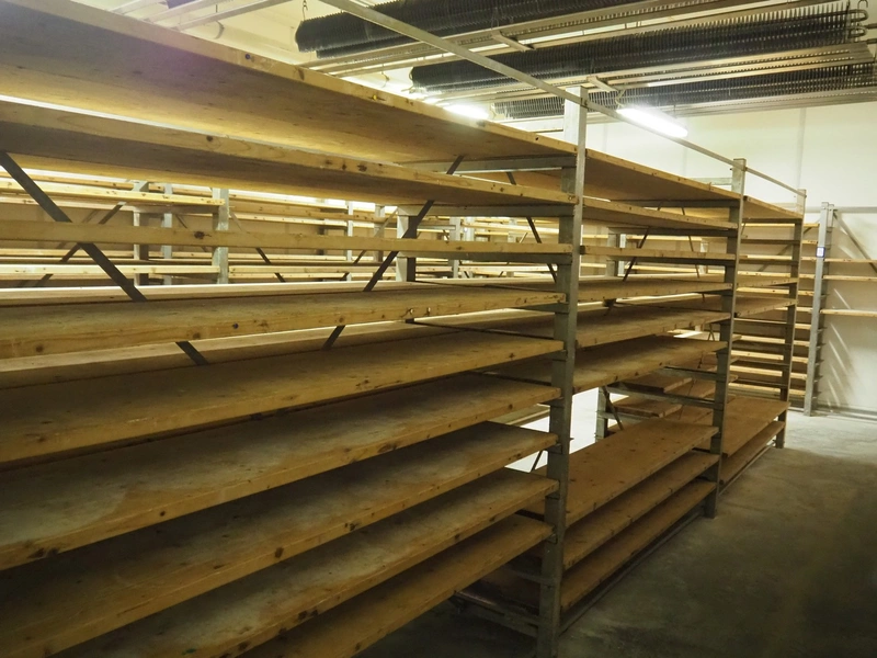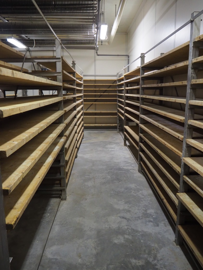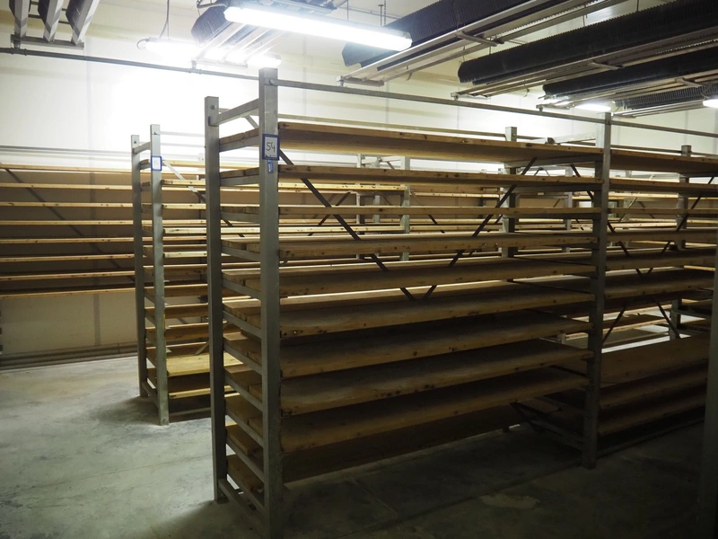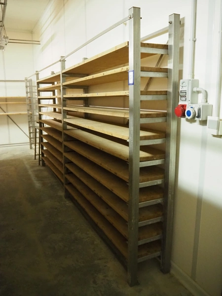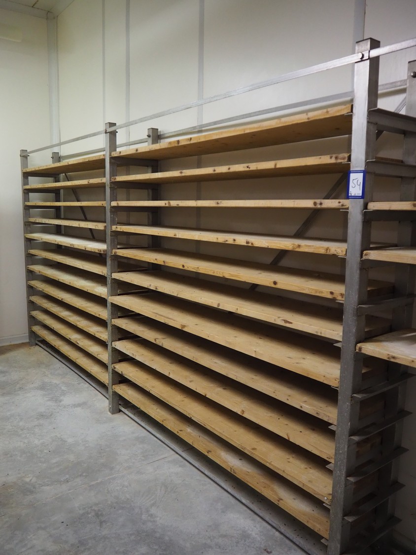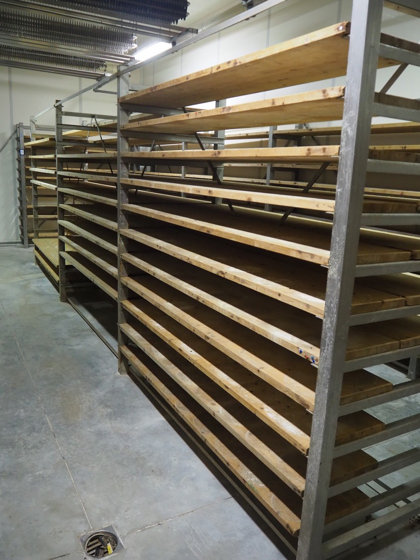 7 s/s modular racks with wooden cheese boards, 11 floors, dimensions cheese boards: 2000 mm x 400 mm, dimensions racks: (2x) 6250 mm x 400 mm x 2140 mm, (2x) 6250 mm x 810 mm x 2140 mm, 8300 mm x 400 mm x 2140 mm, (2x) 2170 mm x 400 mm x 2140 mm.