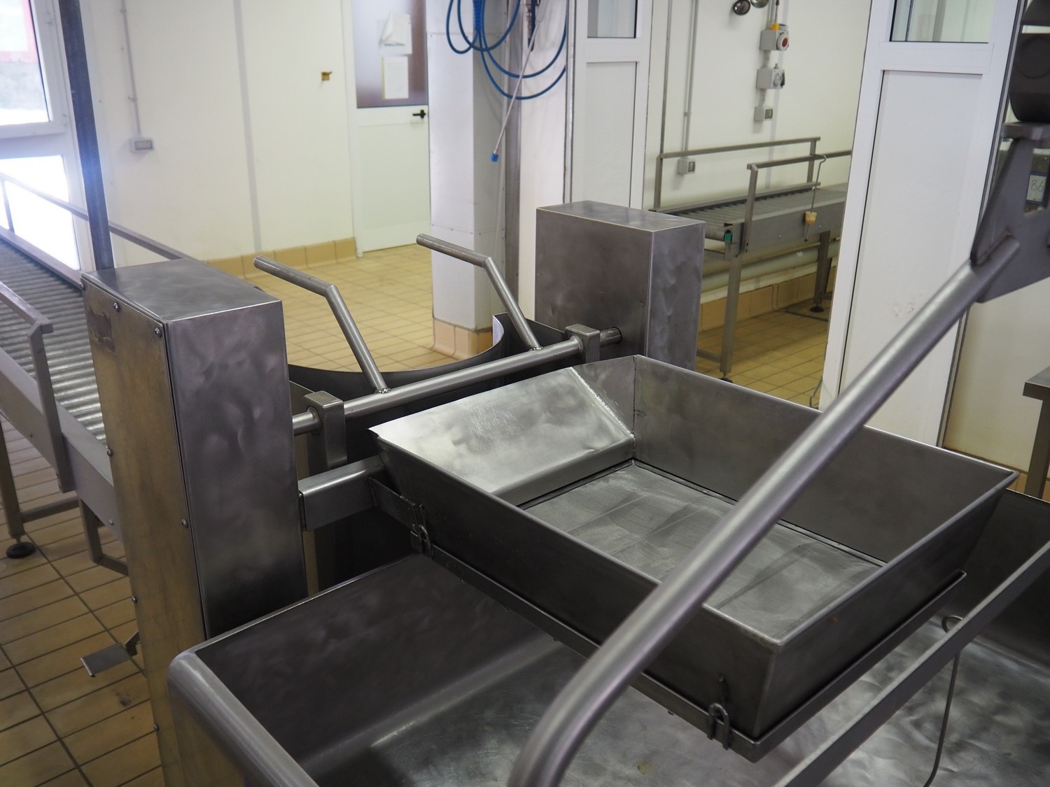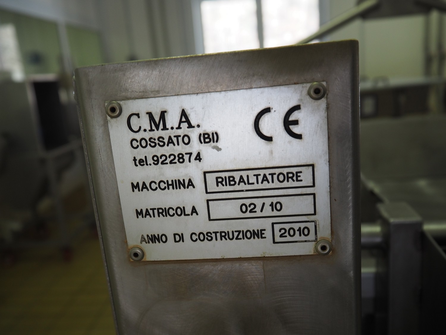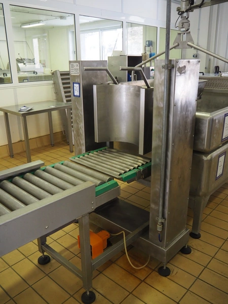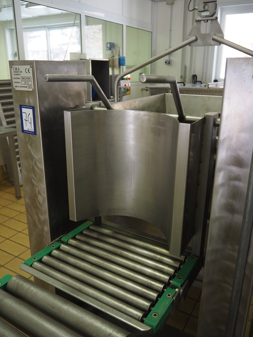 C.M.A. bottle tilting machine with infeed roller conveyor and outfeed sieve, serial number: 02/10, year of construction: 2010, s/s rollers, roller width: 400 mm, diameter lifter: 370 mm, total dimensions: 5500 mm x 900 mm x 1330 mm.