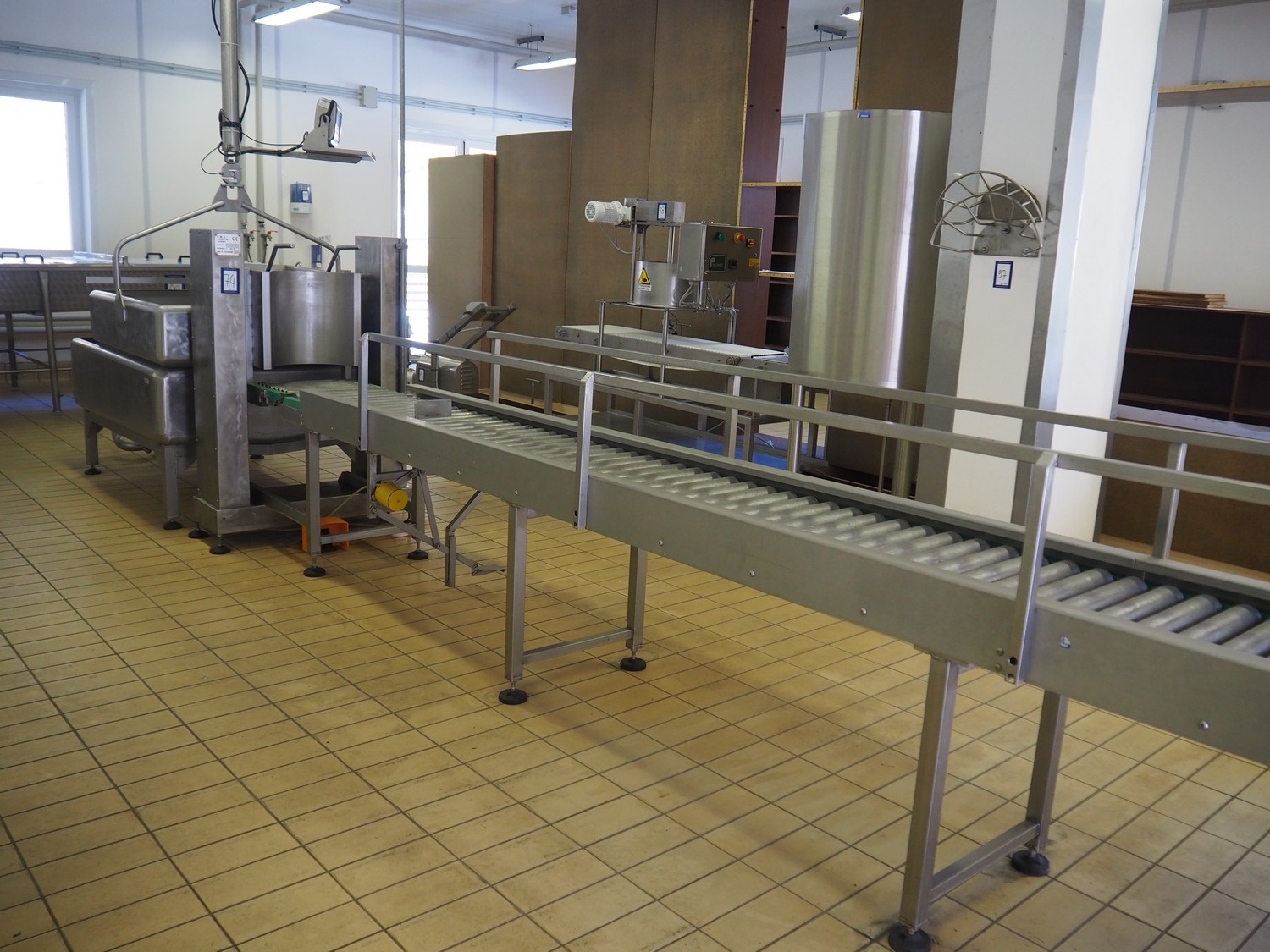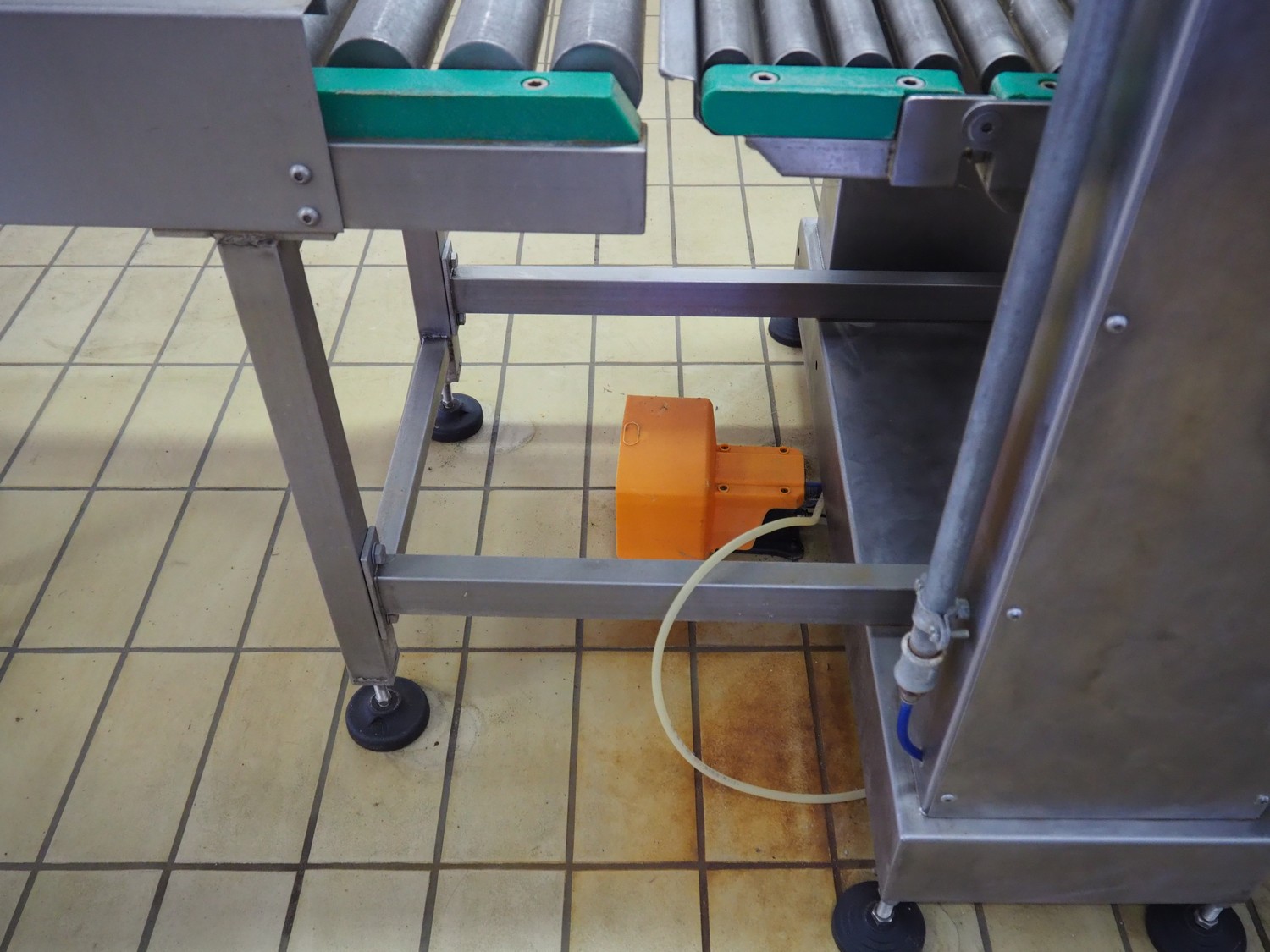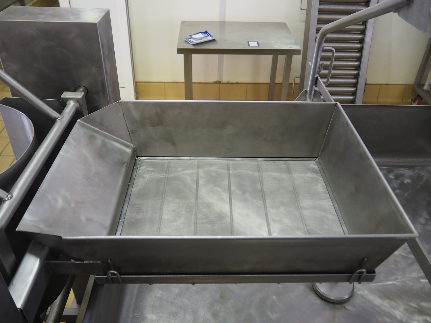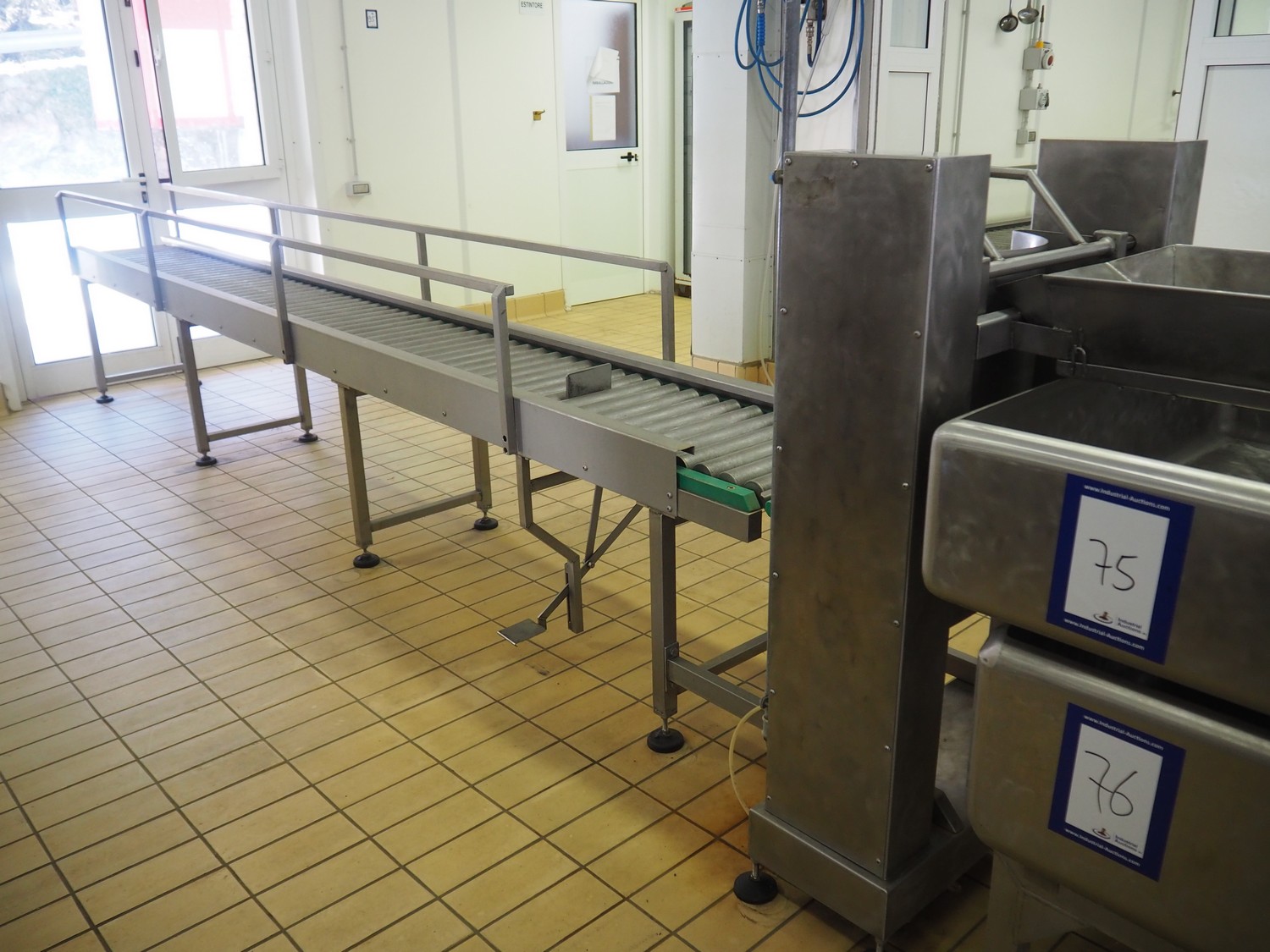 C.M.A. bottle tilting machine with infeed roller conveyor and outfeed sieve, serial number: 02/10, year of construction: 2010, s/s rollers, roller width: 400 mm, diameter lifter: 370 mm, total dimensions: 5500 mm x 900 mm x 1330 mm.