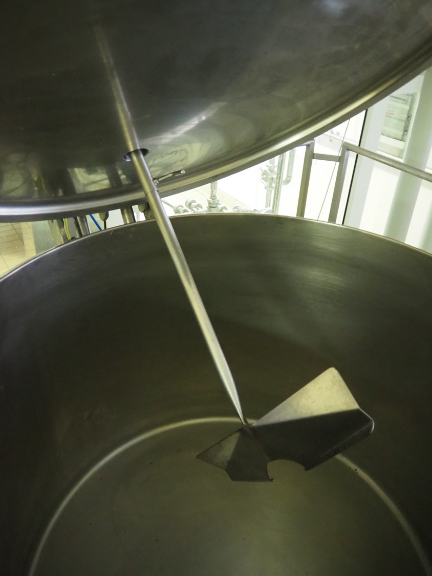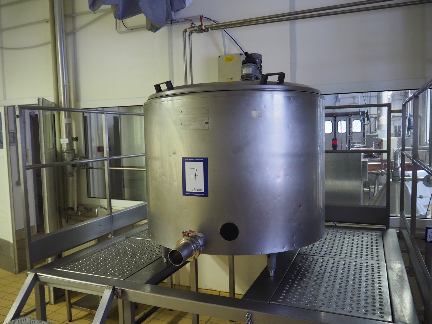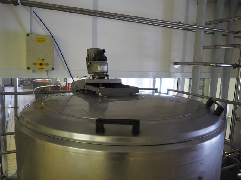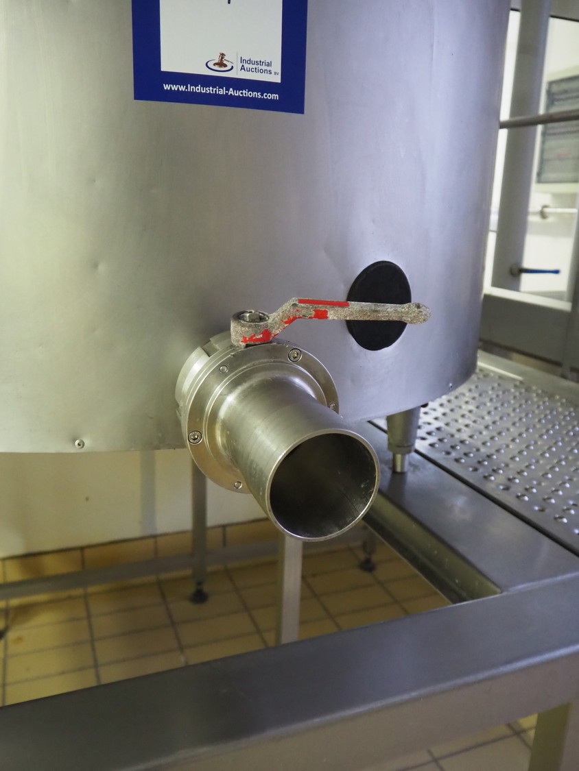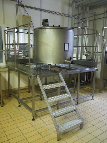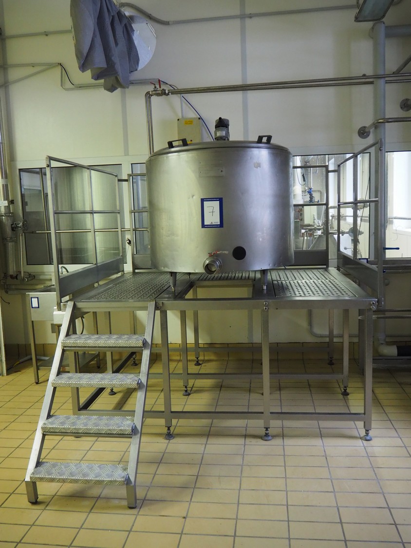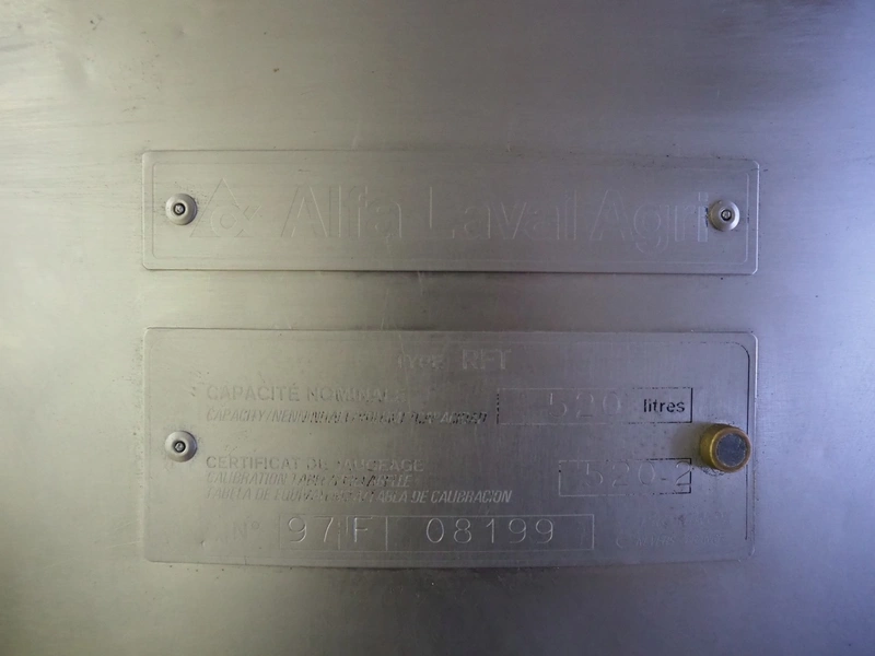 Alfa Laval Agri s/s double jacketed tank on s/s platform, serial number: 97F 08199, volume: 520 litres, dimensions: 2400 mm x 2100 mm x 2250 mm.