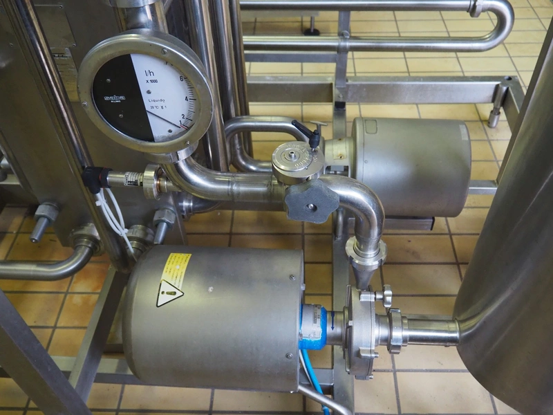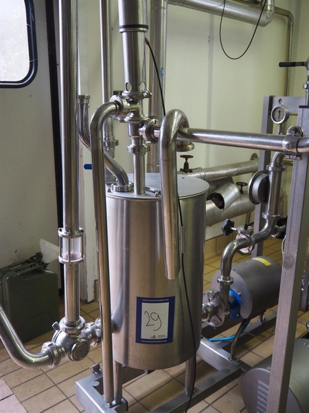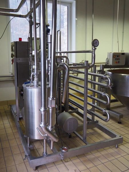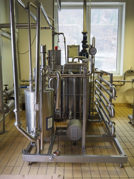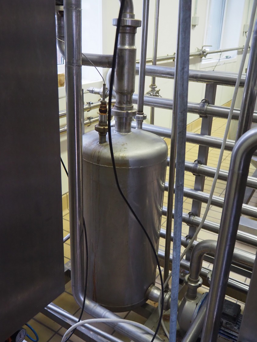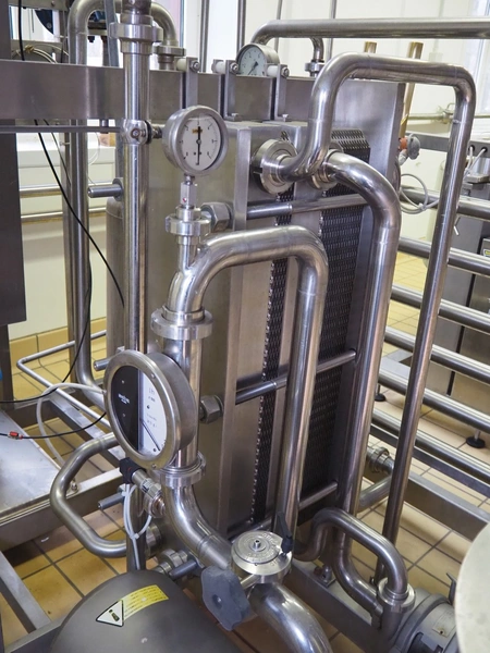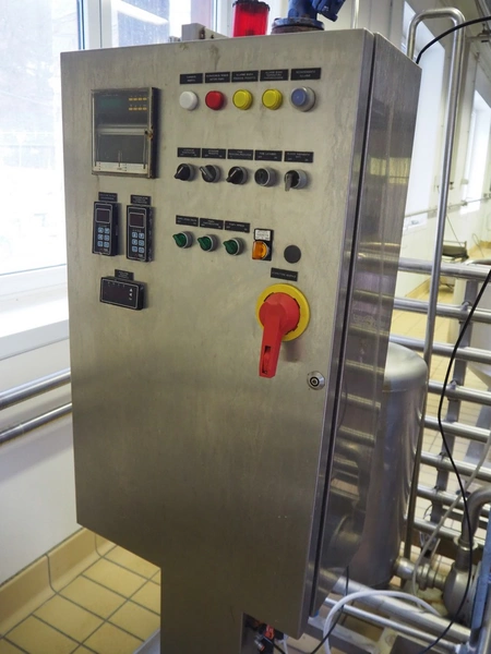 Pasteurisation unit with Frautech s/s heat exchanger, 3 centrifugal pumps, balance tank and pressure vessel, dimensions: 2550 mm x 1500 mm x 1900 mm.