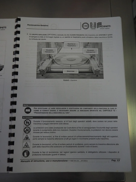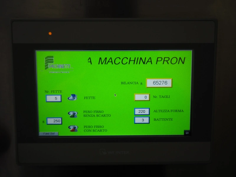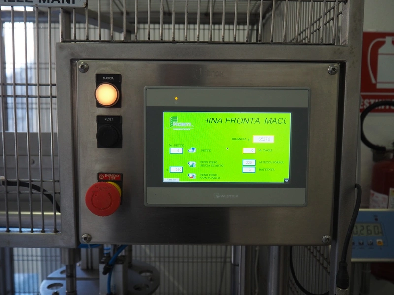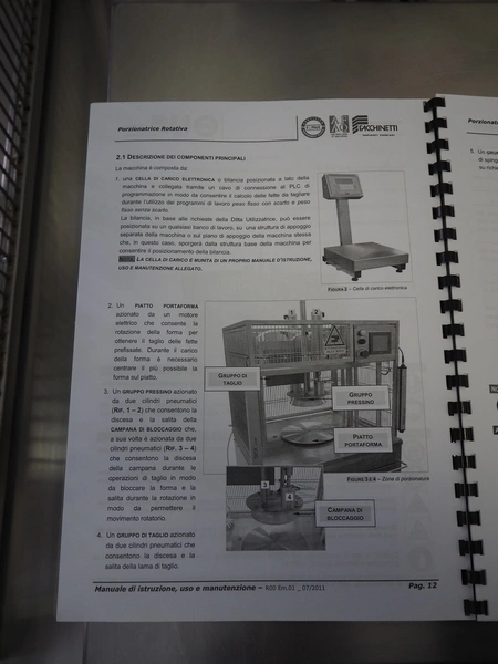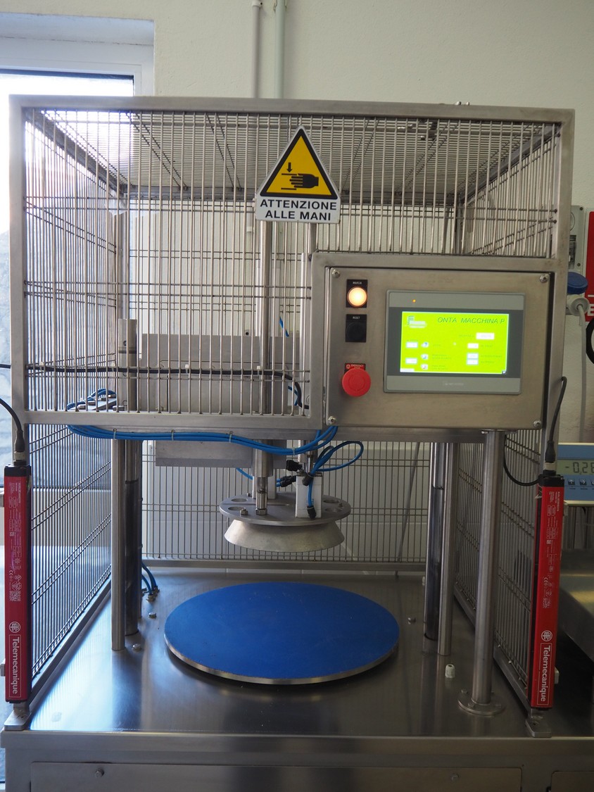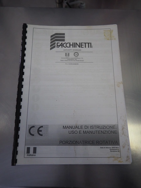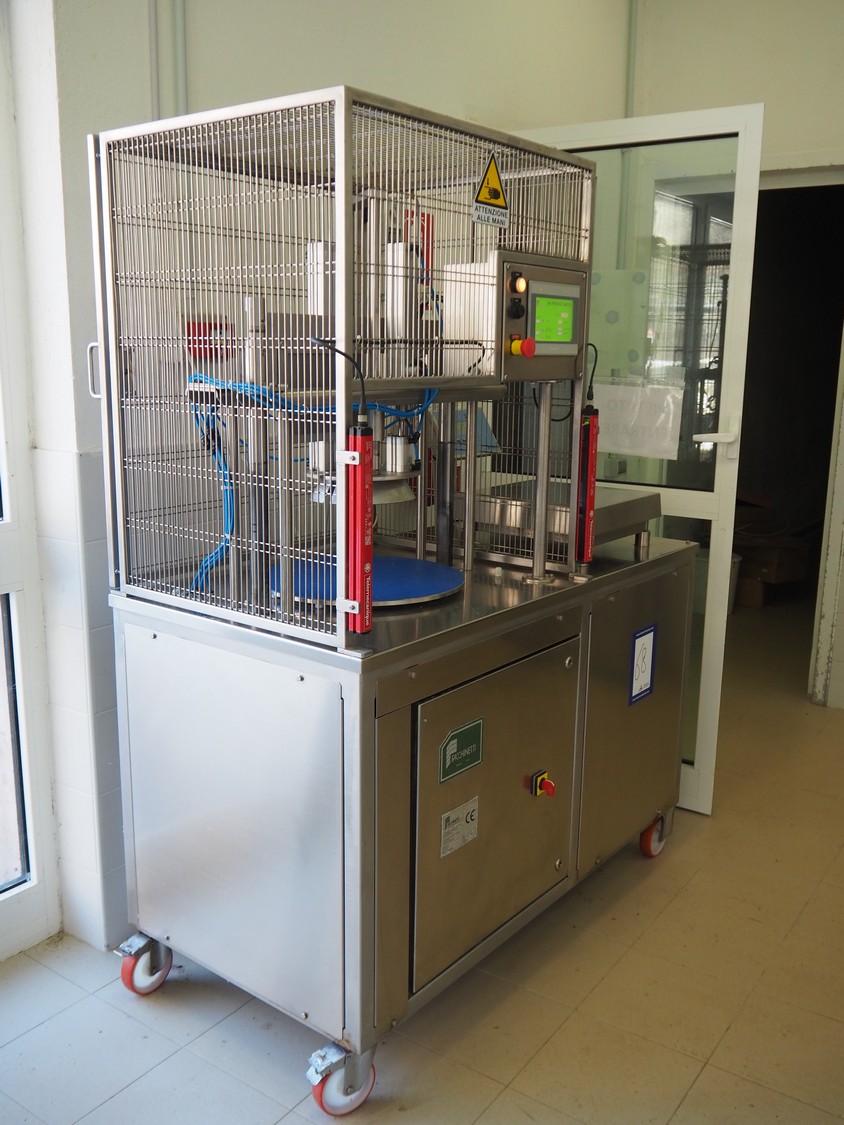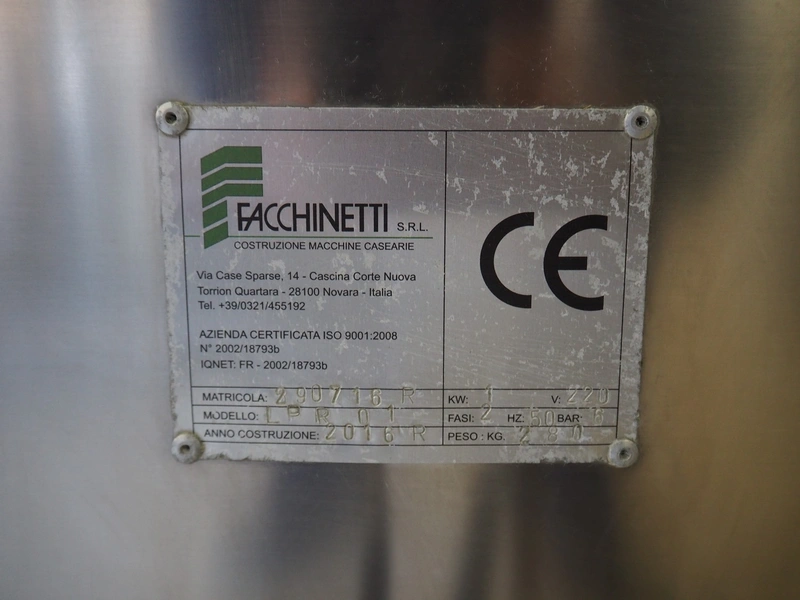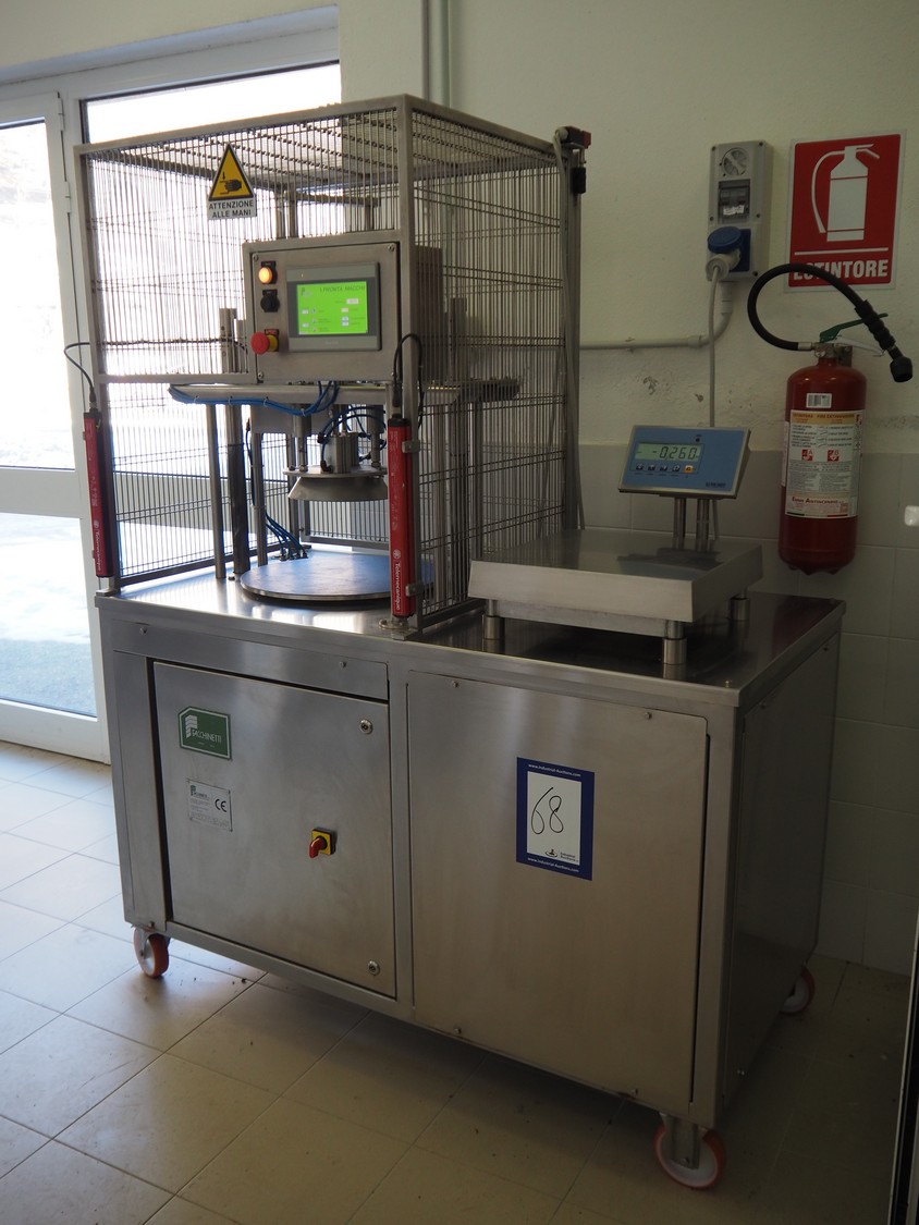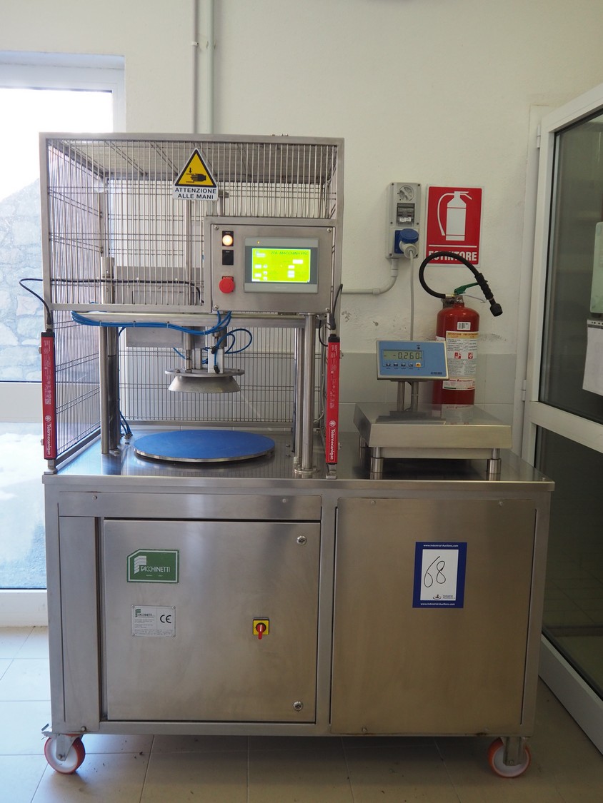 Facchinetti s.r.l. mobile programmable cheese portioning machine, model: LPR01, serial number: 290716R, year of construction: 2016R, 220 V, 2 Ph, 50 Hz, 1 kW, weight: 280 kg, 3 moulds, diameter moulds: 230 mm, 330 mm, 400 mm, capacity: 45 pcs/min, Dini Argeo weighing scale, total dimensions: 700 mm x 1400 mm x 1850 mm.