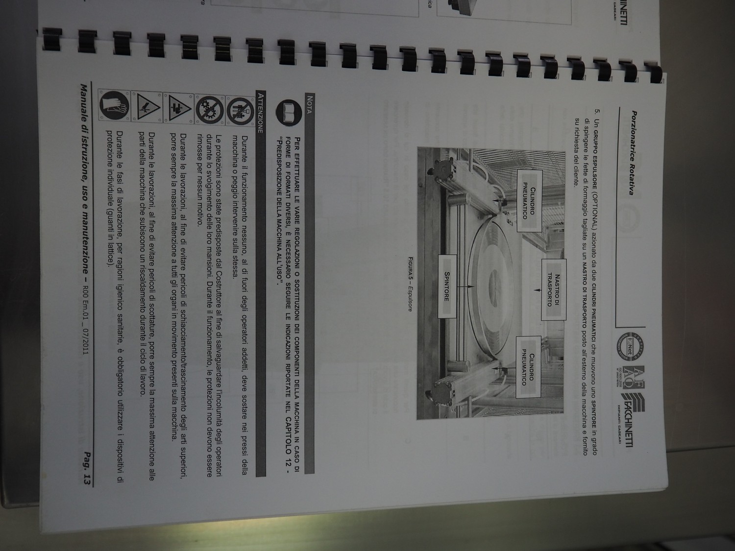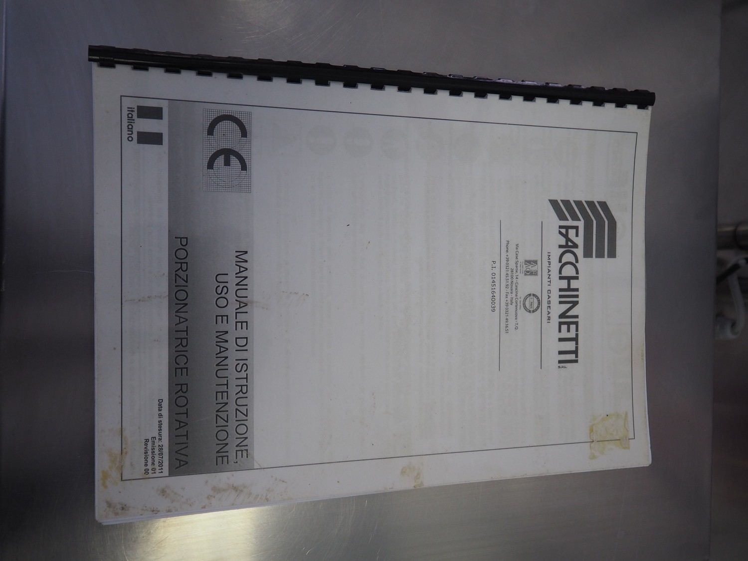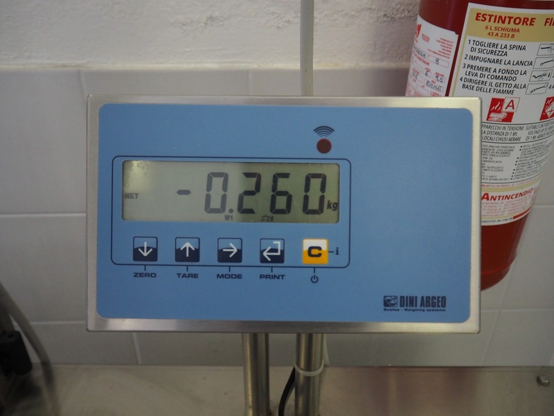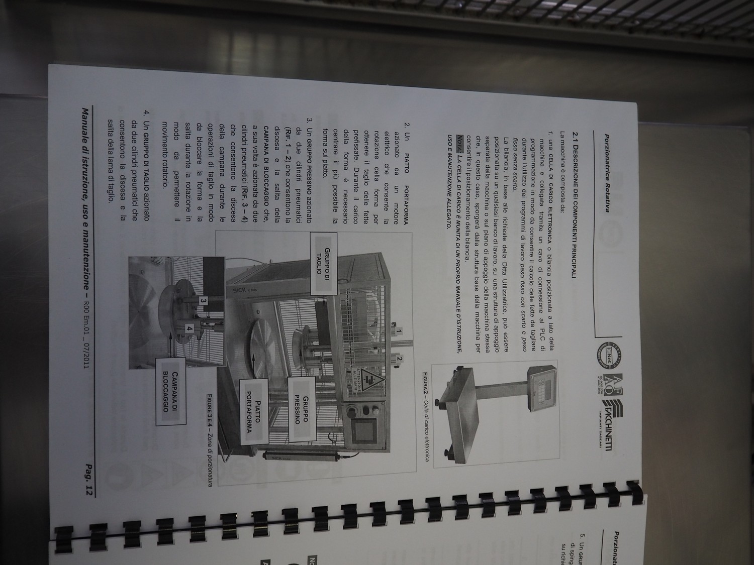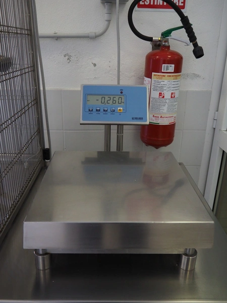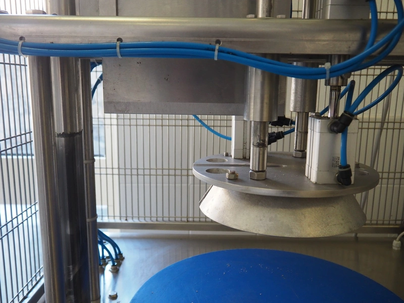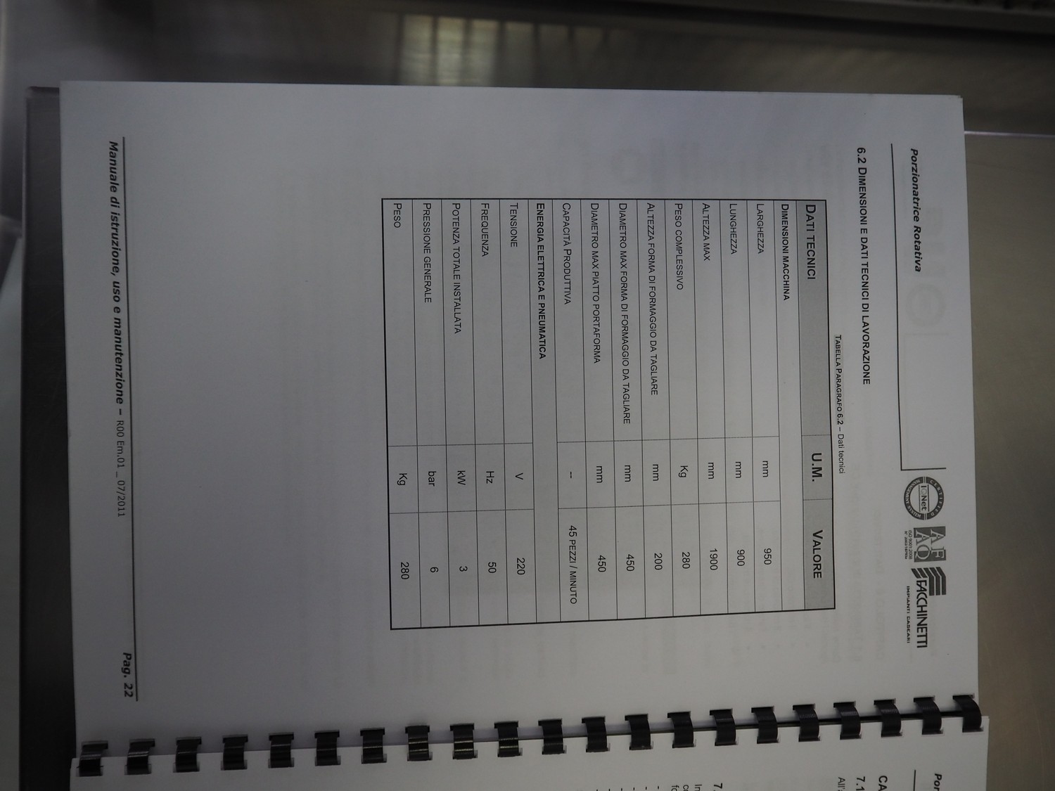 Facchinetti s.r.l. mobile programmable cheese portioning machine, model: LPR01, serial number: 290716R, year of construction: 2016R, 220 V, 2 Ph, 50 Hz, 1 kW, weight: 280 kg, 3 moulds, diameter moulds: 230 mm, 330 mm, 400 mm, capacity: 45 pcs/min, Dini Argeo weighing scale, total dimensions: 700 mm x 1400 mm x 1850 mm.