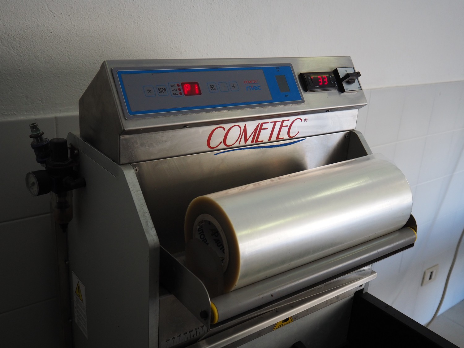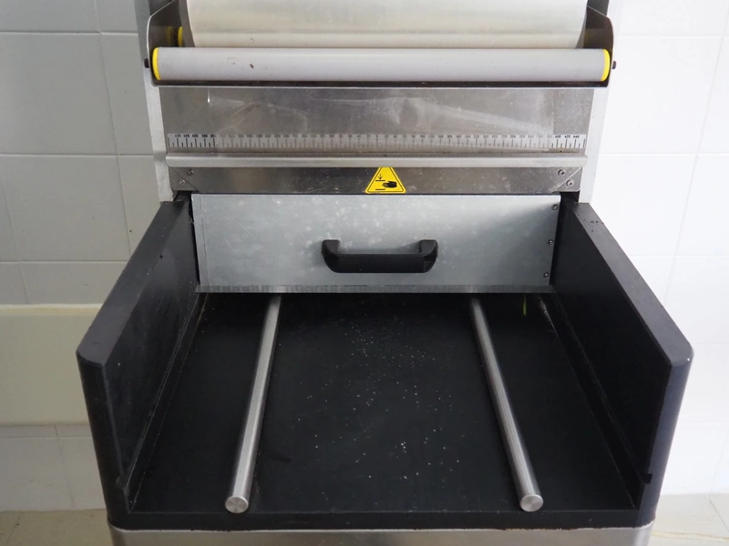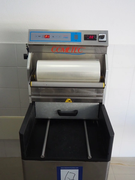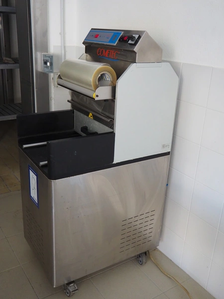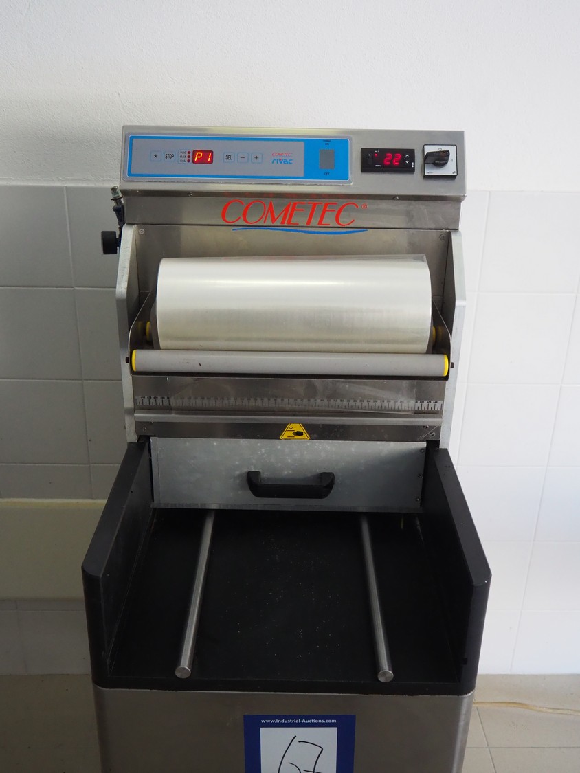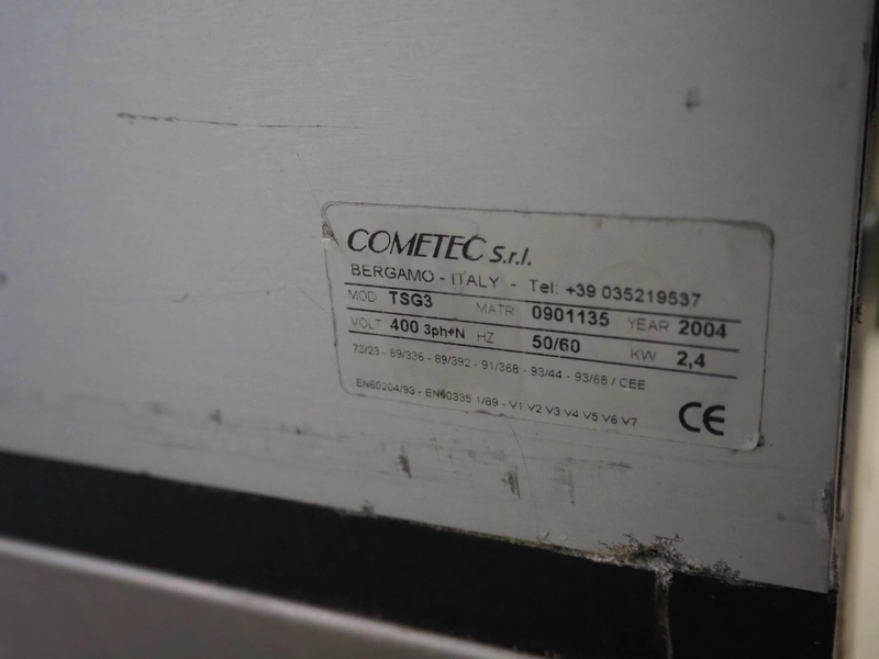 COMETEC S.r.l. mobile traysealer, model: TSG3, serial number: 0901135, year of construction: 2004, 400 V, 3 Ph, 50/60 Hz, 2.4 kW, film width: 360 mm, total dimensions: 750 mm x 550 mm x 1370 mm.