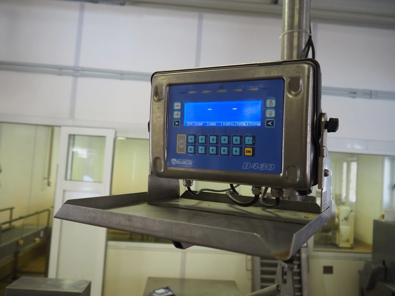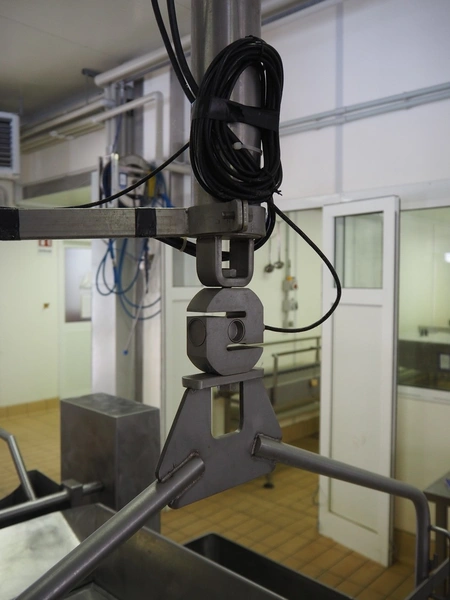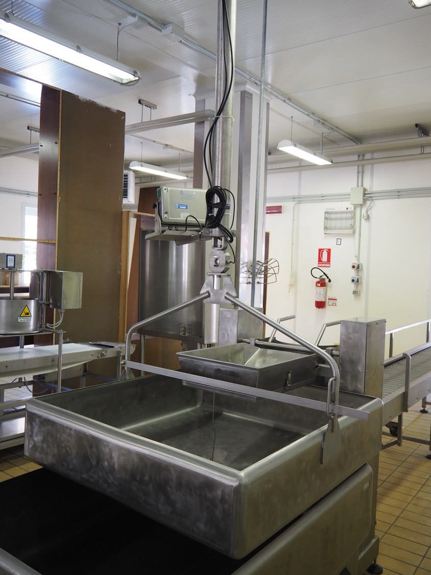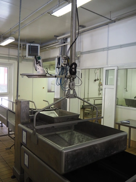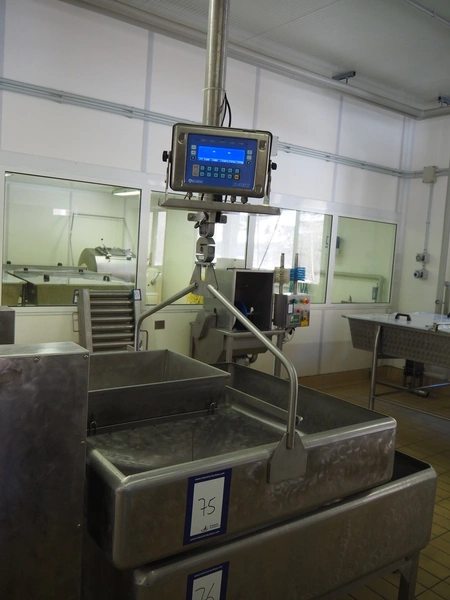 S/s tub on hanging weighing scale, Bilanciai indicator, model: D430, serial number: 194758, year of construction: 2011, weighing range: 4 kg - 600 kg, inside dimensions tub: 1050 mm x 1100 mm x 250 mm, total dimensions: 1050 mm x 1100 mm x 1100 mm.