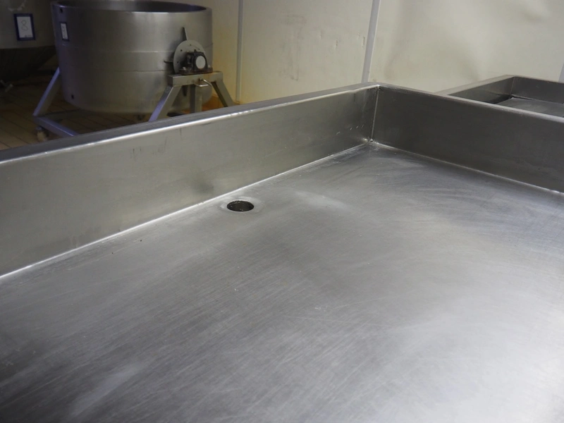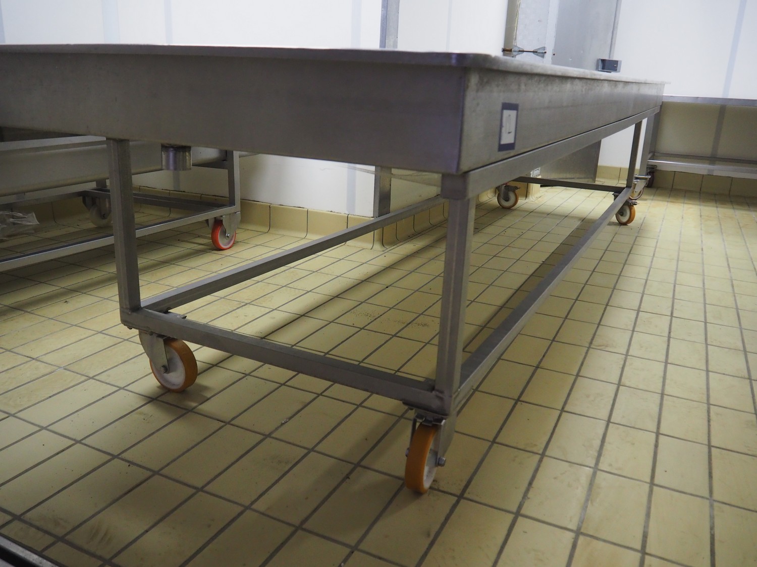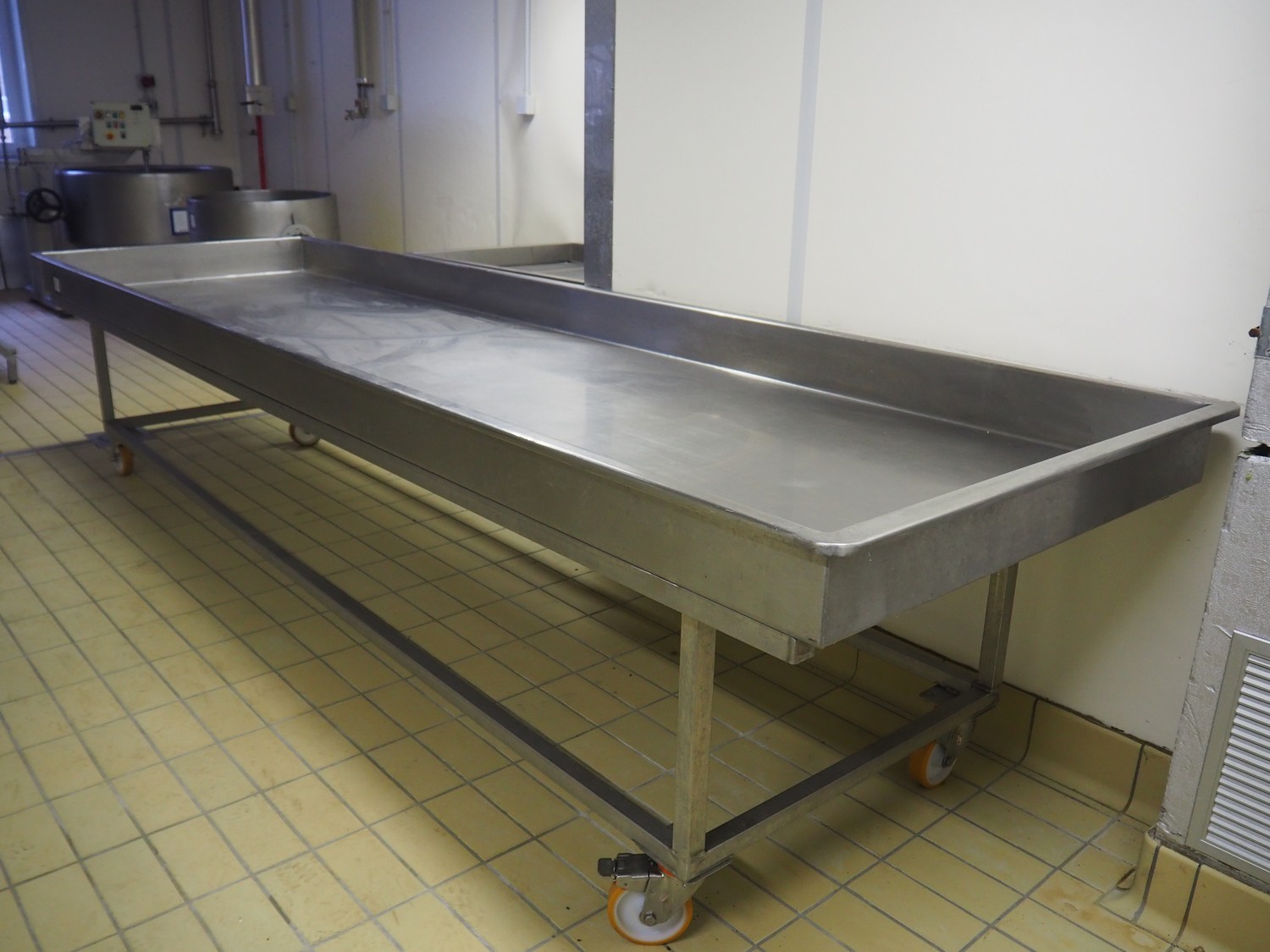 Mobile s/s tub, inside dimensions: 4050 mm x 1100 mm x 150 mm, total dimensions: 4150 mm x 1200 mm x 900 mm.