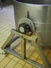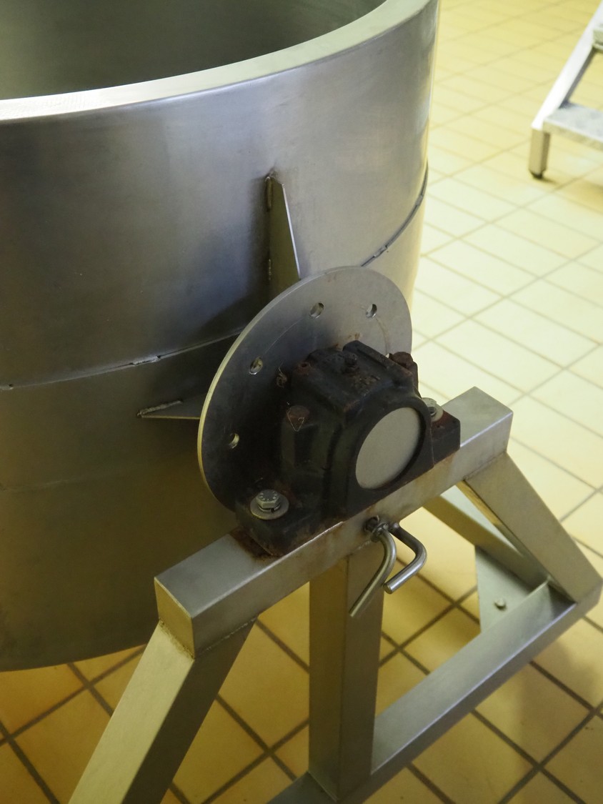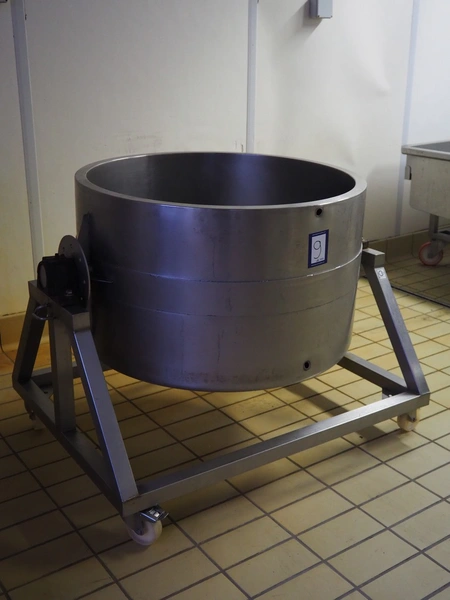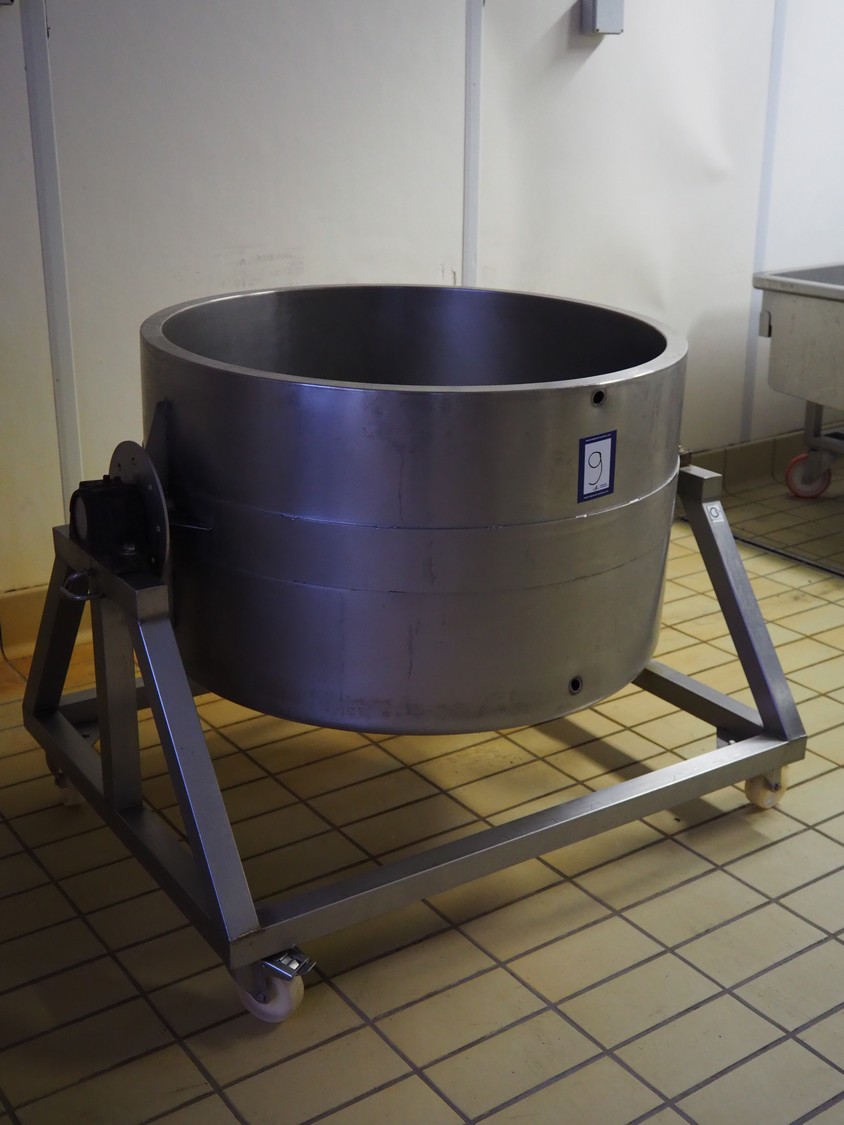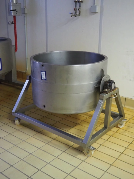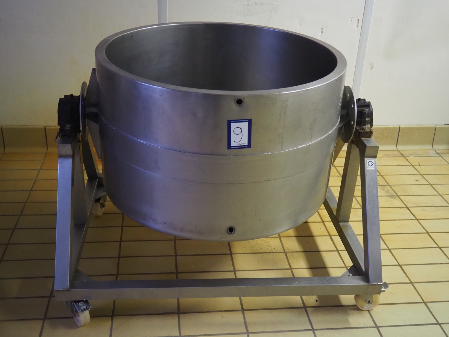 Mobile s/s double jacketed tank, inside dimensions: ø 860 mm x 520 mm, total dimensions: 950 mm x 1200 mm x 920 mm.