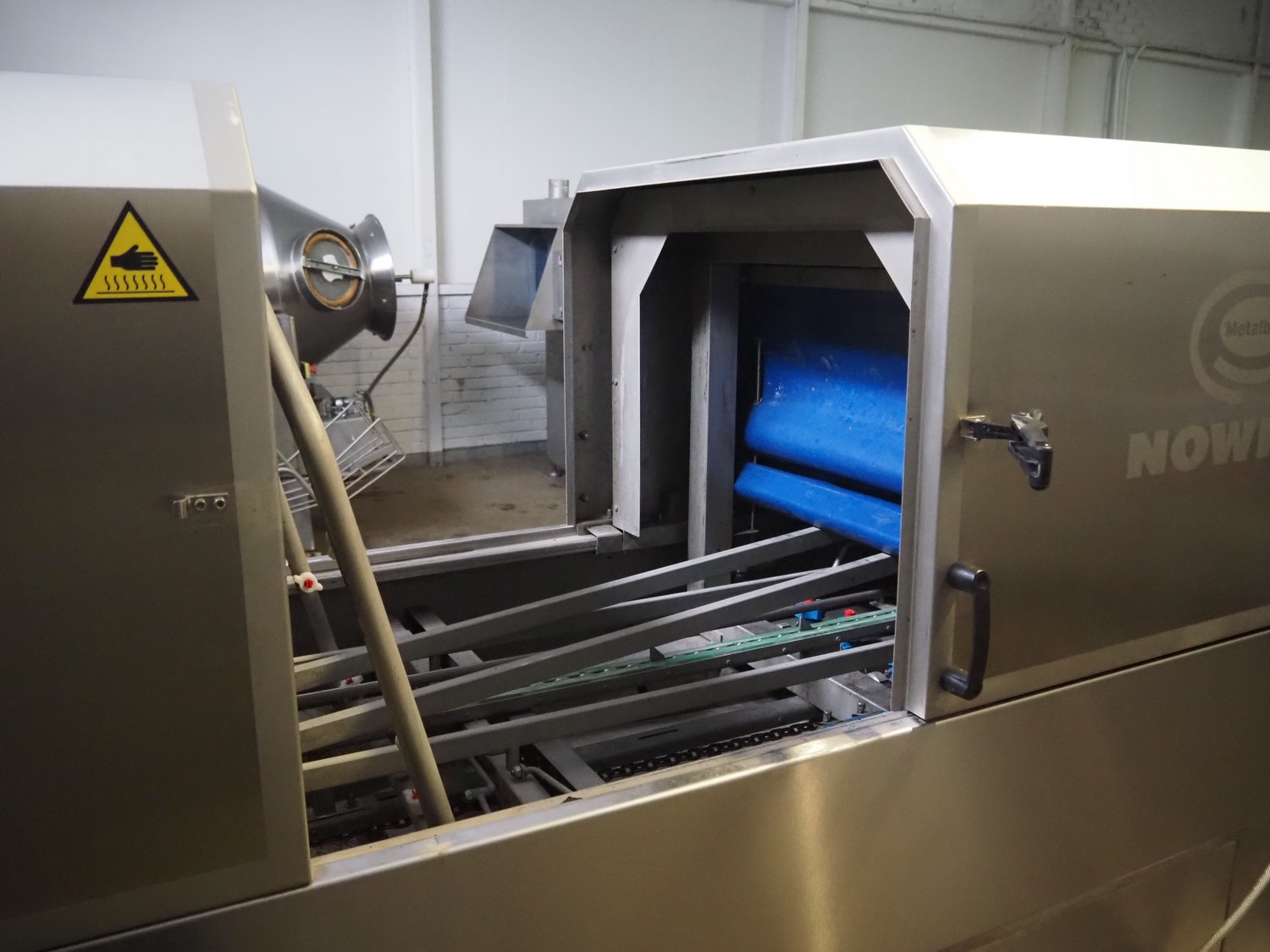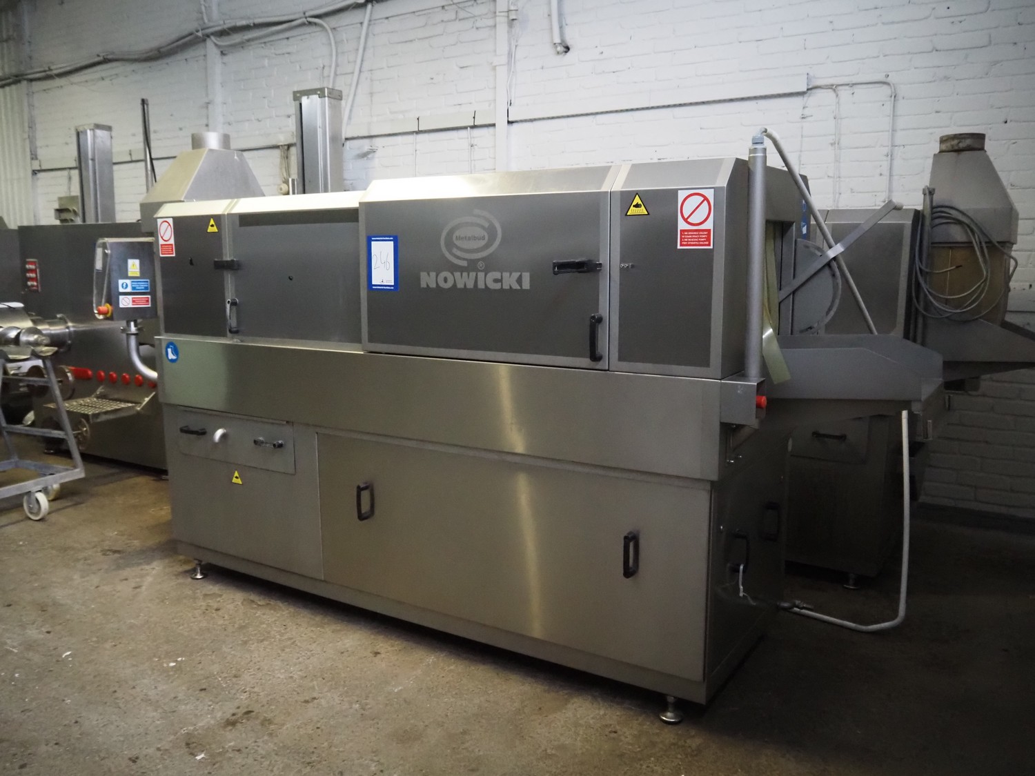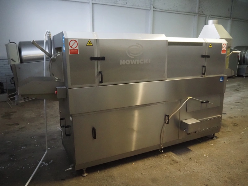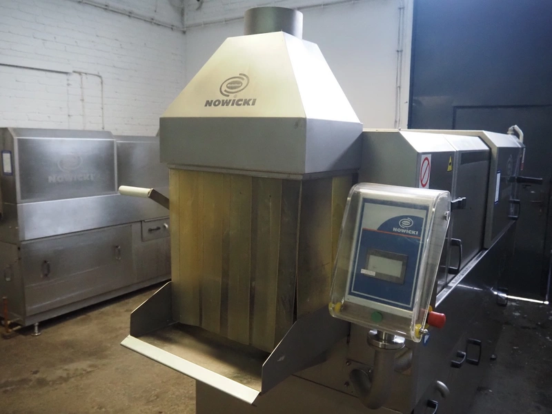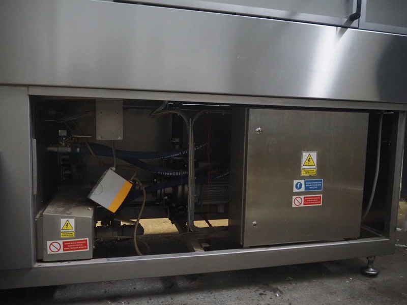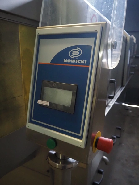 Nowicki crate washer, type: MP-300 W, number: 95810113, year of construction: 2010, 400 V, 3 Ph, 50 Hz, 12 A, 6 kW, weight: 600 kg, clearance: 480 mm x 200 mm, total dimensions: 3700 mm x 1100 mm x 2100 mm. Including s/s frame, dimensions: 2300 mm x 550 mm x 1000 mm.