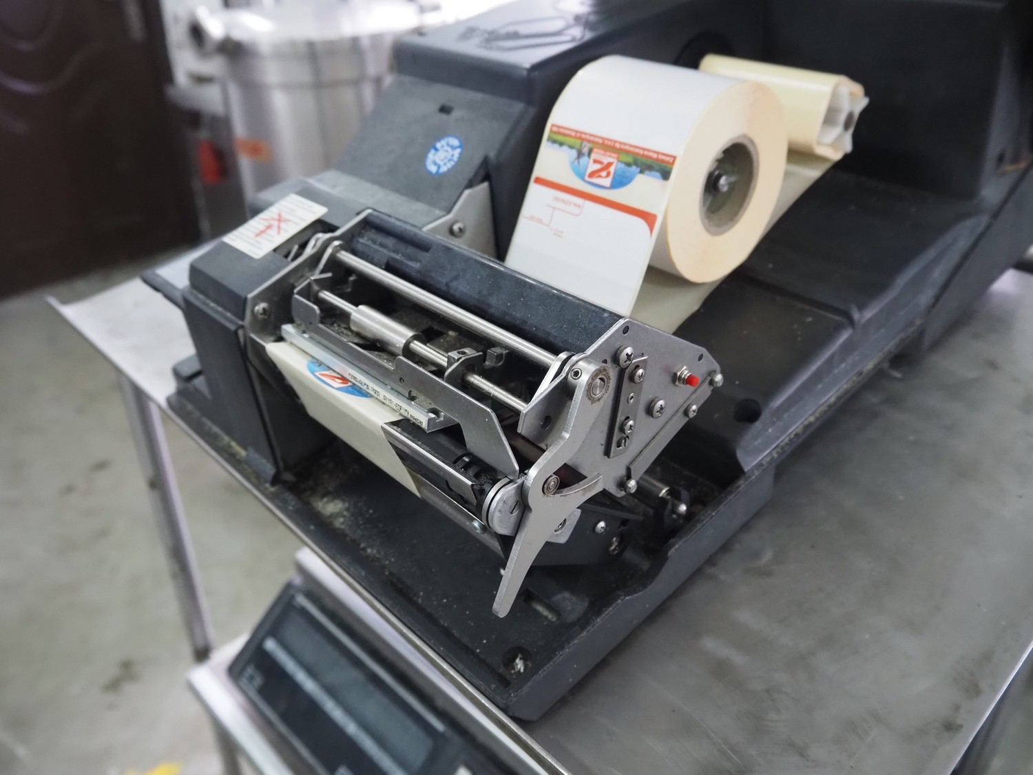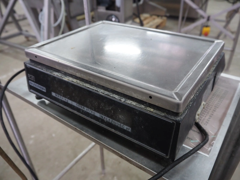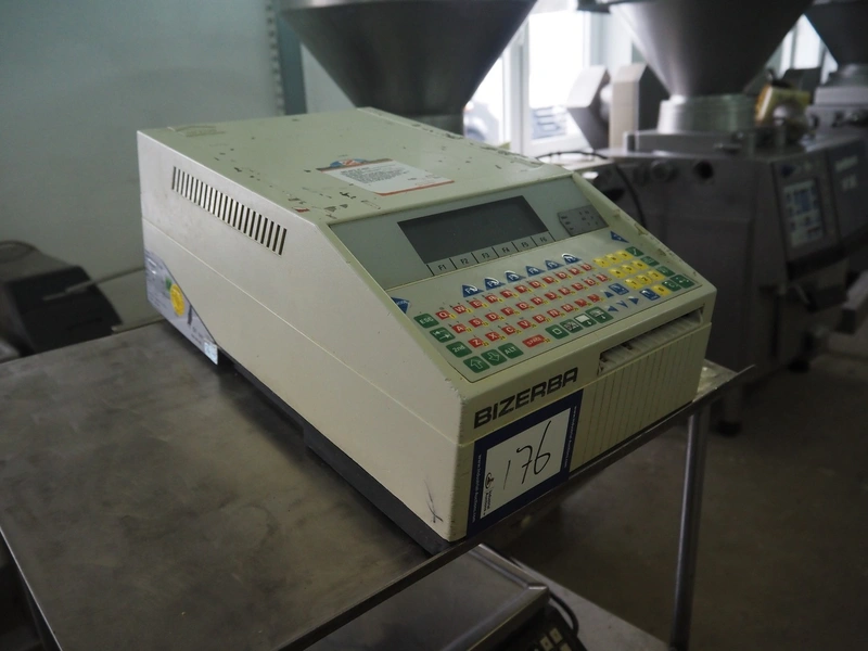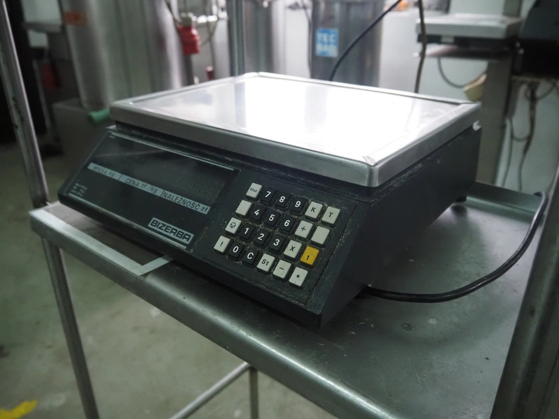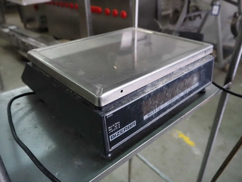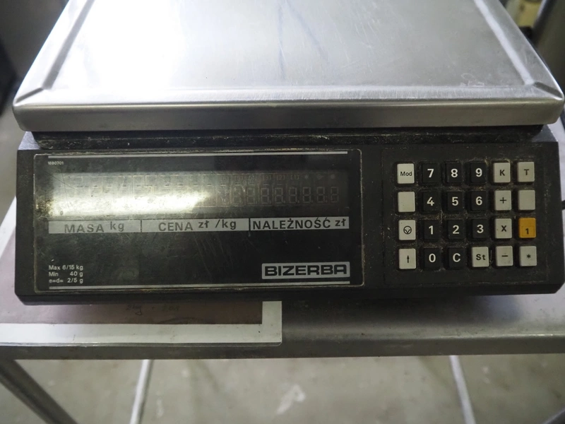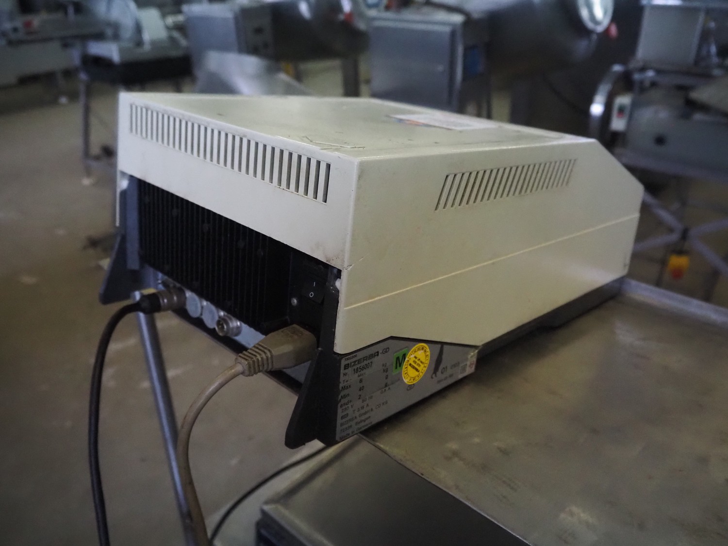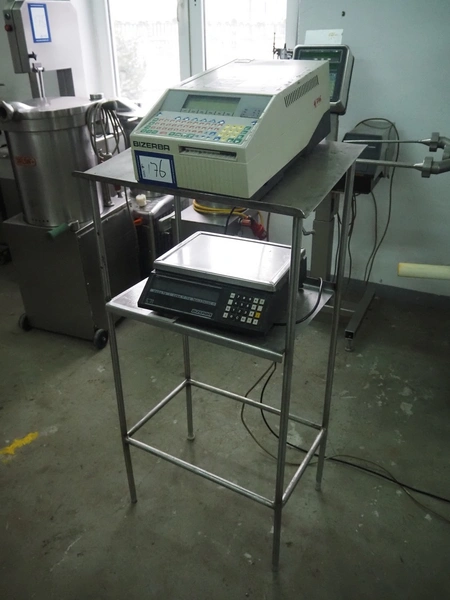 S/s frame with Bizerba weighing scale and label printer, scale type: EW 100, number: 1509907, 220 V, 50 Hz, maximum capacity: 6/15 kg, minimum capacity: 40 g, e=d= 2/5 g, scale dimensions: 340 mm x 260 mm, type label printer: GD, number: 1856007, 230 V, 50 Hz, 0.6 A, total dimensions: 600 mm x 500 mm x 1400 mm.